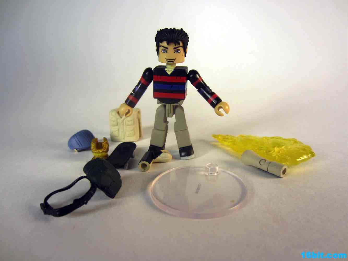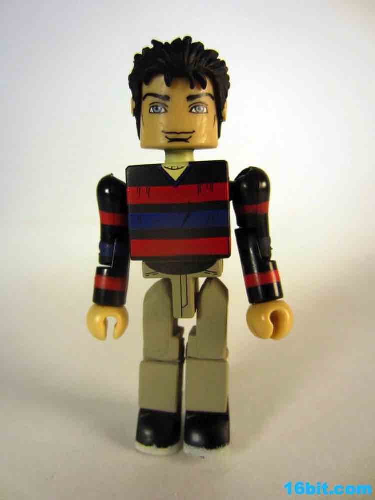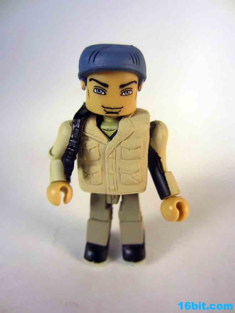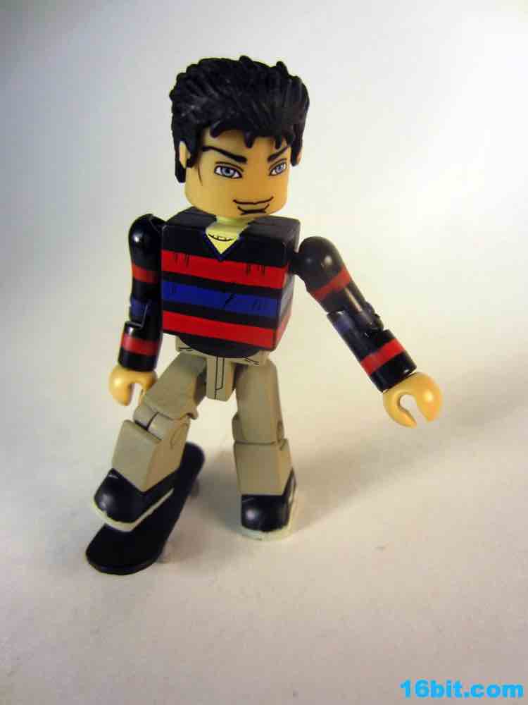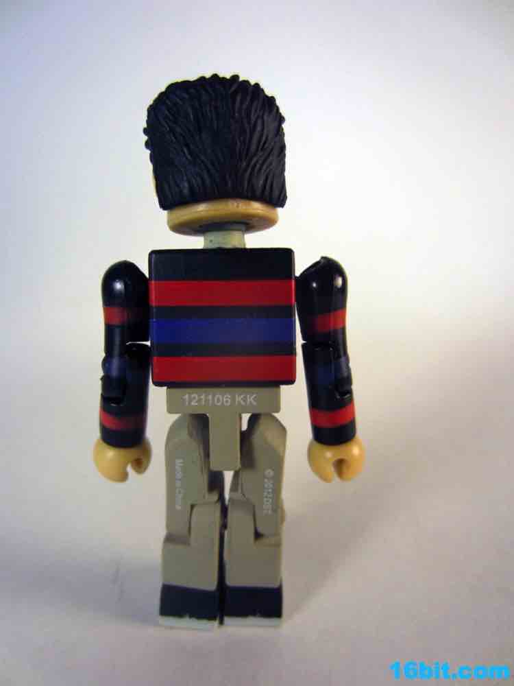 Quality control is a big deal here, and the more things you try to do, the more opportunities you have for things to not work There are many paint applications, but my sample has a few big "dents" on the left hand which make it look slightly older. If you turn the head (a cleverly-designed "hat" for a Minimates head) it will come off pretty easily. The body keeps splitting apart at the waist joint, and the lower clothing and upper clothing don't mesh together too well. If you twist him at the waist joint, he starts coming apart, exposing just how many pieces were used to create this figure. It's painfully obvious Diamond took their time and had a lot of people thinking this one out, but the figure isn't as stable as previous Minimates I've bought. The arms, hips, elbows, and knees move fairly freely on mine and the wrists swivel, although they do have a habit of popping off. (This is true of many other beasts in this first wave so far.) As such, I like it but I don't know that I'll be giving him a lot of time outside the toy shelves.