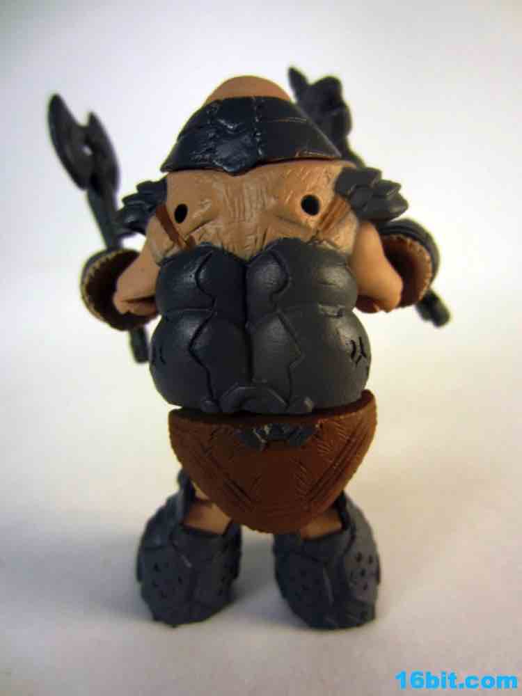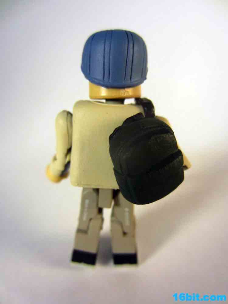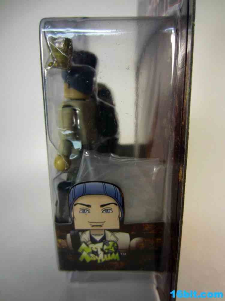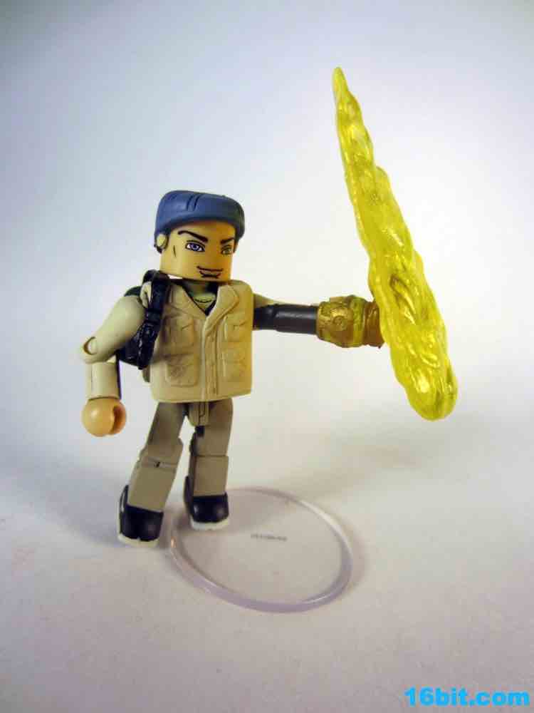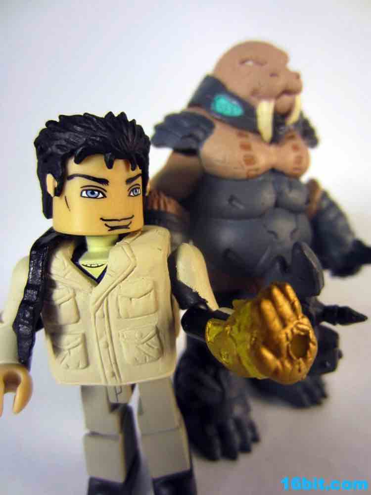 Quality control is a big deal here, and the more things you try to do, the more opportunities you have for things to not work There are many paint applications, but my sample has a few big "dents" on the left hand which make it look slightly older. If you turn the head (a cleverly-designed "hat" for a Minimates head) it will come off pretty easily. The body keeps splitting apart at the waist joint, and the lower clothing and upper clothing don't mesh together too well. If you twist him at the waist joint, he starts coming apart, exposing just how many pieces were used to create this figure. It's painfully obvious Diamond took their time and had a lot of people thinking this one out, but the figure isn't as stable as previous Minimates I've bought. The arms, hips, elbows, and knees move fairly freely on mine and the wrists swivel, although they do have a habit of popping off. (This is true of many other beasts in this first wave so far.) As such, I like it but I don't know that I'll be giving him a lot of time outside the toy shelves.