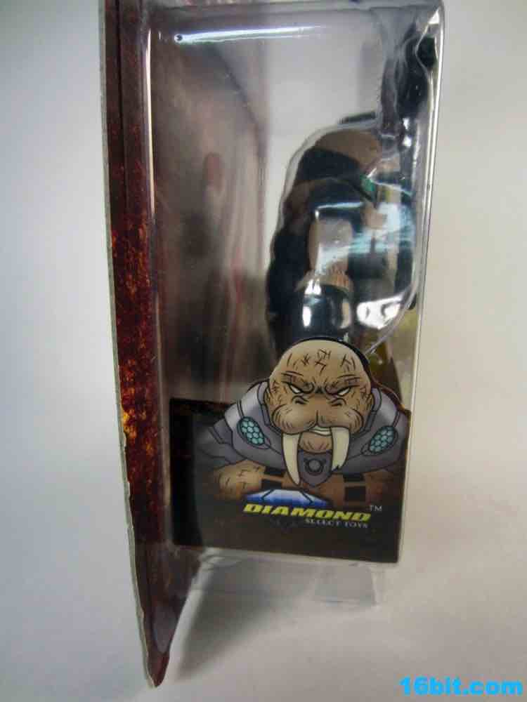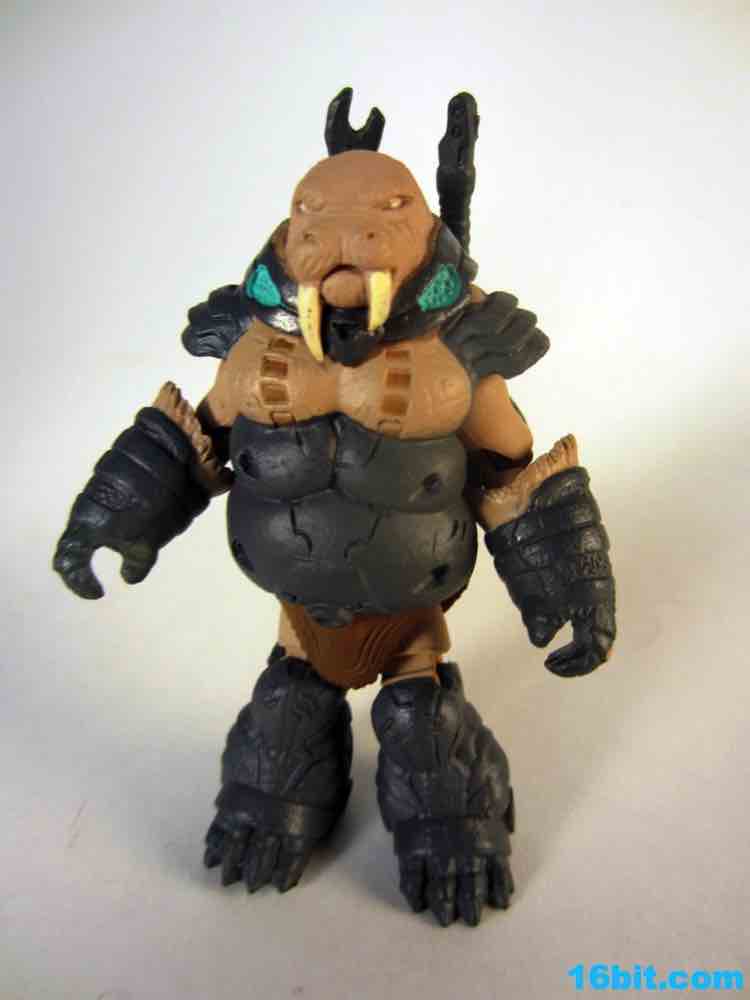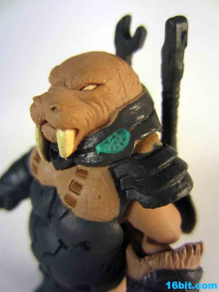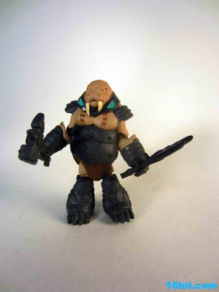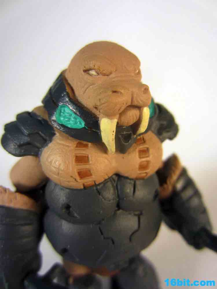 After having bought/tracked down/begged for the 4 Gators, 6 Vorins (including one at great expense), and a Zik, you can bet I was thrilled to see an updated Walrus. Who doesn't love a nice Walrus toy? Gruntos has a big beefy sculpt with tons of new parts, with arm, leg, foot, hand, and body pieces covering up the fact there's a Minimates body under there. Were it not for the visible elbow joints, you might not even realize it was under there. The head resembles the comic with a cracked tusk, old-school yellow eyes, a little scarring, and some generally cute walrus wrinkle detailing. There's even a painted walrus torso under the armor with tattoos! The flesh color of the figure is painted-over flesh plastic, which gives the figure a different texture and a more expensive feel. (And I'm sure it cost Diamond a little more.)
