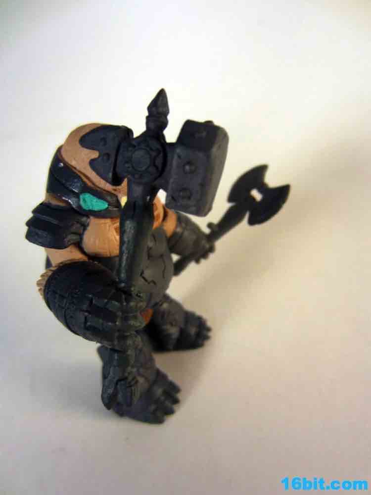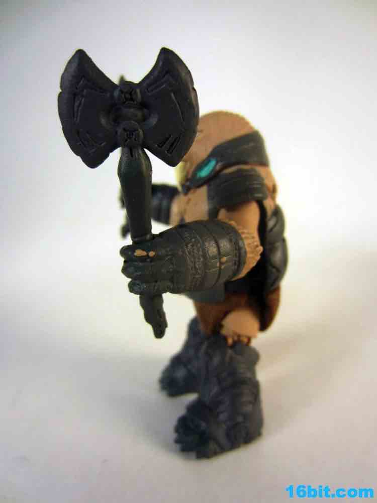 The armor is both futuristic and a throwback to barbarians, with gloves and boots plus what must be the intergalactic equivalent of a loincloth. The designers even put holes in the figure's back so he can stow his weapons, and the fists are big enough so that they have no problems gripping the exquisitely detailed big axe and hammer. A customizer, with a little paint, could make them truly sing. So as far as the figure looks, untouched, he's really nice.