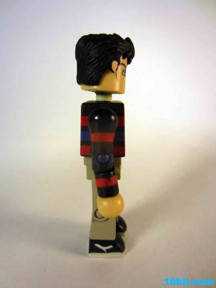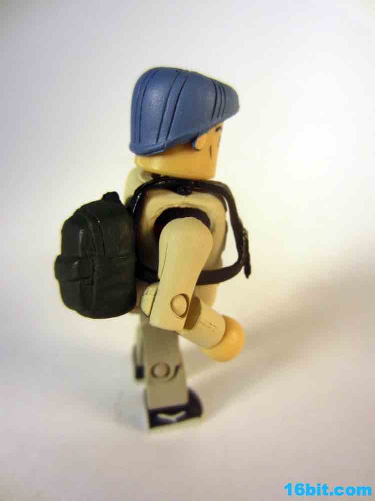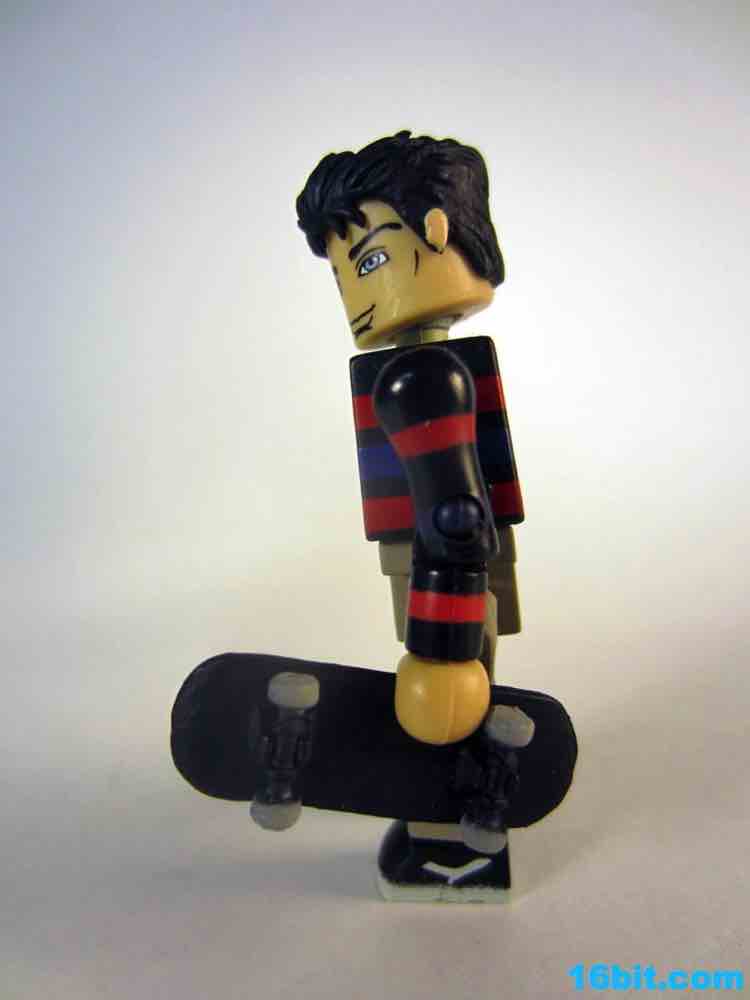 He falls short with his accessory interaction. For example, the feet are painted and the paint makes the foot holes too tight to fit on the LEGO-sized stud on the skateboard or the display stand without a bit of force. Even then, it doesn't really feel like a good fit. The skateboard itself can be held in his hand (awesome) and has rolling wheels (impressive) but the wheels fall out if you so much as touch them (erg). The backpack can fit over one shoulder, plus there's a peg to fit into the jacket that's a tight fit, but if you can get it in there it's pretty stable. There's a lot going on here, and the designers did a great job, but the execution at the factory falls a little short as toy-ness goes.