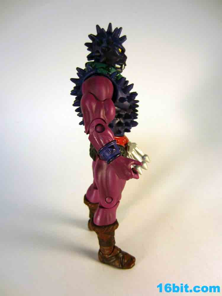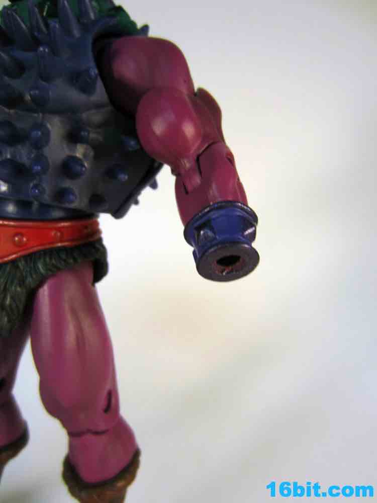 The head is nice and mean, expressive and purple. He has a sour expression and bright white fangs, plus yellow eyes which look really great. They did a great job replicating the old "hollow head" look with sturdier materials. To add some color to the outfit, metallic gold on the armor helps the outfit "pop" a bit. Other than that, the figure is built off a more or less standard MOTUC buck with unique bracelets.