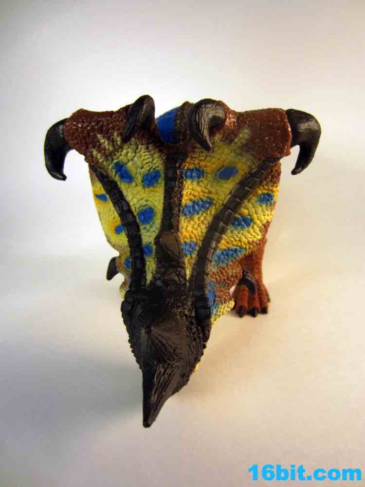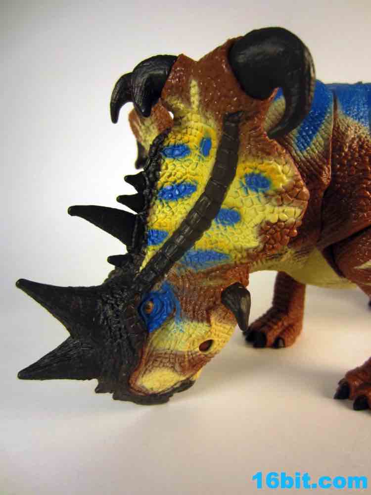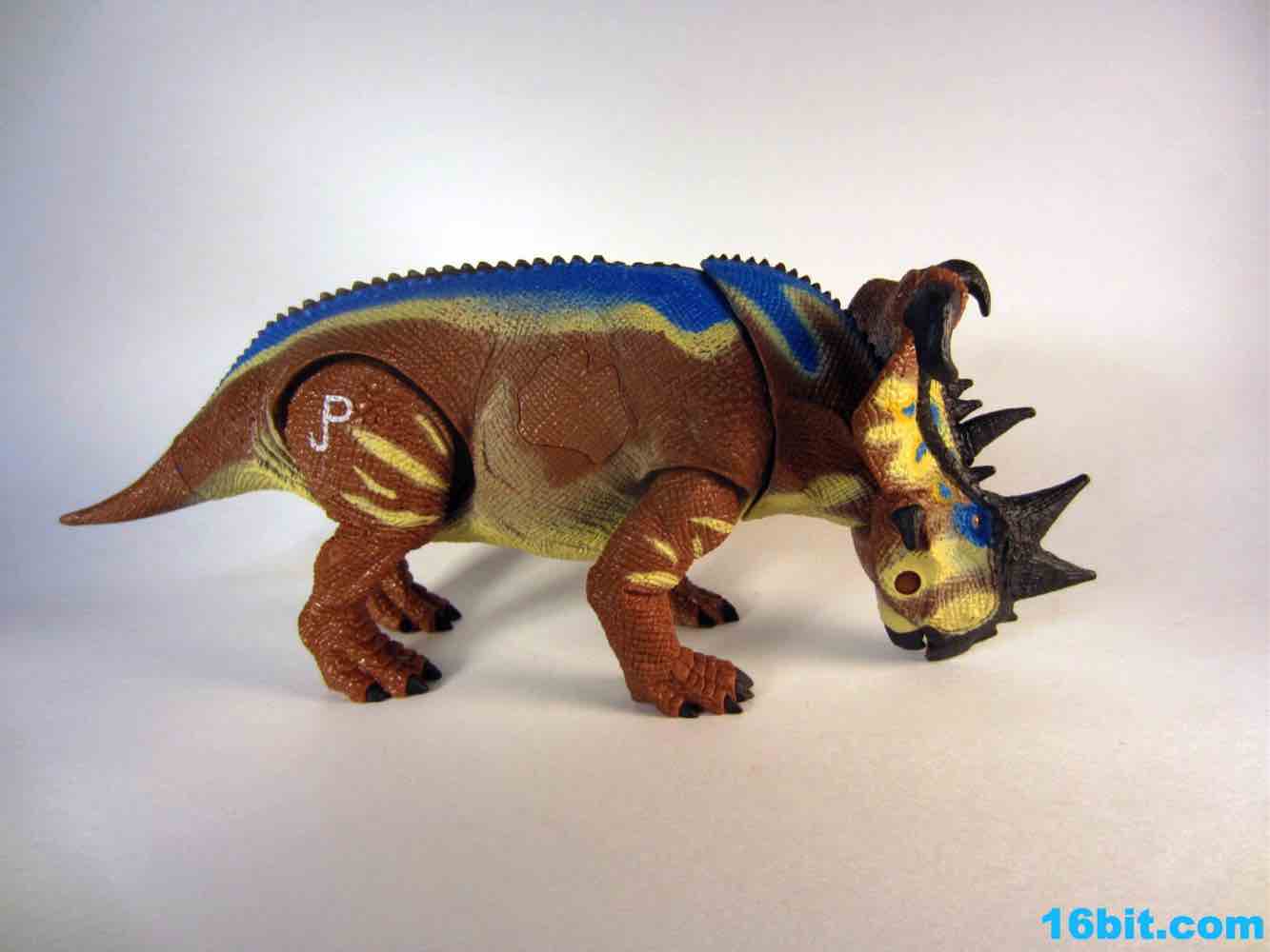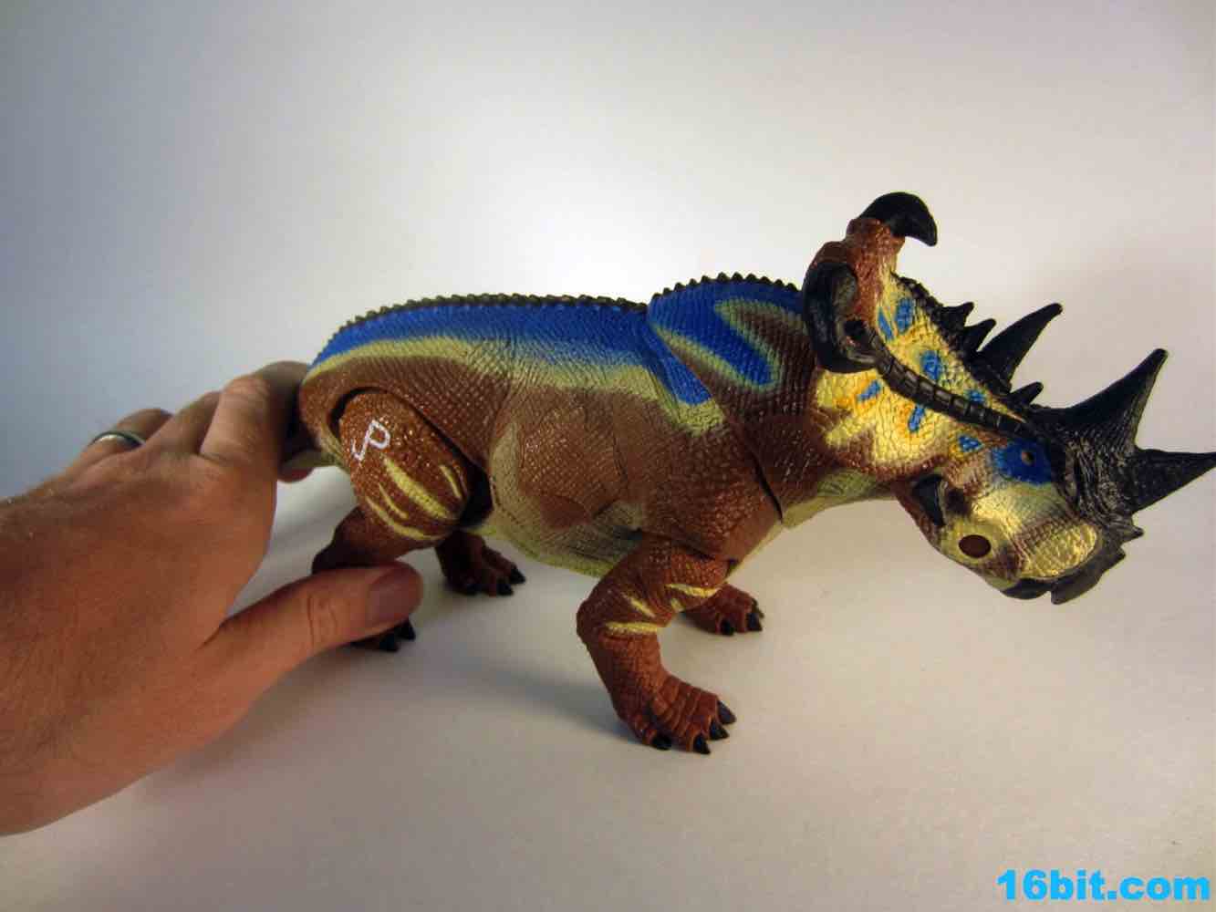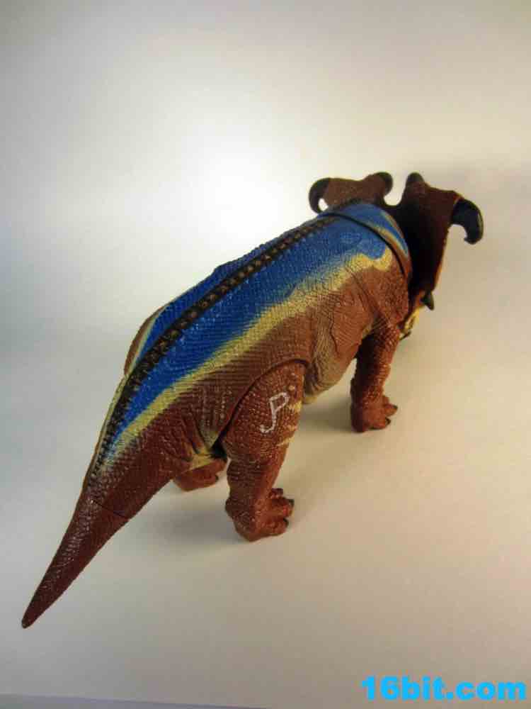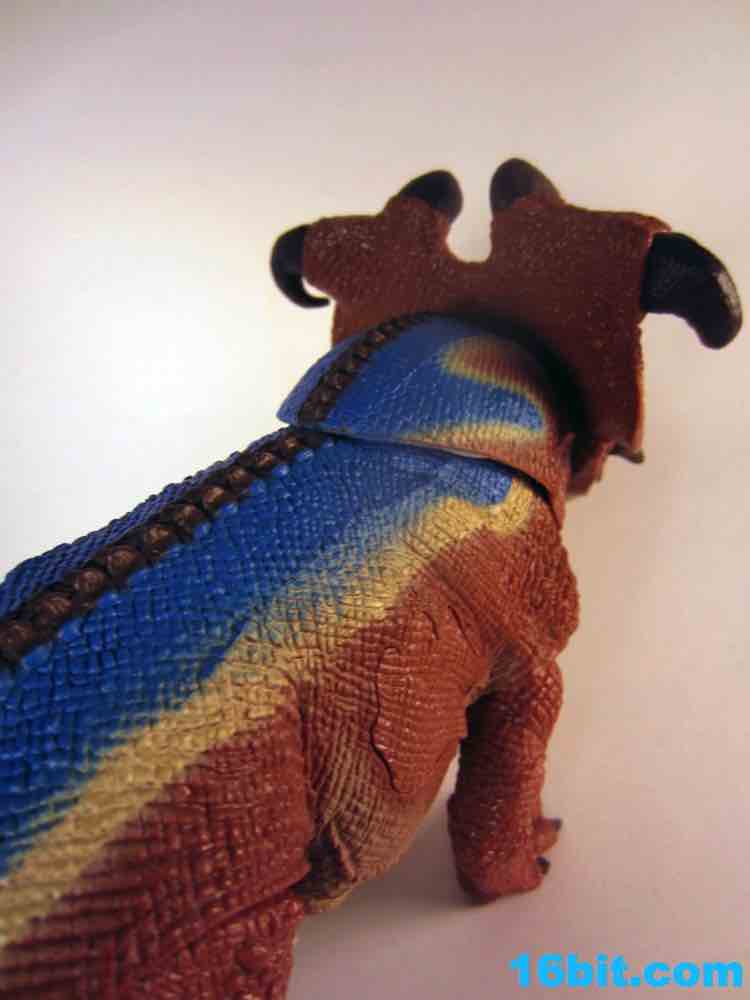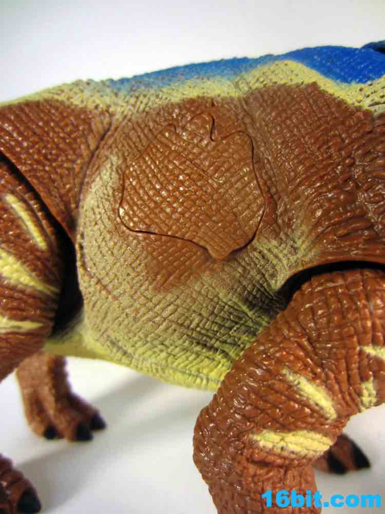 The dinosaur is a $20 chunk of the set. The pairing of G.I. Joe and Jurassic Park is pretty exciting (if not official. Supposedly an Adventure Team crossover was scrapped.) The big dinosaur has a 2010 copyright date and a January 11, 2013 manufacture date (that's the 30111 on the box and carved into the foot), so it's plenty new and Hasbro didn't really go out of their way to let people know it was coming, despite samples of unpainted Pachyrhinosaurus toys having shown up in 2010/2011 along with a Carnotaurus, Stegosaurus, and the just-released Allosaurus. The sculpting is phenomenal as usual, with loads of detail and a decent amount of articulation. The scaley hide looks like it must have taken dozens of hours to craft, and the head is loaded with detail in the horns and on the back of the head. It's worth noting that not only is there a head-ramming action activated by pulling the back foot, but also a ball joint on the neck so the head can look around. The figure sports an articulated jaw, with an unpainted mouth inside. Well, nothing's perfect.