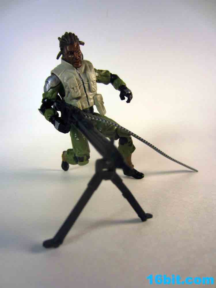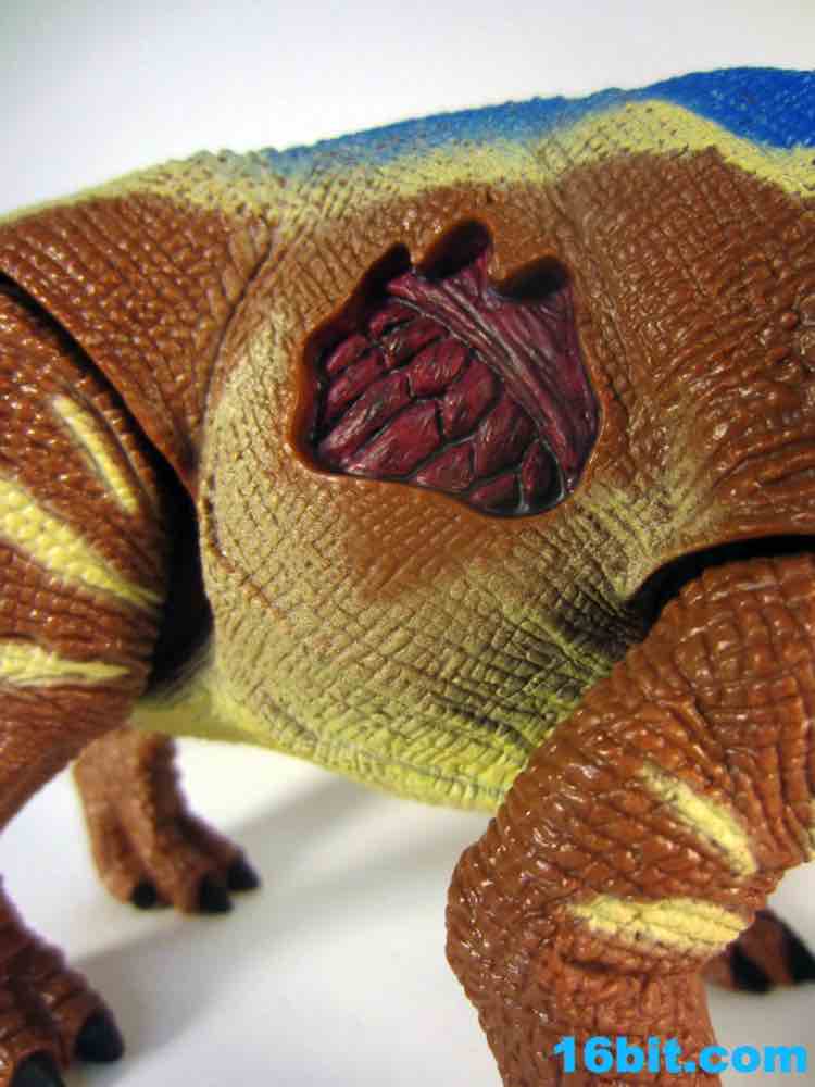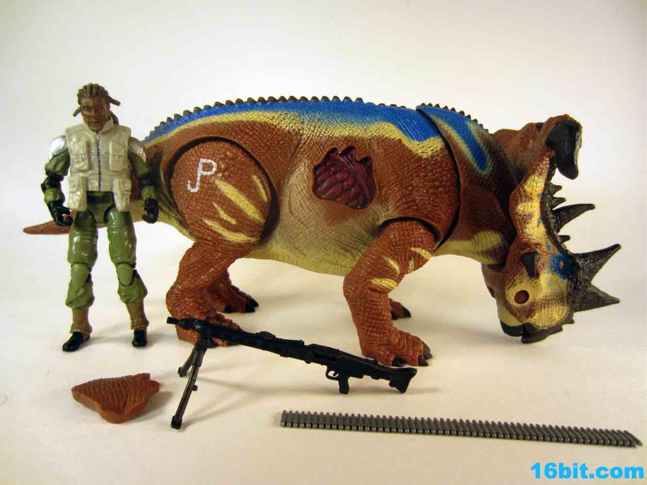 Gordon's gear is pretty light - you get a machine gun, an ammo belt, and a bipod. The other accessory in the box is a chunk of "dino damage" flesh which plugs into the poor wounded Pachyrhinosaurus, and older fans will recall "dino damage" has been as integral to this brand back in its Kenner days as the early TV spots telling kids to "look for the JP logo." It plugs right in to the body.