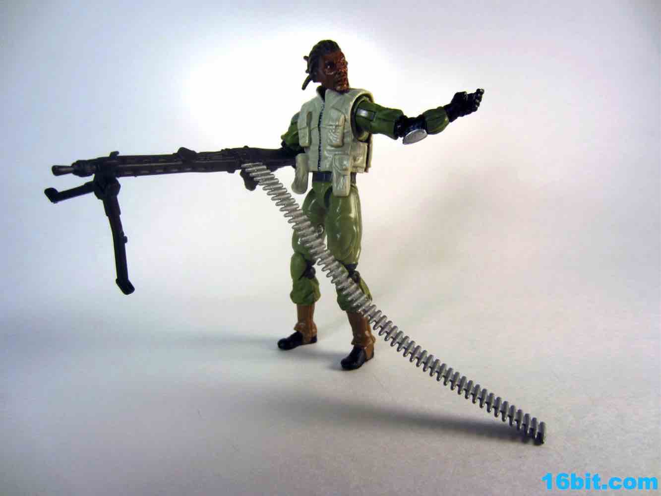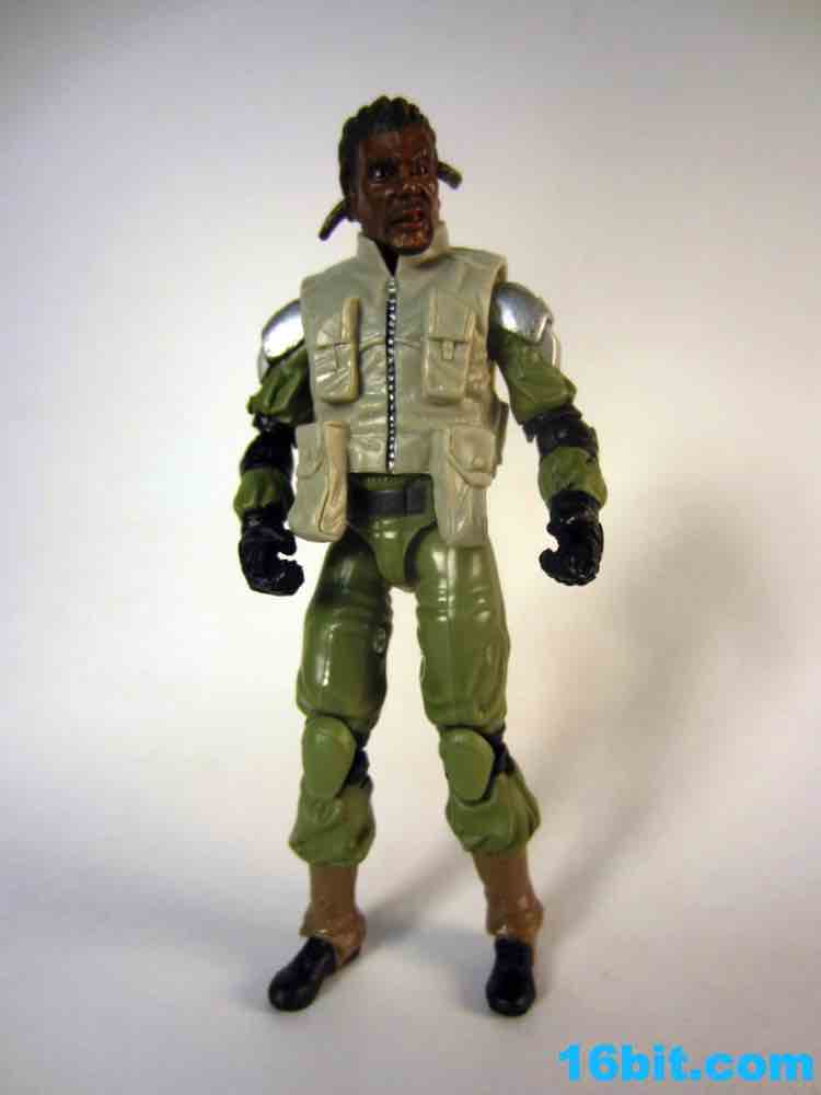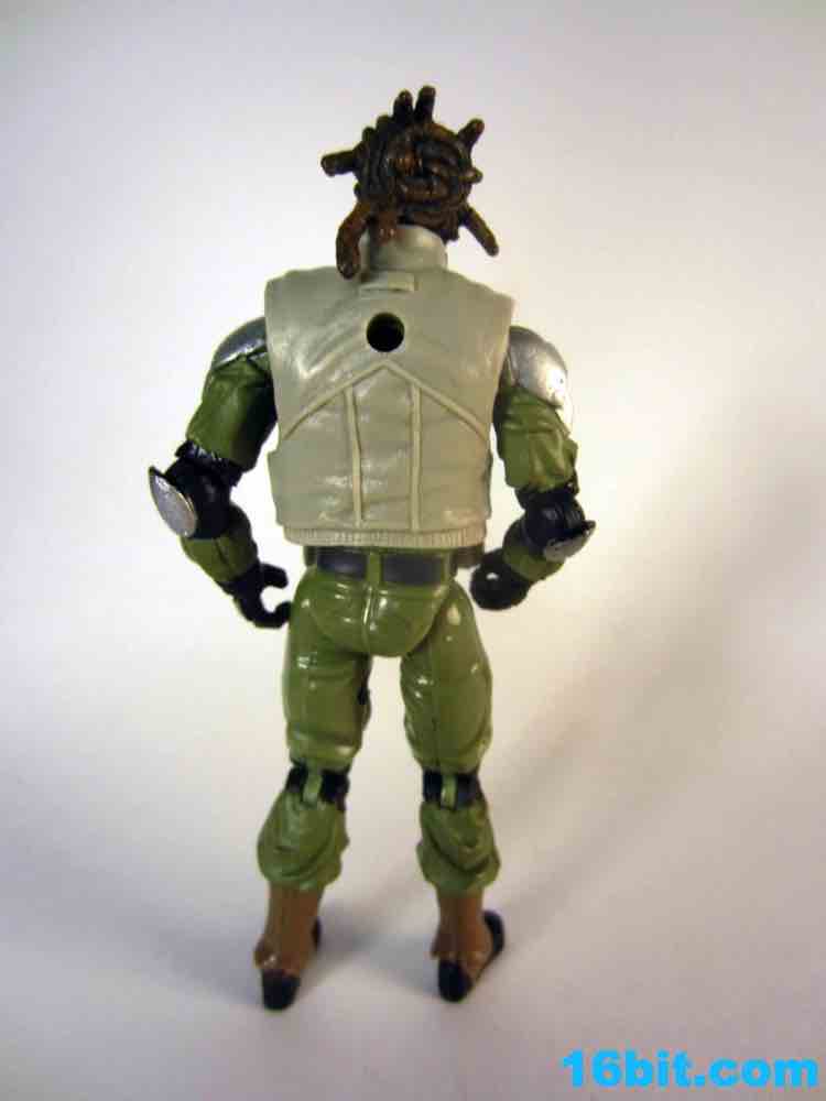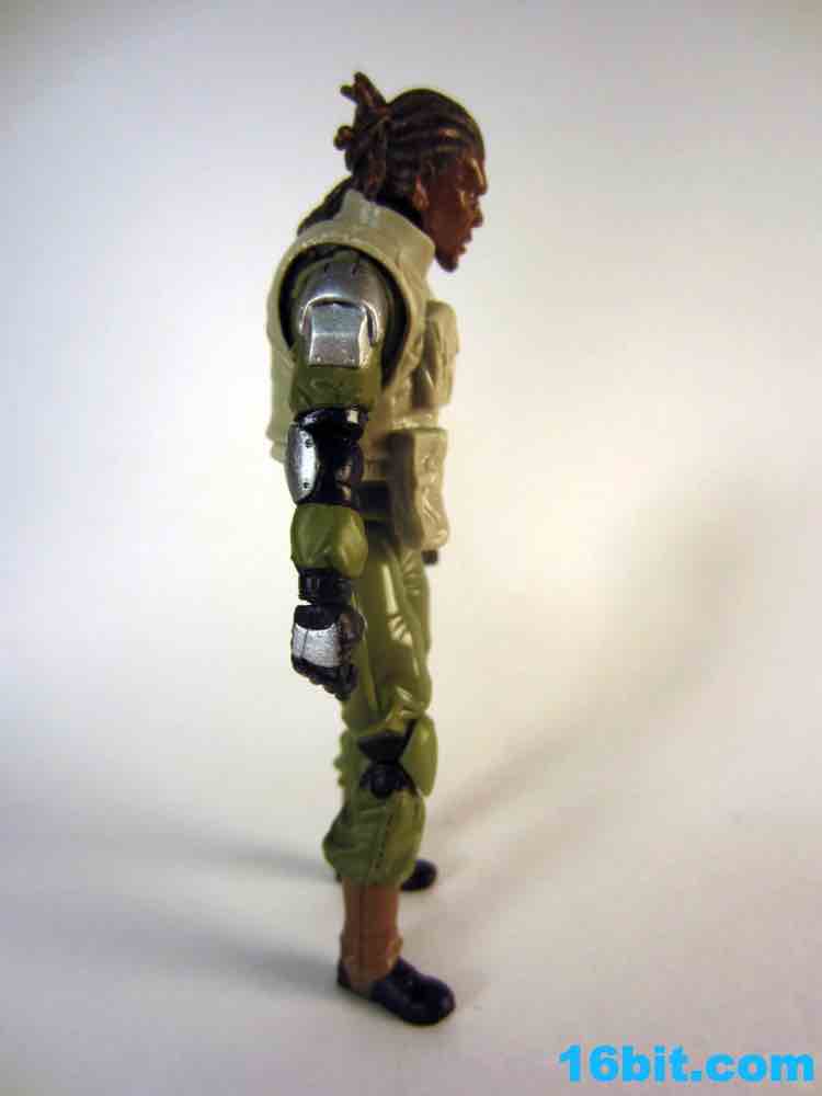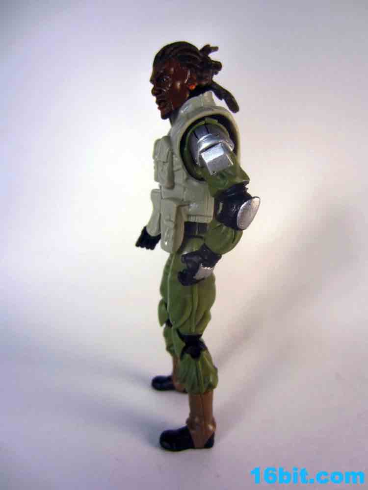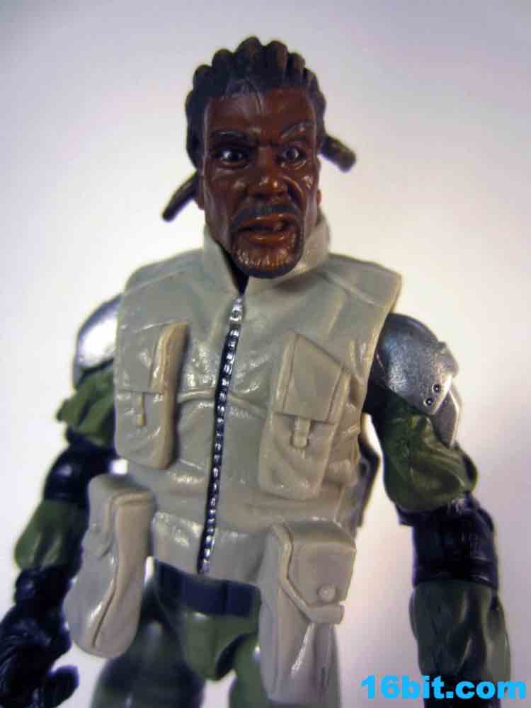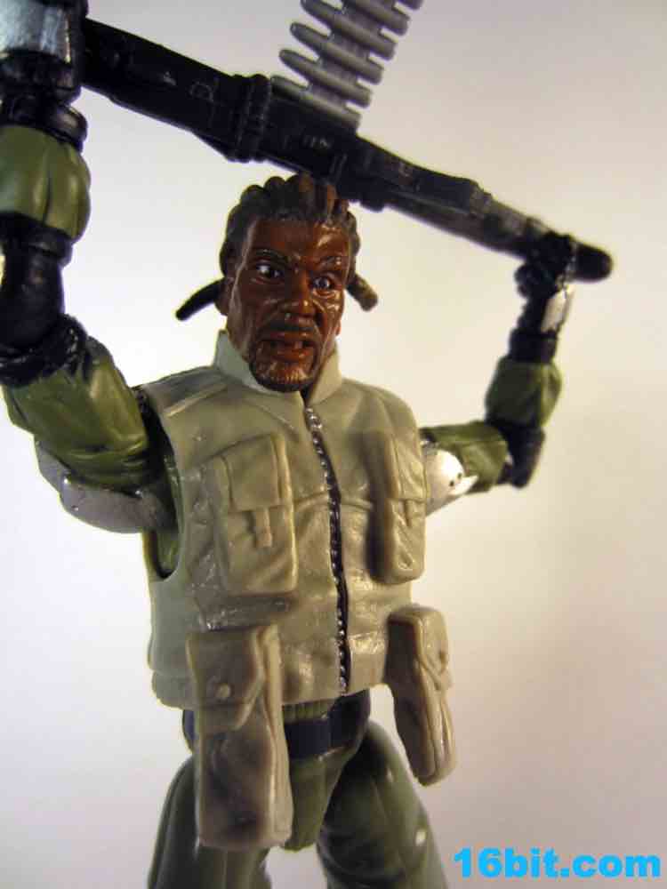 The goofy name Gunner Gordon more or less works because he's got a machine gun and, I assume, the name his mother gave him is Gordon. The once-blue Cobra Trooper now has green clothing with a tan vest, and at first glance it's not remotely obvious where it came from. With 16 points of articulation, this body type could probably be easily adapted to countless other figures, and it's notable that Hasbro's reusing its vast resources on other brands. I have no idea if this character is a reference to something, perhaps a Hasbro employee or a comic character, but it looks pretty spectacular. On the box the figure has white painted teeth, but the sample only has two-tone hair, an earring, some facial hair, and incredibly expressive eyes. I wouldn't necessarily say that the head is realistic, but I will say it's swimming with more personality than I'm used to seeing at this scale. The askew mouth and arched eyebrows tell a little bit of a story, which is a departure from most figures in this scale which just come out looking bored. Unlike earlier "Jurassic Joe" hybrid samples, this figure has no INGen or JP markings, it's just a fairly generic quasi-military outfit. I would say this is a step away from the right direction, as JP branding has been one of the line's hallmarks since the very beginning.