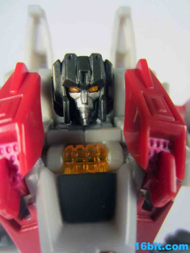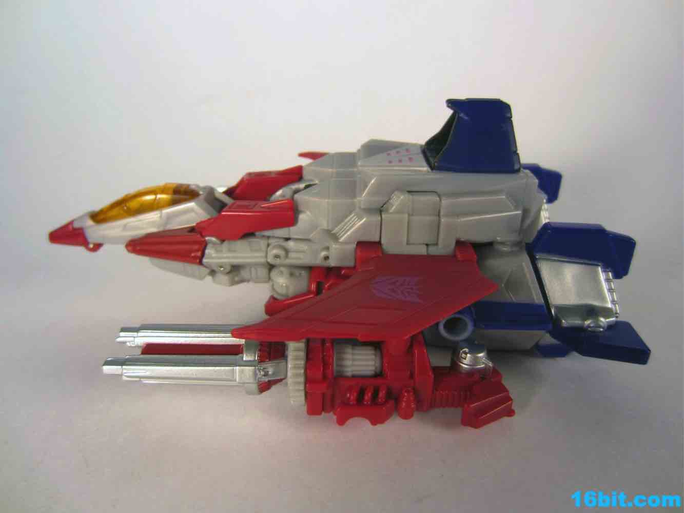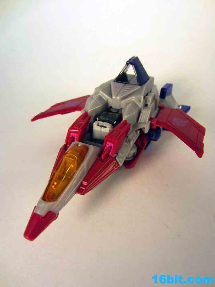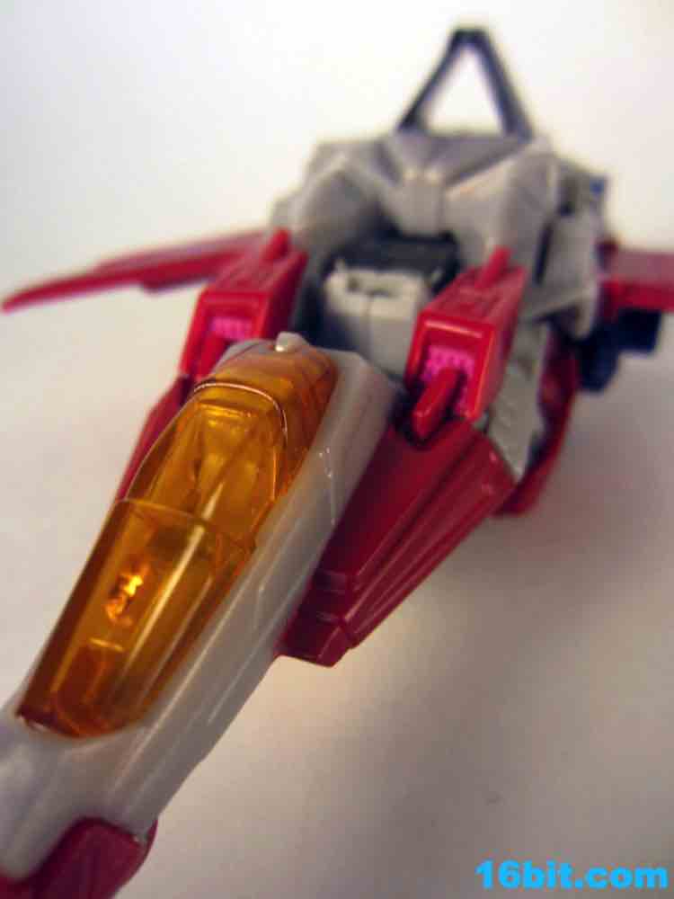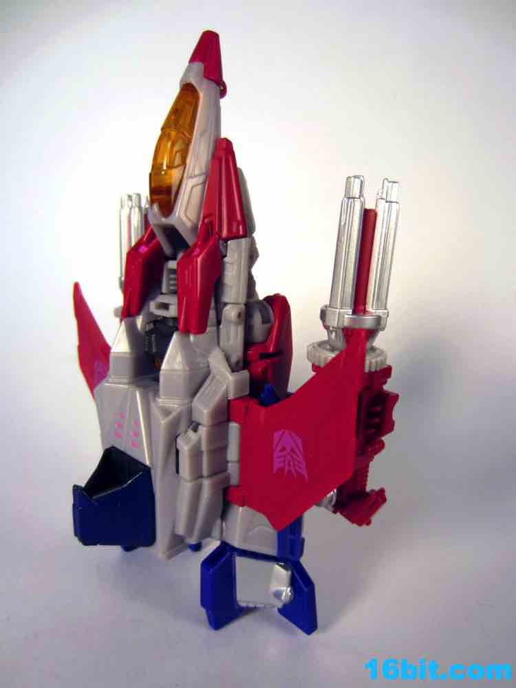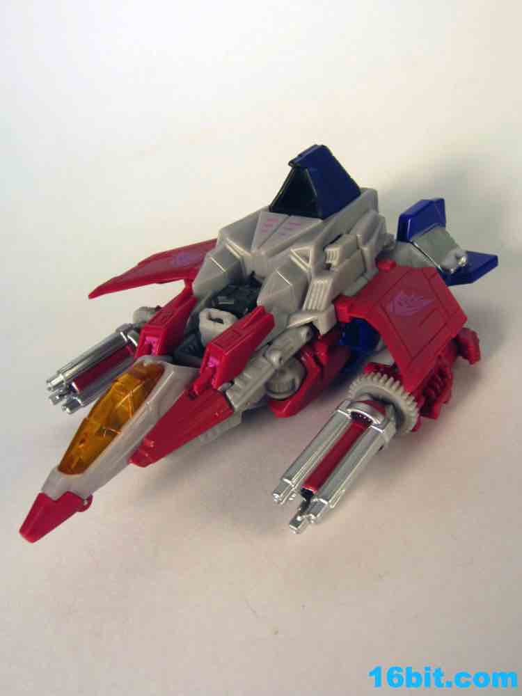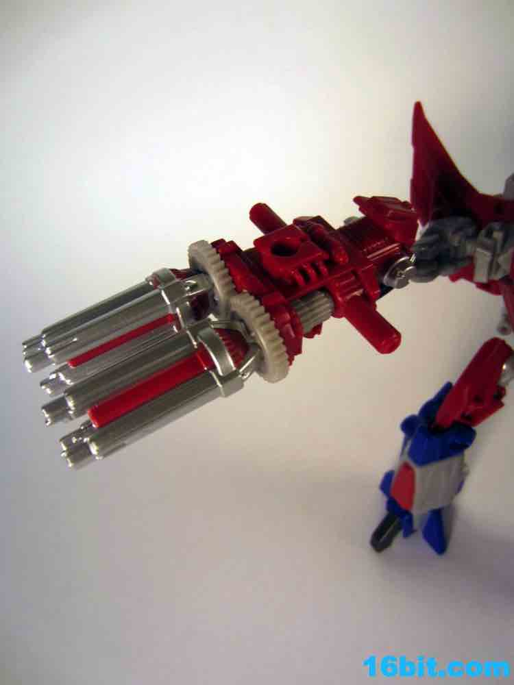 Based on the video games, he turns into a swell space jet. It's not as triangular or outlandish as some other Cybertronian modes, but it's still good and does a decent job recalling those other designs. Guns mount under the wings, and the toy effectively does nothing in this mode. There's no landing gear, there are no wheels. It just looks cool and you can make "whoosh" noises while running around with it in your home when the wife is out. It's fun, I suggest you try it.