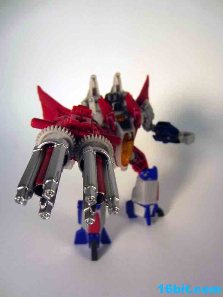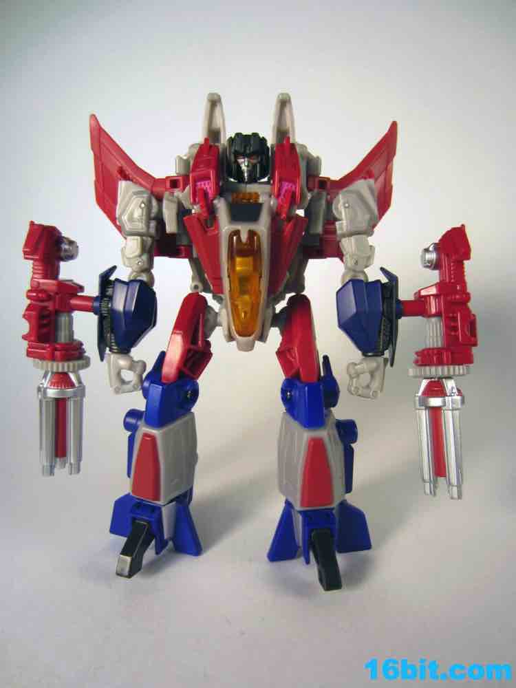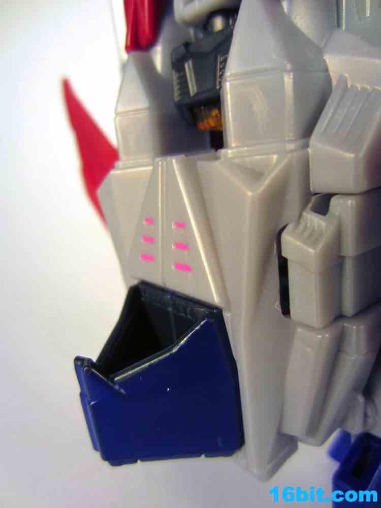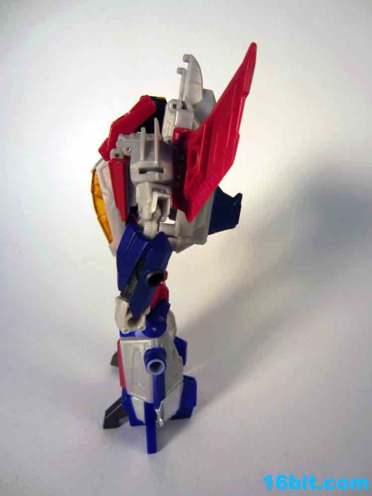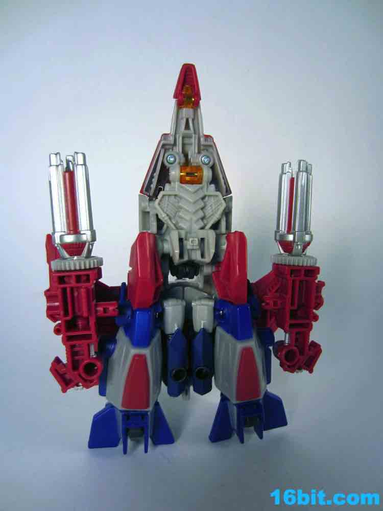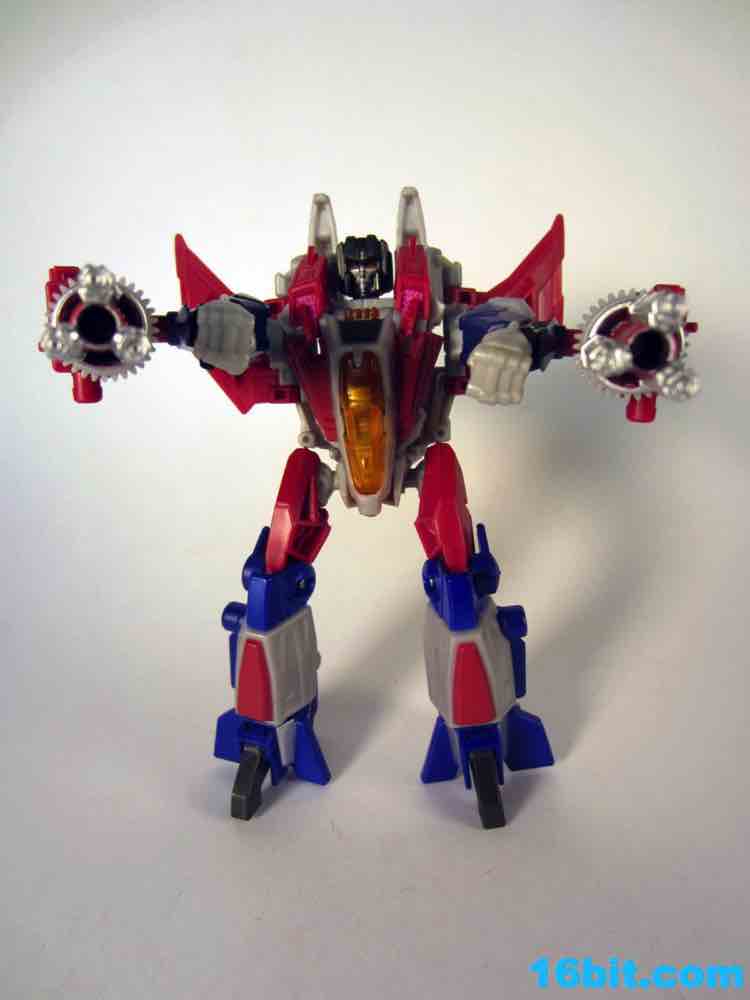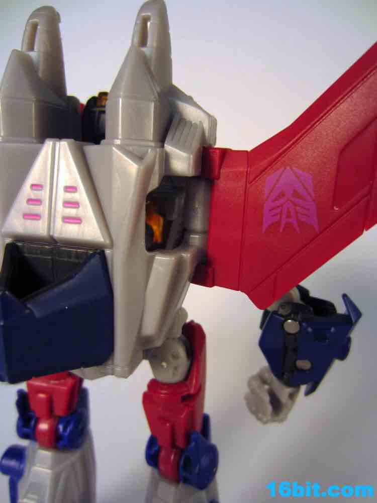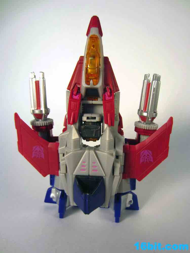 Based on the video games, he turns into a swell space jet. It's not as triangular or outlandish as some other Cybertronian modes, but it's still good and does a decent job recalling those other designs. Guns mount under the wings, and the toy effectively does nothing in this mode. There's no landing gear, there are no wheels. It just looks cool and you can make "whoosh" noises while running around with it in your home when the wife is out. It's fun, I suggest you try it.