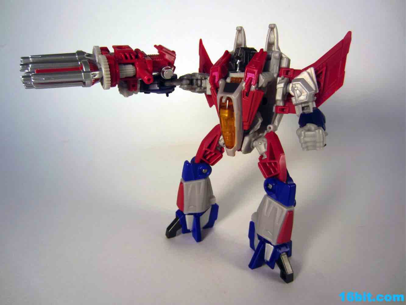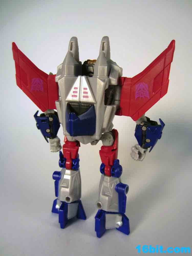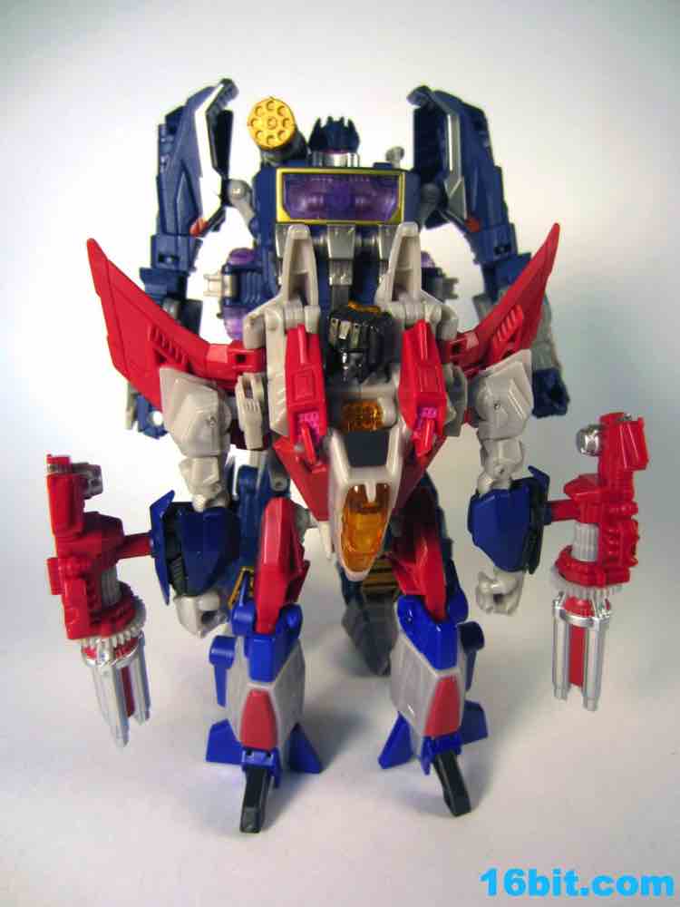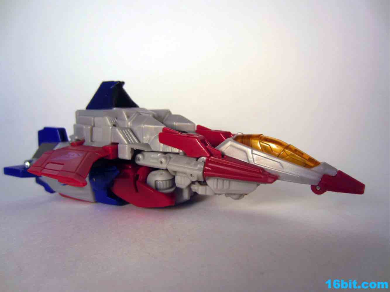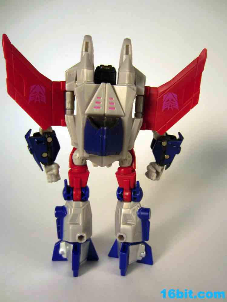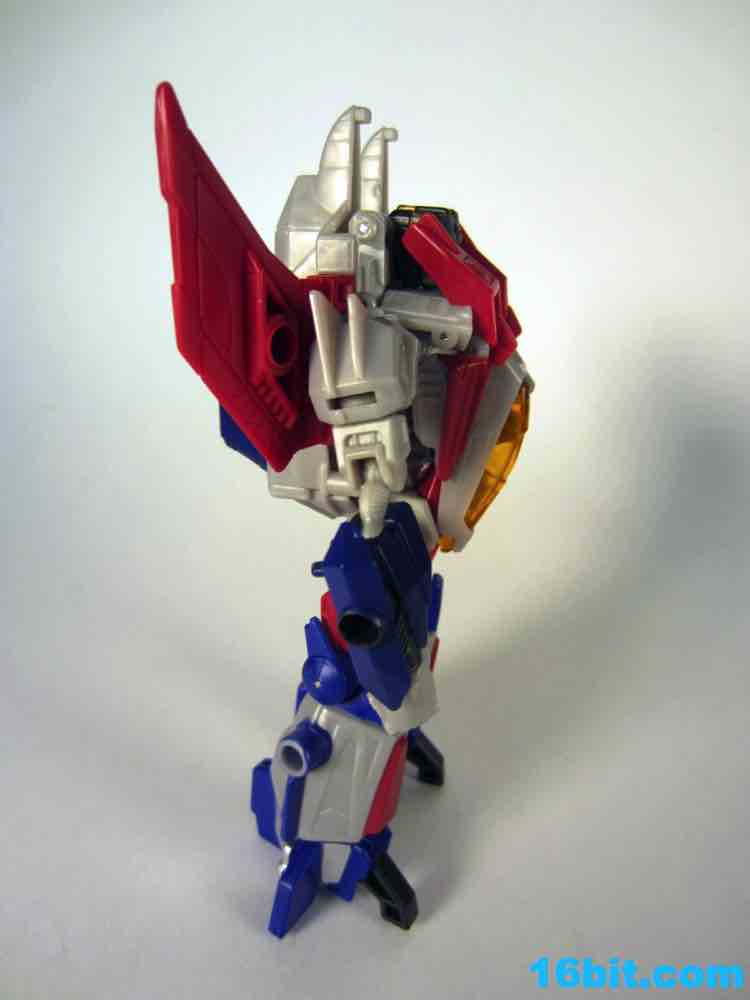 Based on the video games, he turns into a swell space jet. It's not as triangular or outlandish as some other Cybertronian modes, but it's still good and does a decent job recalling those other designs. Guns mount under the wings, and the toy effectively does nothing in this mode. There's no landing gear, there are no wheels. It just looks cool and you can make "whoosh" noises while running around with it in your home when the wife is out. It's fun, I suggest you try it.