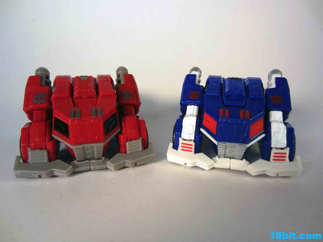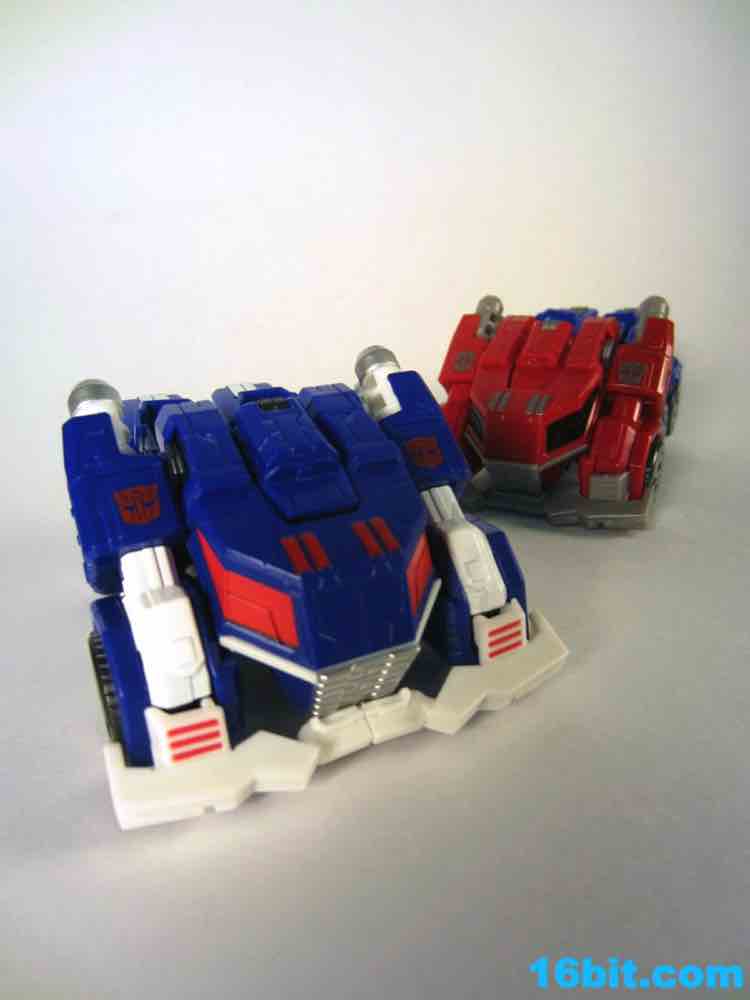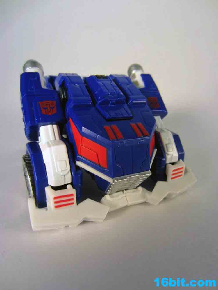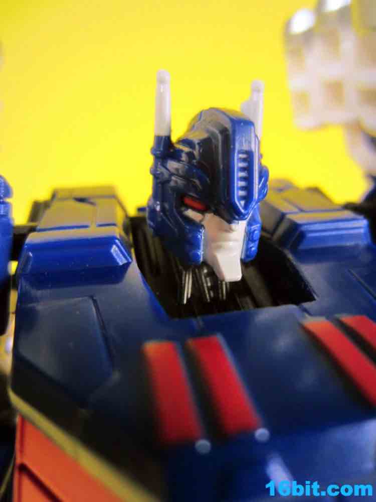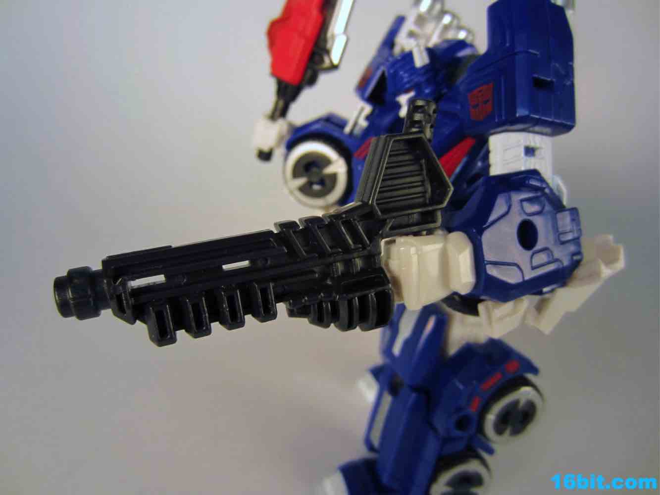 The figure still has the same great articulation and tons of places on which to plug a weapon, and the although the figure does feel a little stiffer in part due to the paint. Ultra Magnus' arms are painted white, so I found moving the pieces to be quite tight here. The hip joints on my sample were a little loose, but not to the point where it's a problem. Everything else was about as tight or tighter than Optimus Prime, and the toy has almost the exact same transformation. The key difference is that Ultra Magnus seems to be designed with the "smokestacks" meant to stick up, while Optimus' are rotated back.