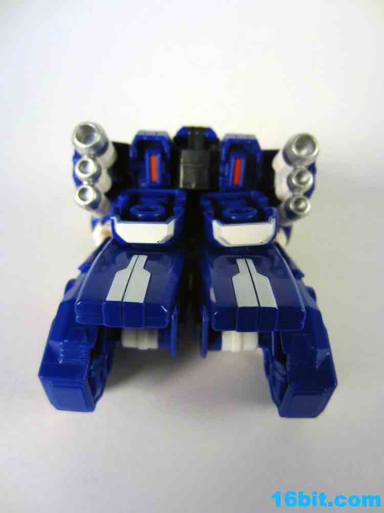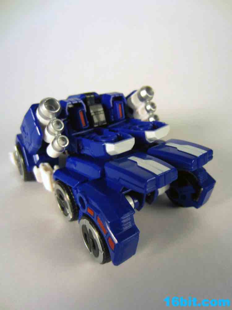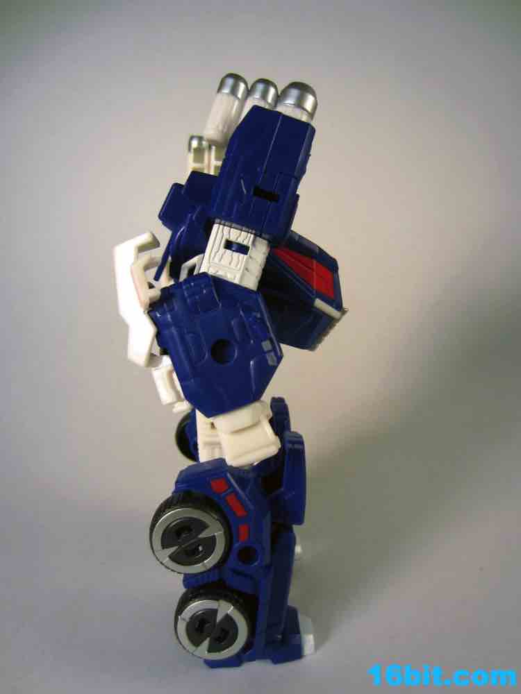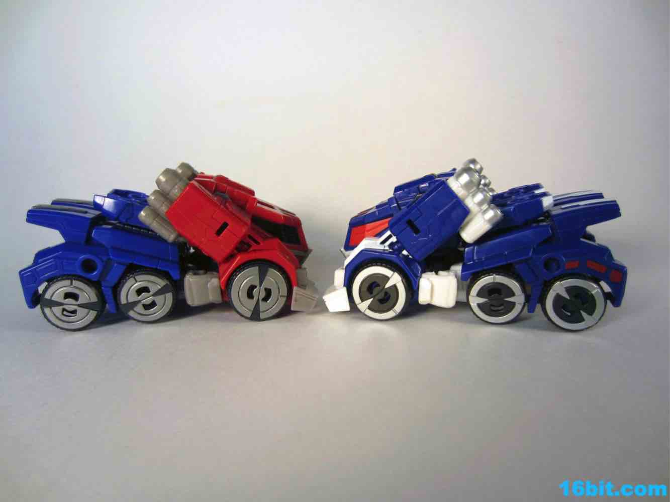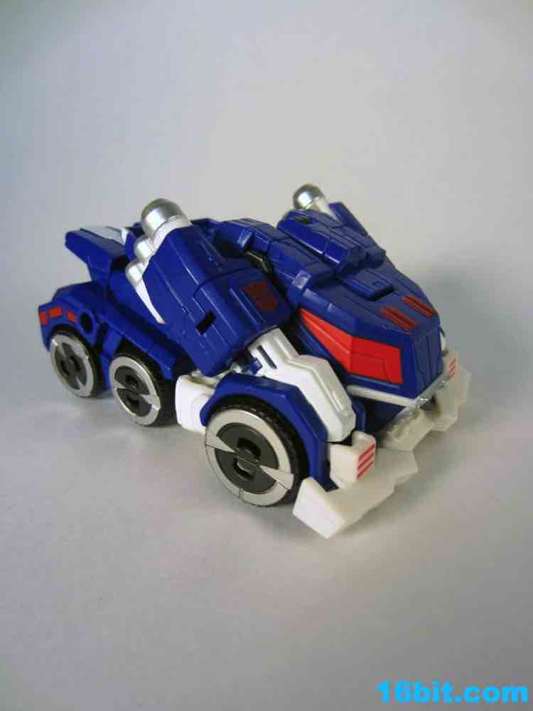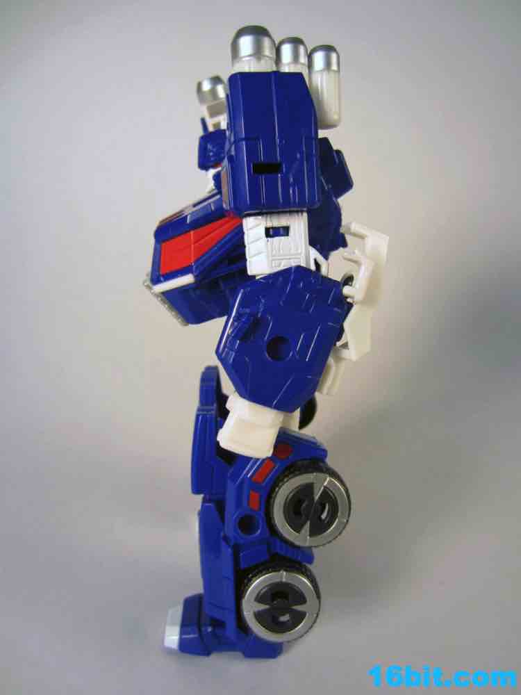 The figure still has the same great articulation and tons of places on which to plug a weapon, and the although the figure does feel a little stiffer in part due to the paint. Ultra Magnus' arms are painted white, so I found moving the pieces to be quite tight here. The hip joints on my sample were a little loose, but not to the point where it's a problem. Everything else was about as tight or tighter than Optimus Prime, and the toy has almost the exact same transformation. The key difference is that Ultra Magnus seems to be designed with the "smokestacks" meant to stick up, while Optimus' are rotated back.