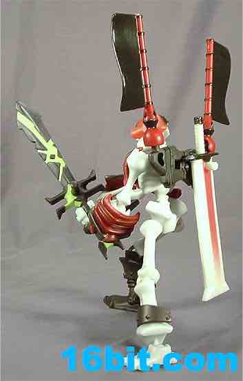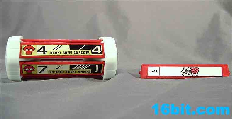 The figure is basically a bag of bones with armor and metallic elements. The off-white color is good because while white yellows, a lot of quasi-white plastics tend to not have discoloration problems. I was a little surprised (and frankly disappointed) that the figure almost looks like it should glow in the dark. (It doesn't.) The basic skeleton is comprised of 14 ball-and-socket joints (15 parts) which can be swapped out from any other figure from any other line. If you like Glyos, you'll probably love these. The stylized skeleton can be turned into a pirate with alternate limbs including a hook for a hand, a tentacle arm, snap-on armor, peg legs, and a metallic robot foot. There's an alternate cyborg skull head too which has a Trap Jaw vibe. I remember telling people that Xevoz was the last 1980s action figure line, and to this day I think that's very true. This was a wonderful experimental toy line where it was pretty obvious stores and Hasbro didn't know what to do with it.