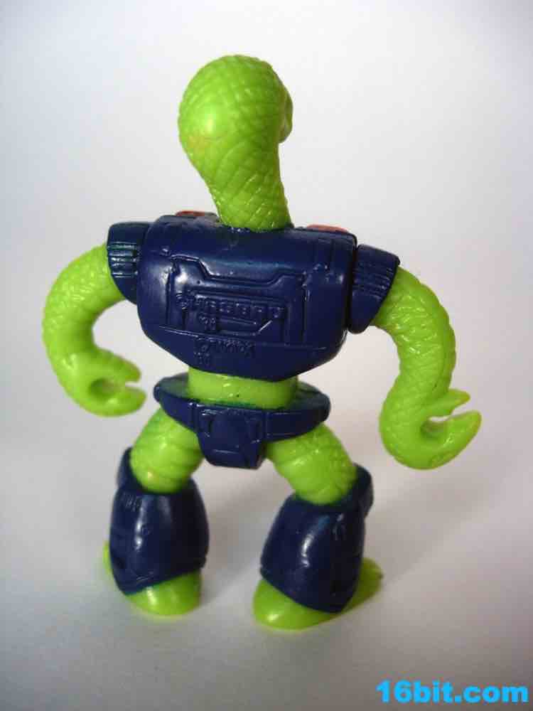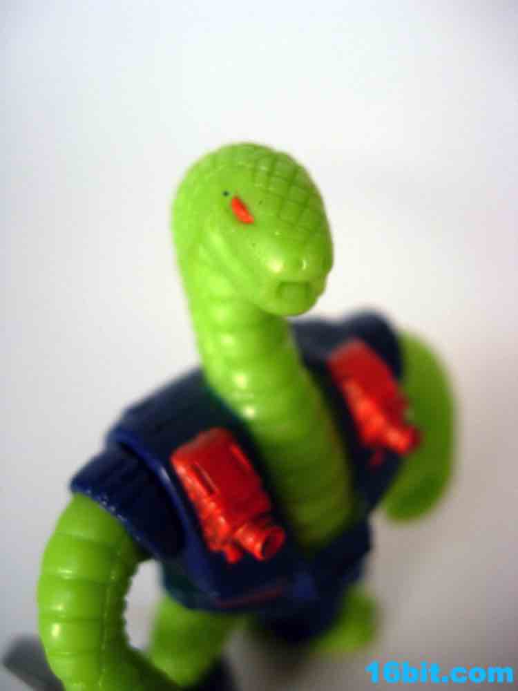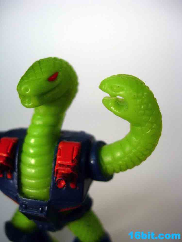With two points of articulation, Snakebomb here managed to have a rather interesting take on his arms. Most series 1 Battle Beasts figures had mittens without sculpted fingers on their hands, but Triple Threat Snake goes one step beyond by making the arms into actual snakes! Each one has sculpted eyes, and they can grip a 3mm weapon in their mouths. While the eyes remained unpainted due to what I assume were budget reasons, the arms were sculpted with fairly intricate scales as were the legs and the back of the head. The figure looks like it had a lot of work done during its creation, a strong contrast to the rest of the line which was mostly smooth. He's got an awesome smirk with visible fangs, and his glowing red eyes are similar to Transformers and other 1980s toys from Takara and Tomy. (This unique ocular detail was captured recently by Diamond Select Toys for its line which shared the same name, while Beast Saga went with more realistic peepers.) Even more interesting was that the figure has a robotic armored vest with gun nipples, painted red with matching vents on the underside of the garment. You really don't even see them unless you rotate the figure, so it's surprising to see a toymaker invest a penny or two to decorate a detail you'll probably never see.