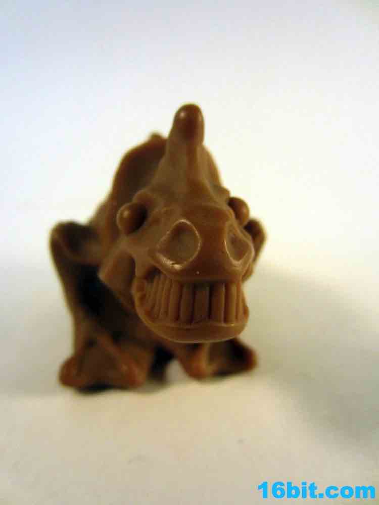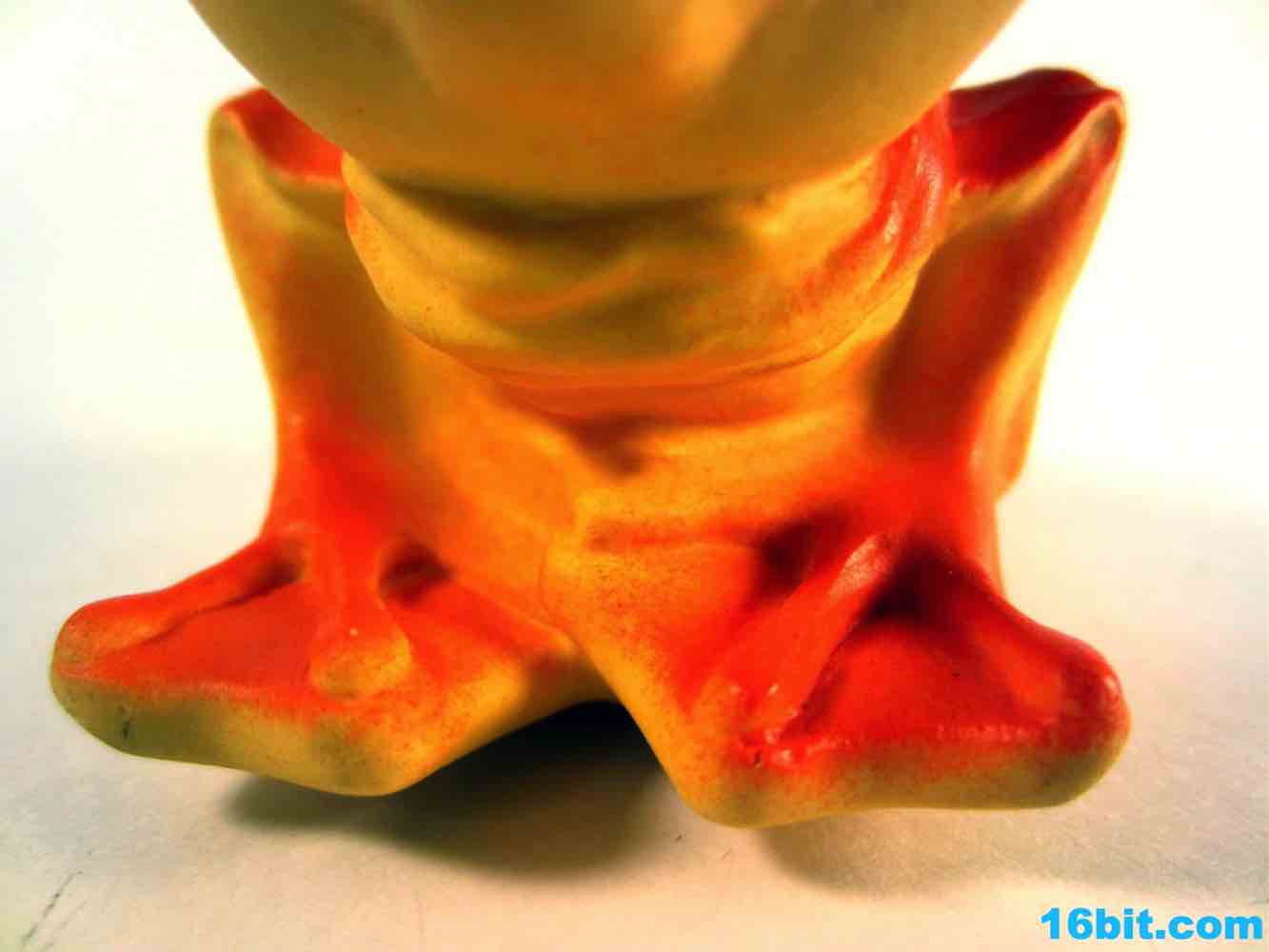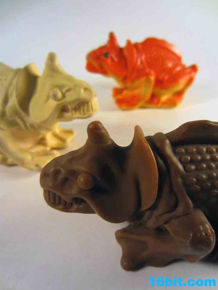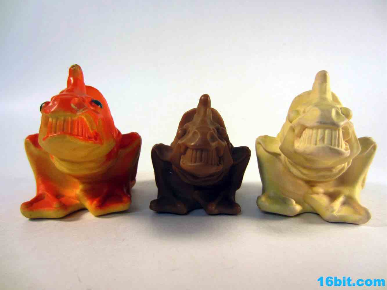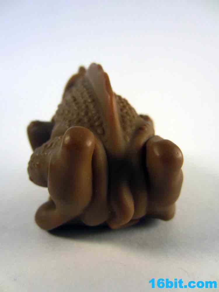 The figures are basically all the same - the three big ones seem to be cast from the same design and are basically the same size, with the brown one clocking in a half-inch shorter. It has no articulation, but they have this amazingly sculpted bumpy skin, very wrinkly flesh around the neck, and frog-like legs for reasons I cannot possibly fathom. I would give anything to talk to the designer of this hollow toy to know what the intent was and just what it's supposed to be from. Like a squeaky toy (or a Glow Ghosts figure), it has a hole in the bottom.