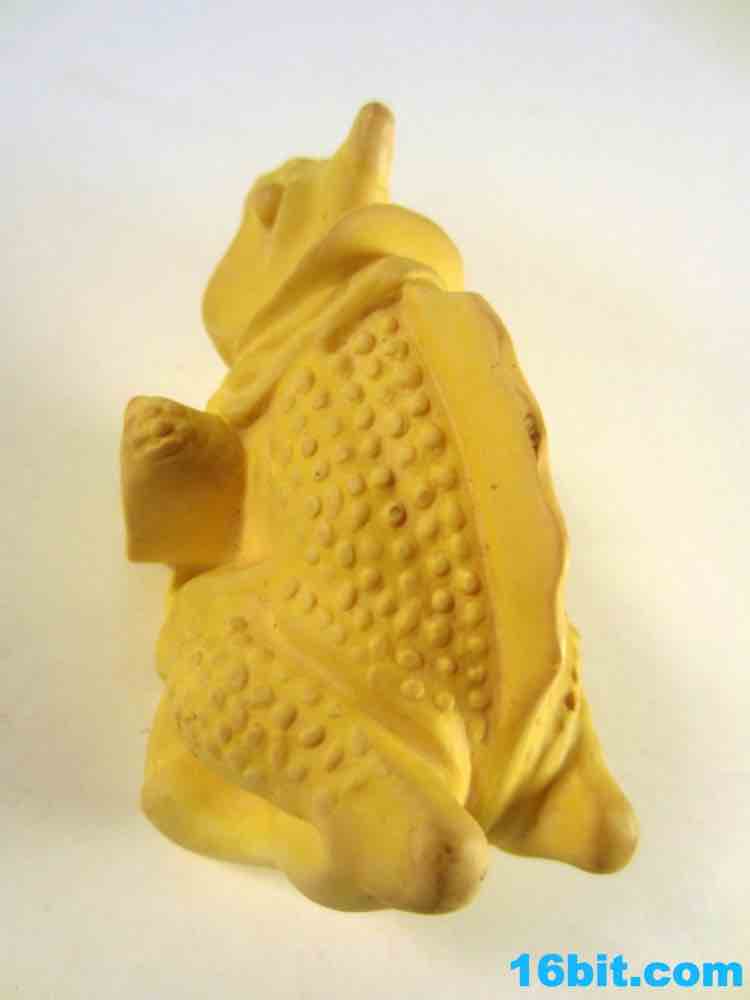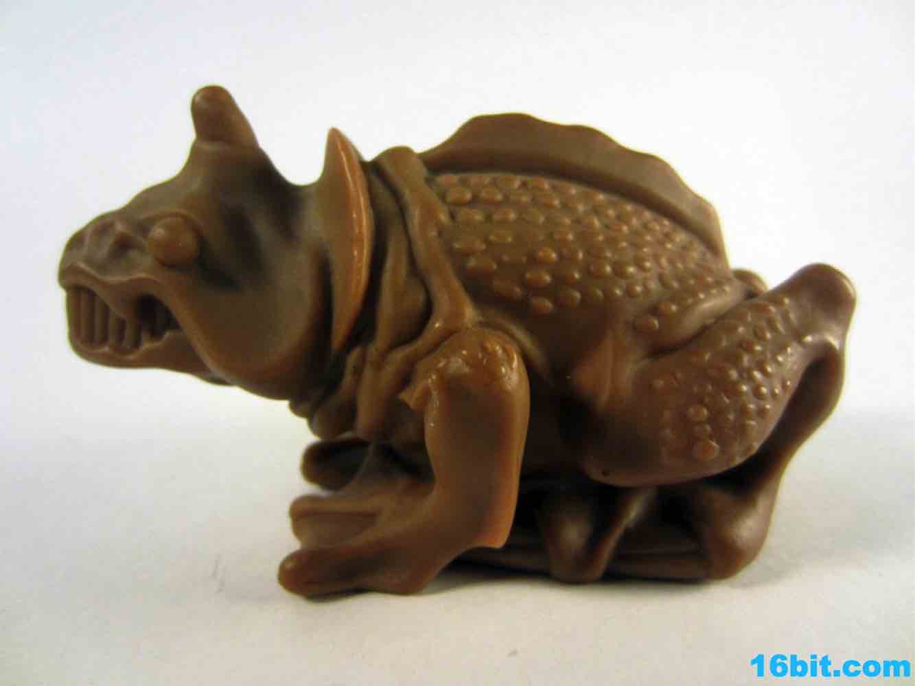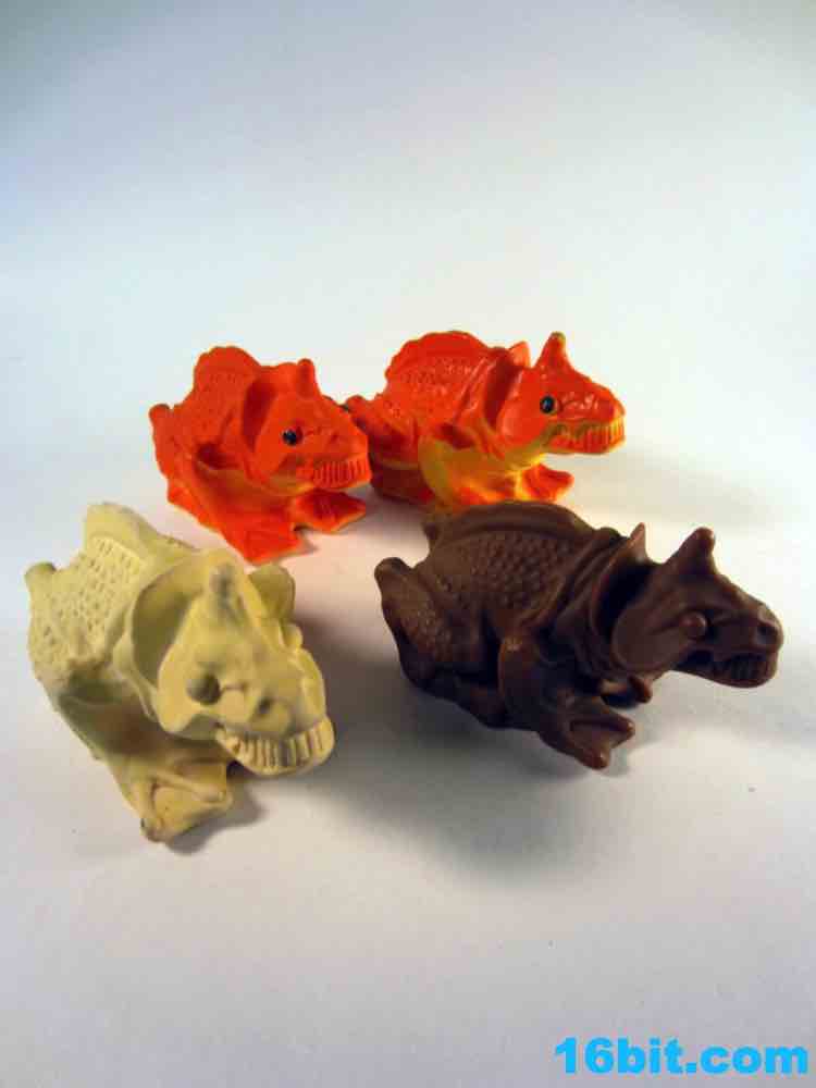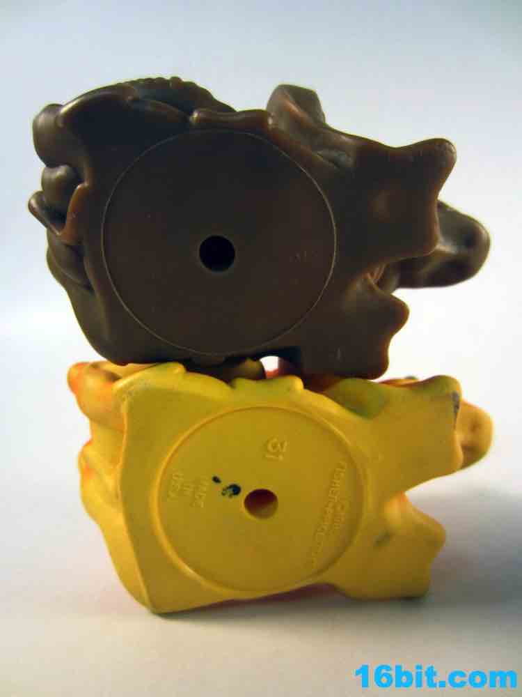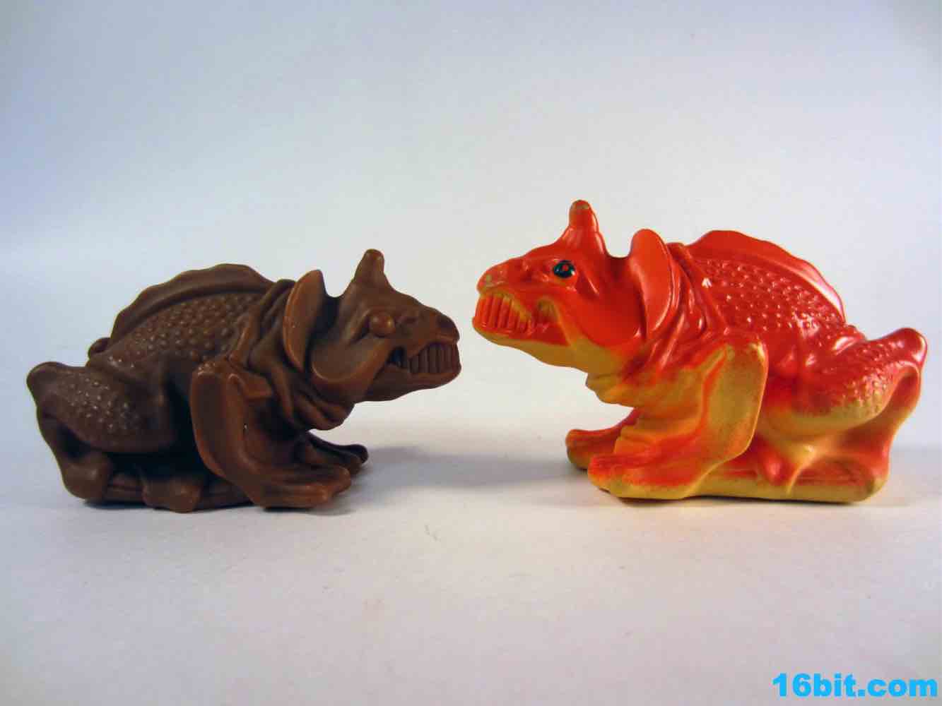The figures are basically all the same - the three big ones seem to be cast from the same design and are basically the same size, with the brown one clocking in a half-inch shorter. It has no articulation, but they have this amazingly sculpted bumpy skin, very wrinkly flesh around the neck, and frog-like legs for reasons I cannot possibly fathom. I would give anything to talk to the designer of this hollow toy to know what the intent was and just what it's supposed to be from. Like a squeaky toy (or a Glow Ghosts figure), it has a hole in the bottom.