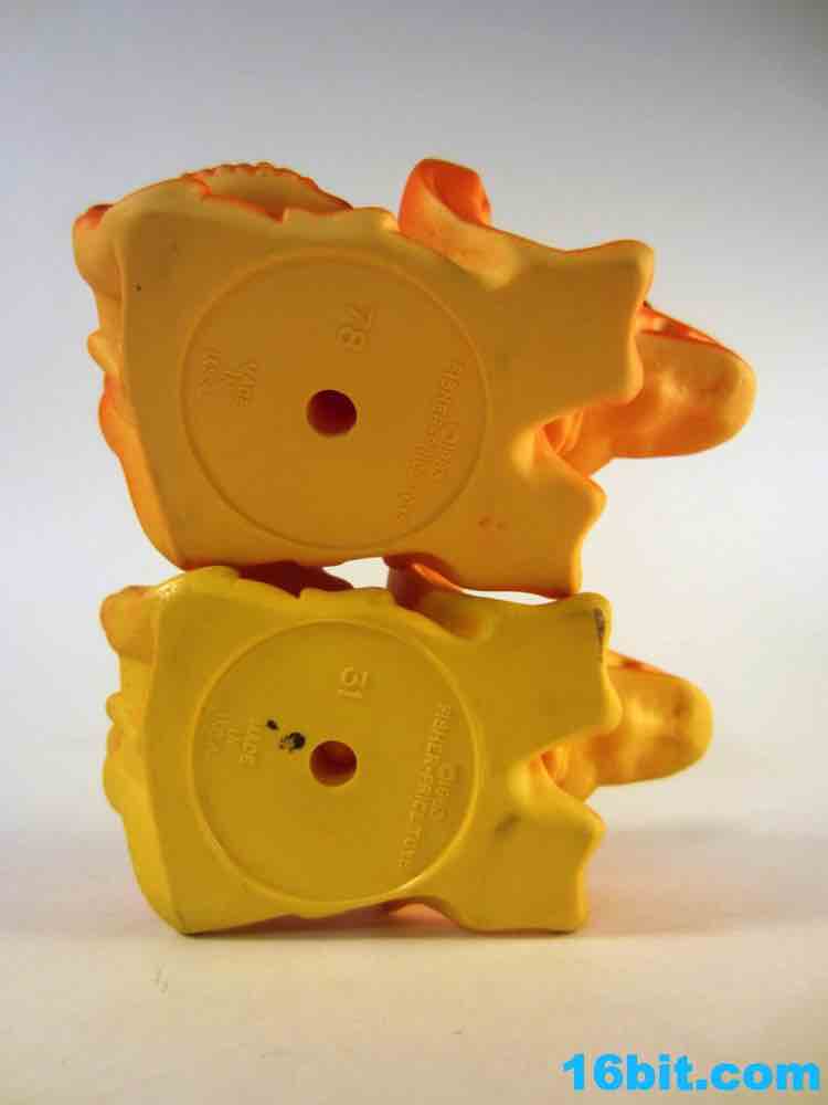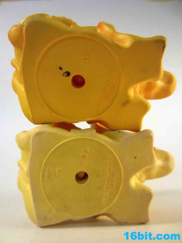 Production toy: Taken from a sealed box with a sealed bag inside. Bottom reads (C) 1983 Fisher-Price Toys 78 MADE IN U.S.A. Toy is cast in a slight orange tint of plastic. Roughly 4-inches long. Matte finish.
