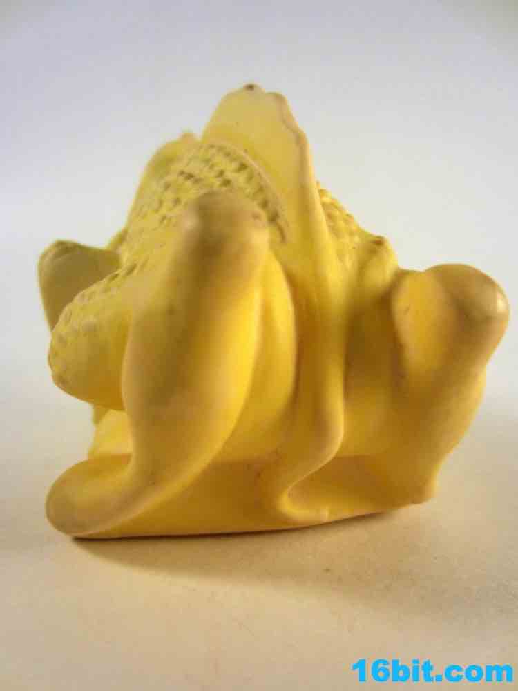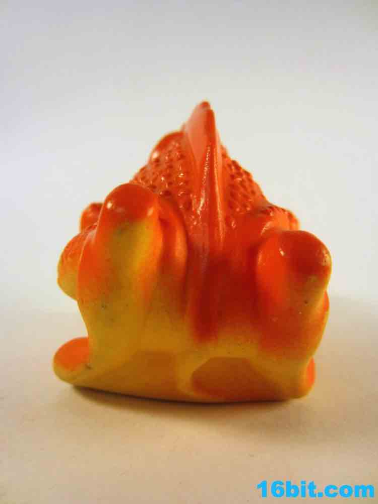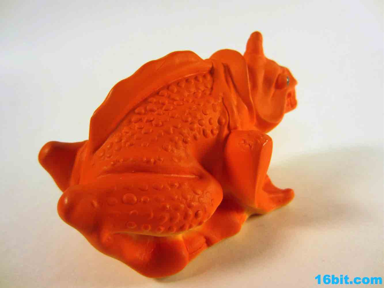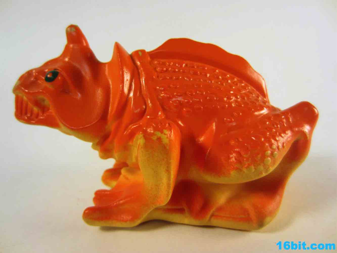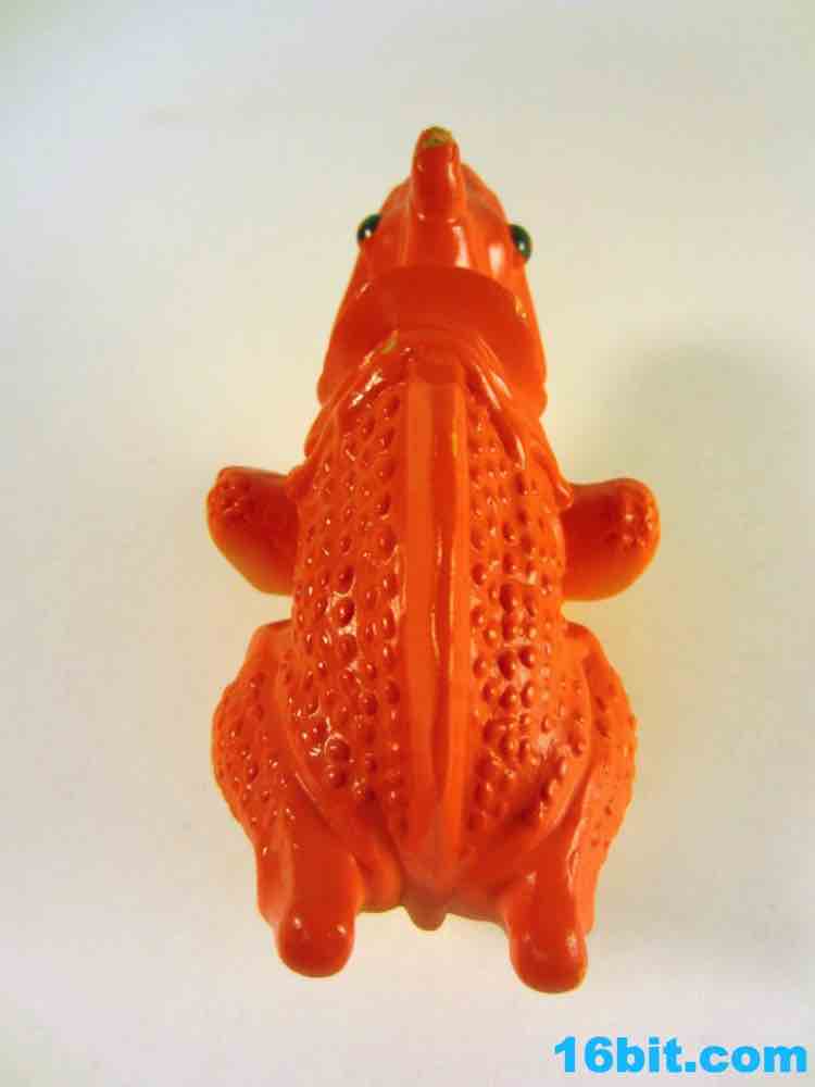 From my previous FOTD on the production piece: "The alien creature is effectively a non-squeaking squeak toy. It's hollow and has a hole on the bottom, and the frog/dinosaur hybrid is made of a soft, squeezable plastic. Molded in yellow, he has red skin and green eyes, plus some genuinely freaky teeth. I'm not sure what they were going for-- needles, baleen, or what... but it's unlike any other space toy I saw as a kid, and I always thought this was an amazing little creature. I've owned a grand total of three of these, and all have been colored this way-- however I have seen images online of one molded in orange plastic with green eyes, and I don't know what his story was."