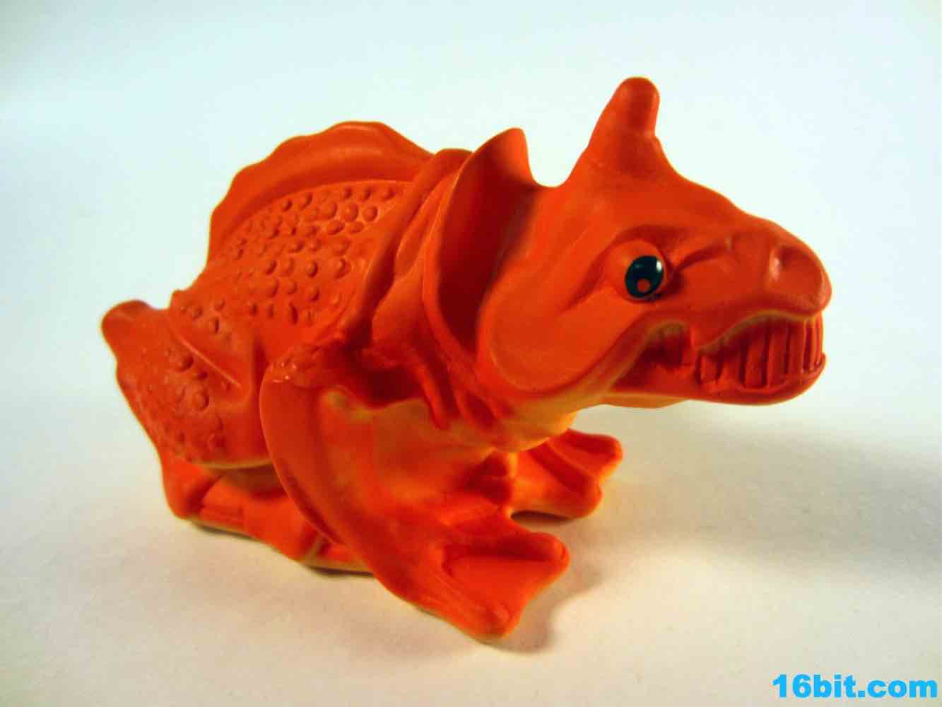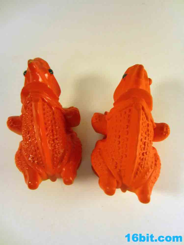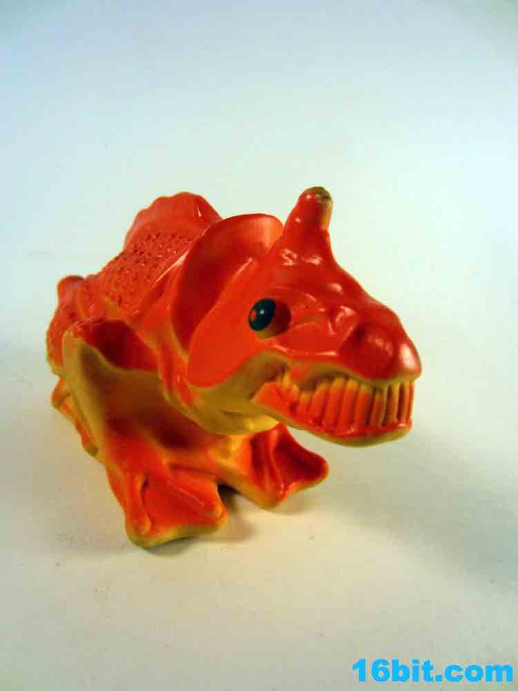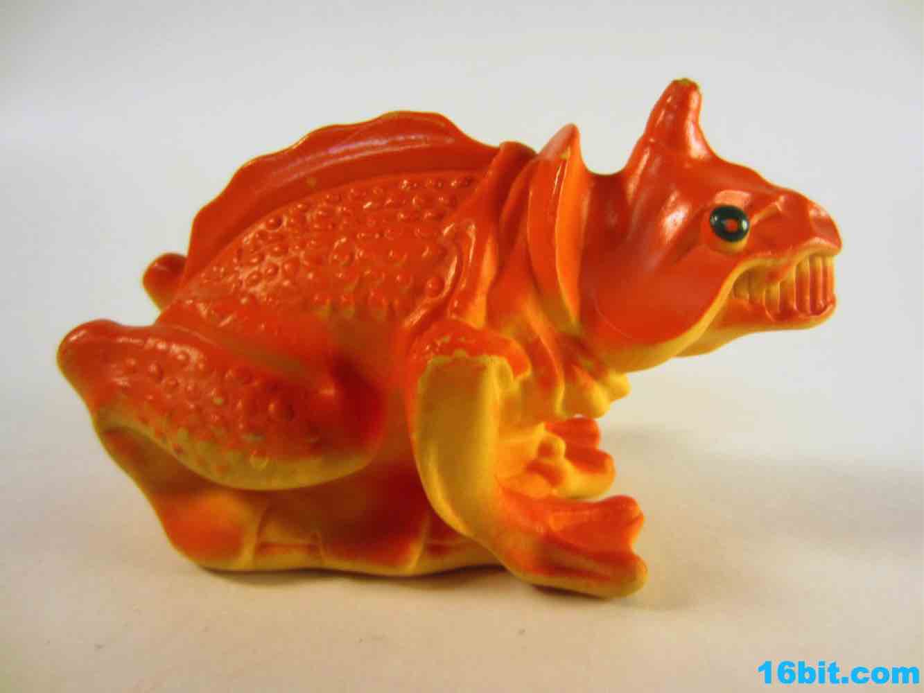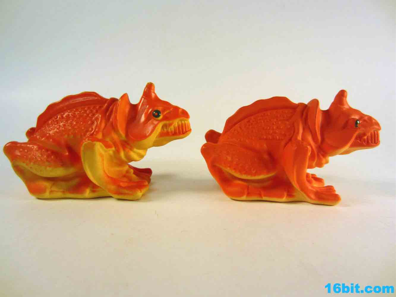 From my previous FOTD on the production piece: "The alien creature is effectively a non-squeaking squeak toy. It's hollow and has a hole on the bottom, and the frog/dinosaur hybrid is made of a soft, squeezable plastic. Molded in yellow, he has red skin and green eyes, plus some genuinely freaky teeth. I'm not sure what they were going for-- needles, baleen, or what... but it's unlike any other space toy I saw as a kid, and I always thought this was an amazing little creature. I've owned a grand total of three of these, and all have been colored this way-- however I have seen images online of one molded in orange plastic with green eyes, and I don't know what his story was."