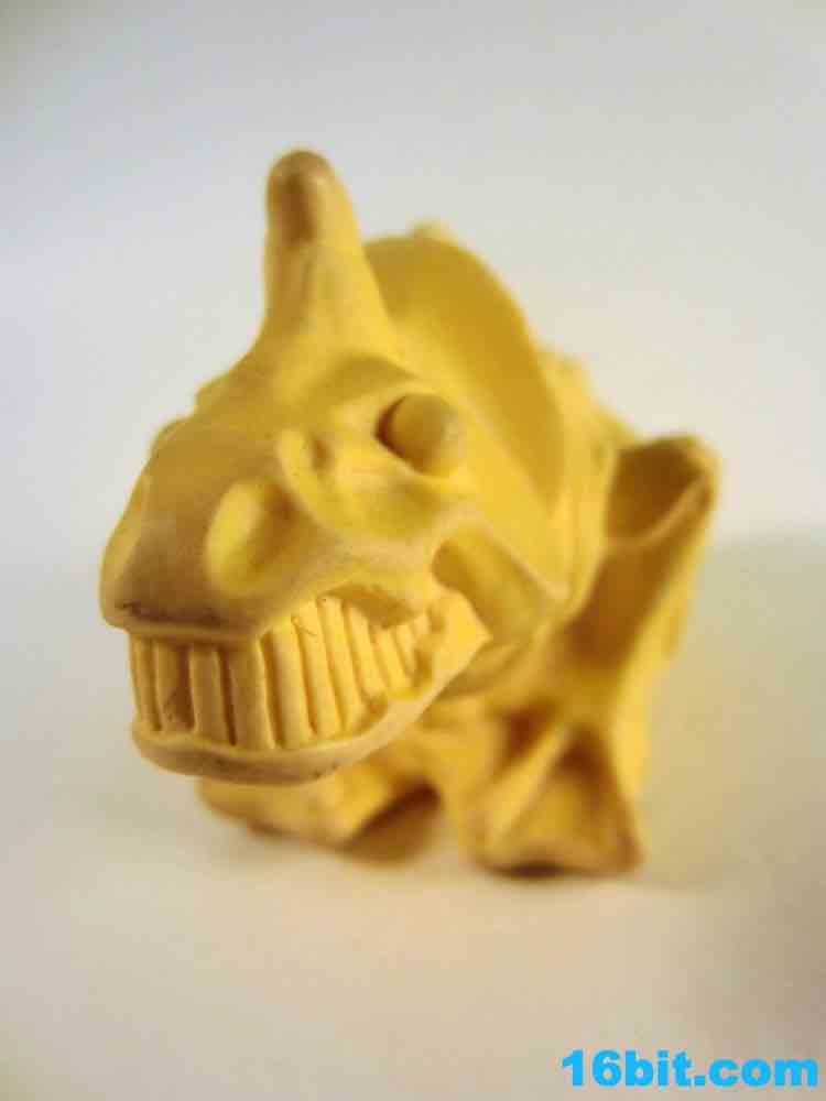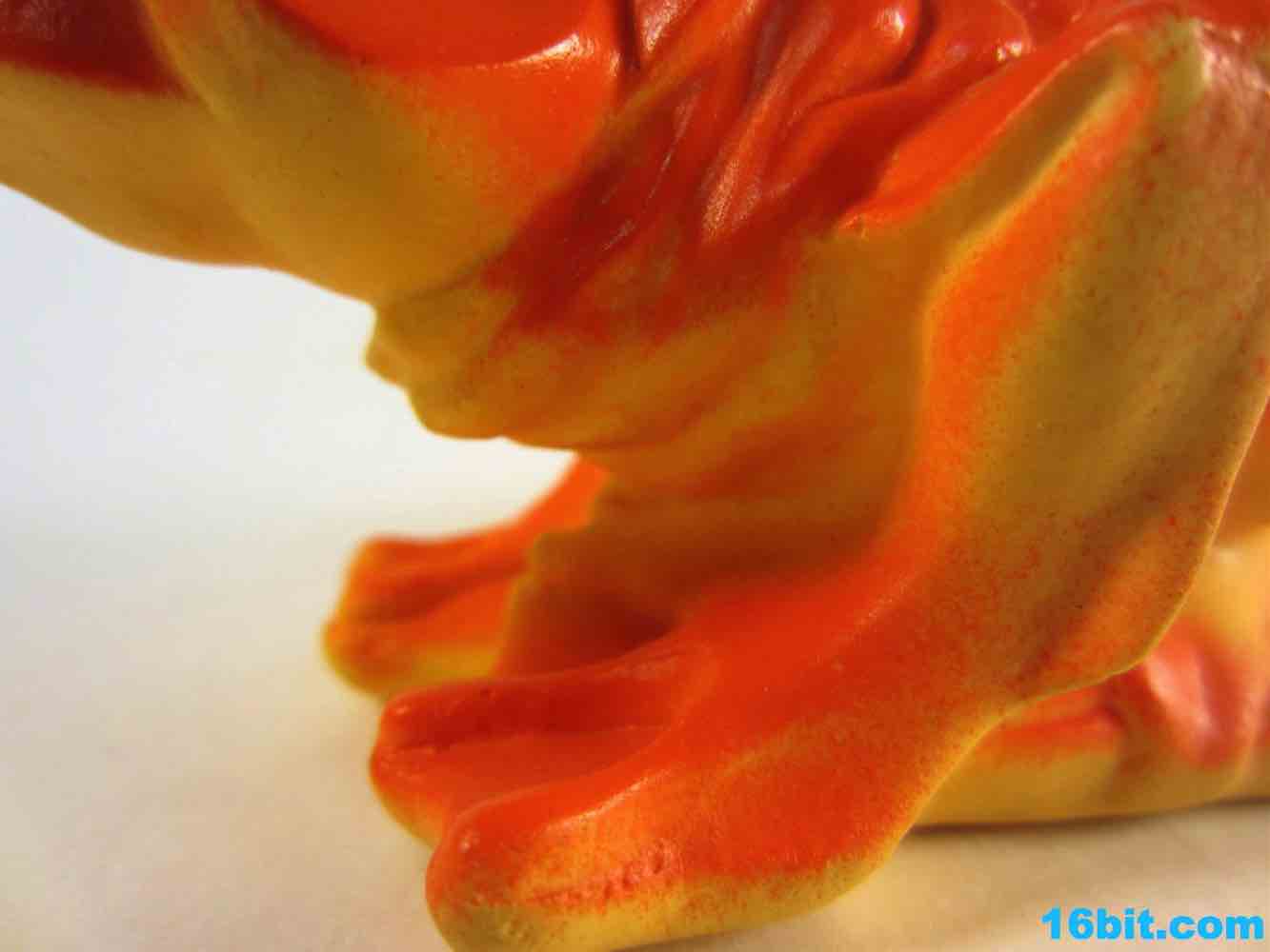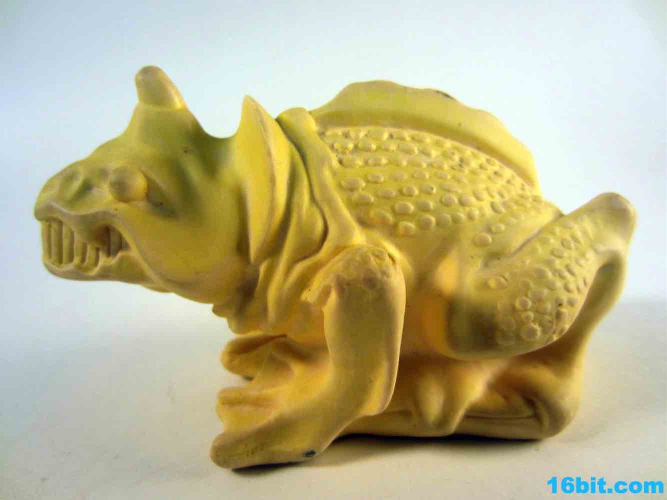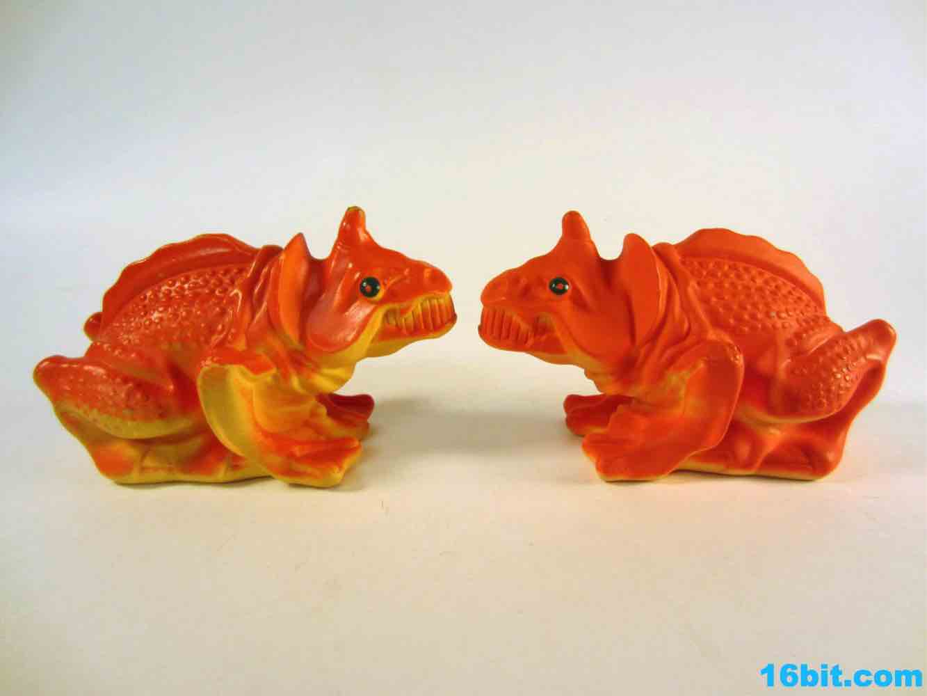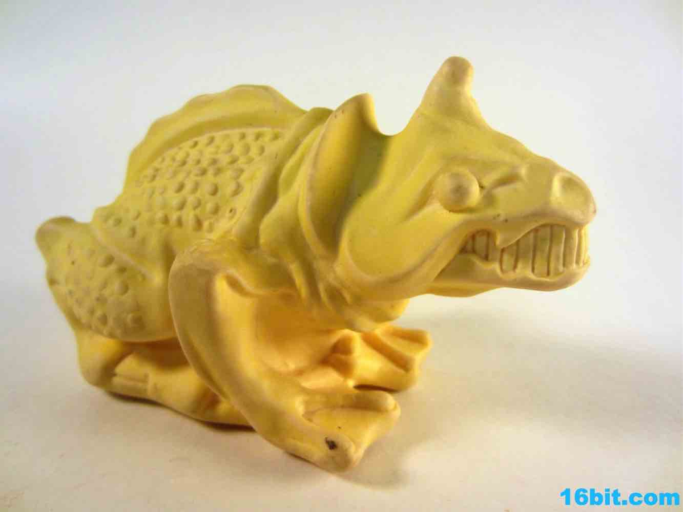 From my previous FOTD on the production piece: "The alien creature is effectively a non-squeaking squeak toy. It's hollow and has a hole on the bottom, and the frog/dinosaur hybrid is made of a soft, squeezable plastic. Molded in yellow, he has red skin and green eyes, plus some genuinely freaky teeth. I'm not sure what they were going for-- needles, baleen, or what... but it's unlike any other space toy I saw as a kid, and I always thought this was an amazing little creature. I've owned a grand total of three of these, and all have been colored this way-- however I have seen images online of one molded in orange plastic with green eyes, and I don't know what his story was."