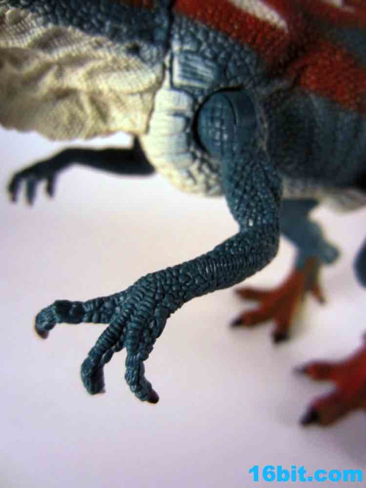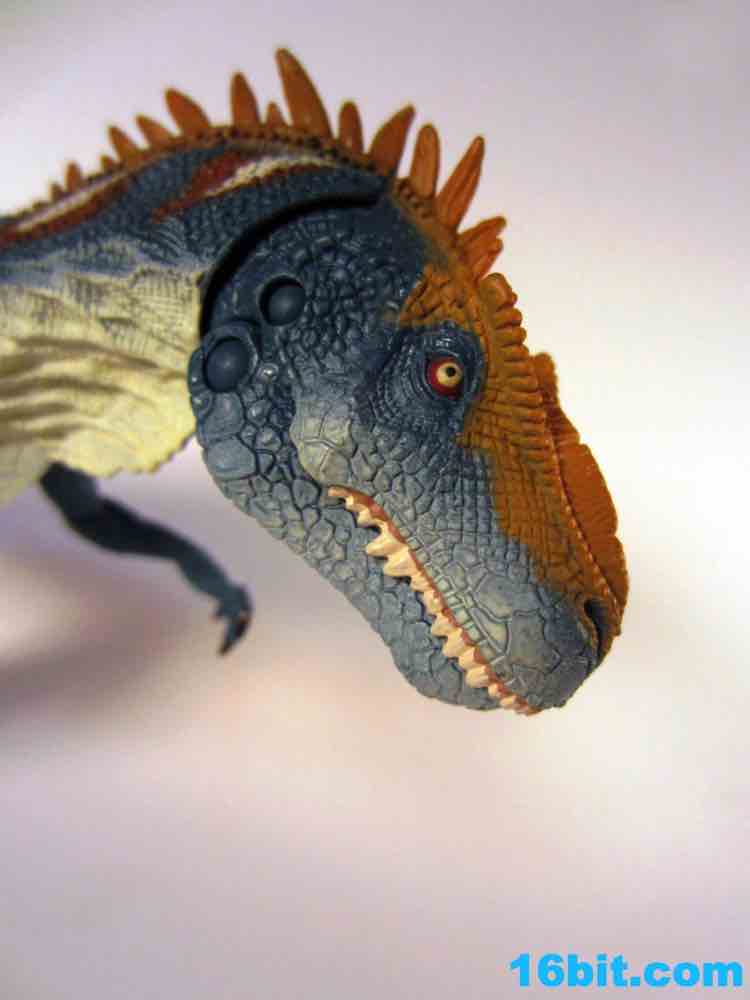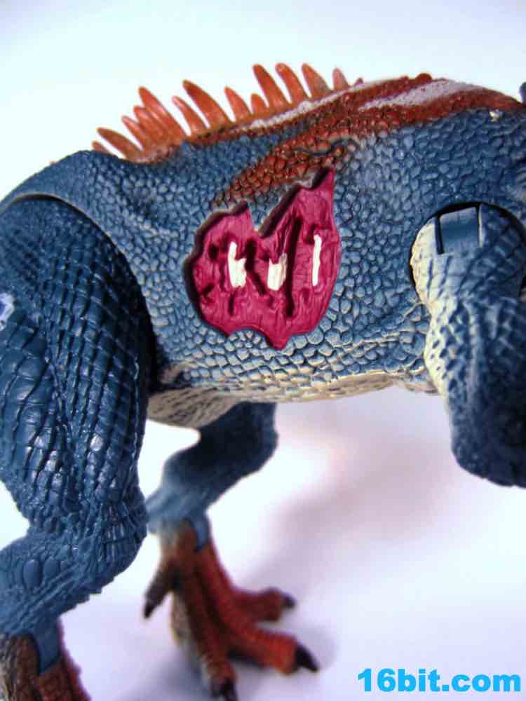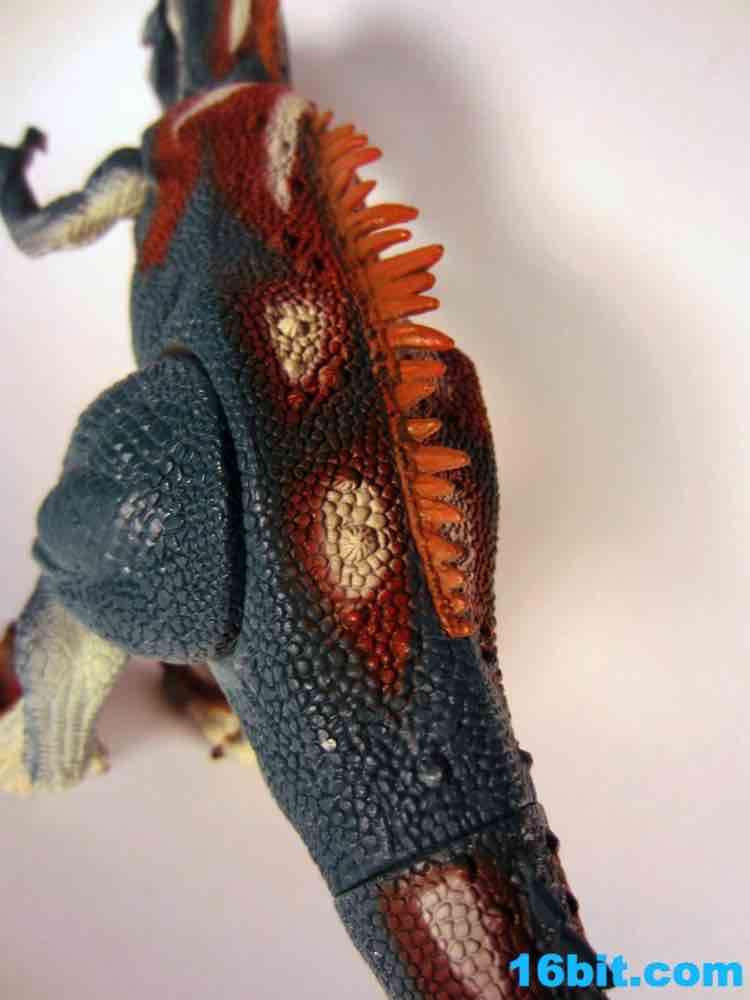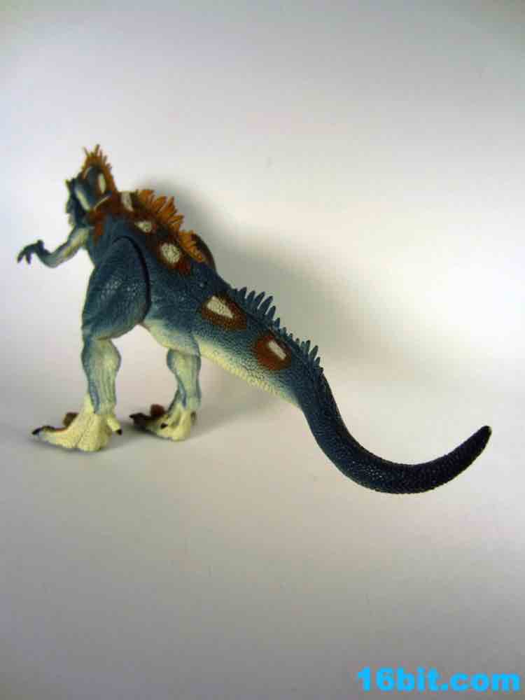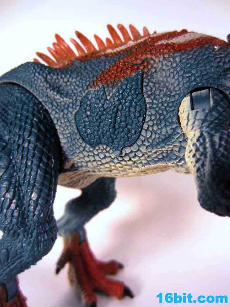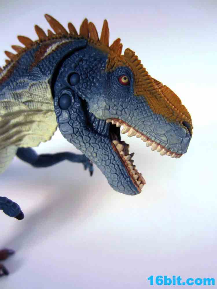An attempt at modernizing the Allosaurus, this toy has feather-like spines on his back and a colorful coat of paint bringing his excellent sculpt to life. He also has a ton of articulation, and may be the first dinosaur in the range to sport ball-jointed ankles and shoulders plus an articulated jaw. Previous dinosaurs tended to rely on rubbery plastic, Allosaurus has a couple of joints giving him the ability to look down as well as clamp his jaws shut if you're so inclined. This gives him some added personality, as does the optional removable hunk of flesh and exposed flesh wound.