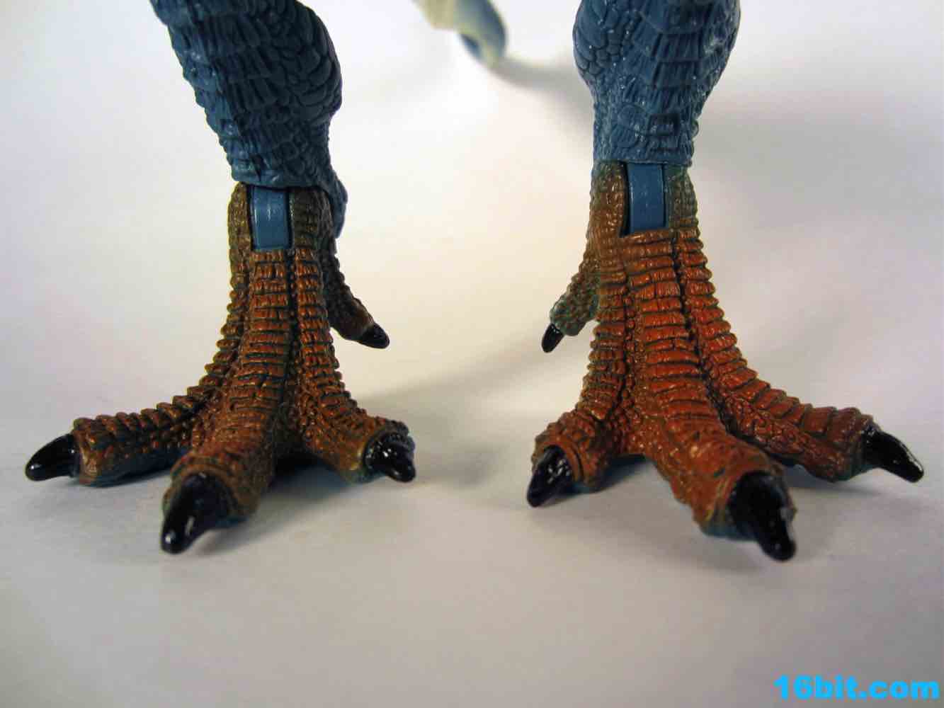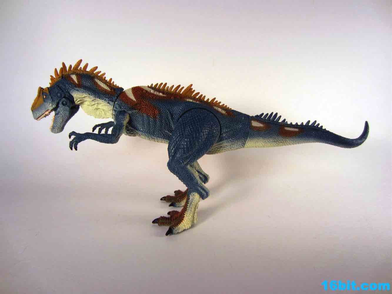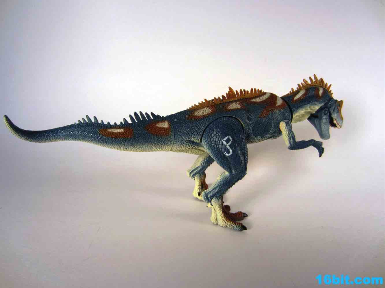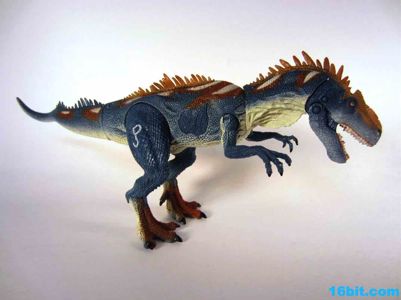 An attempt at modernizing the Allosaurus, this toy has feather-like spines on his back and a colorful coat of paint bringing his excellent sculpt to life. He also has a ton of articulation, and may be the first dinosaur in the range to sport ball-jointed ankles and shoulders plus an articulated jaw. Previous dinosaurs tended to rely on rubbery plastic, Allosaurus has a couple of joints giving him the ability to look down as well as clamp his jaws shut if you're so inclined. This gives him some added personality, as does the optional removable hunk of flesh and exposed flesh wound.