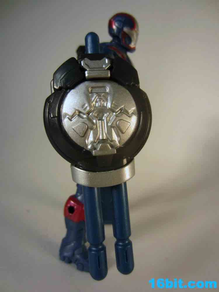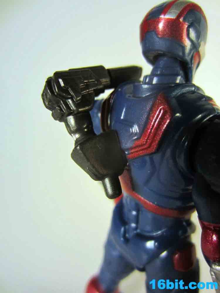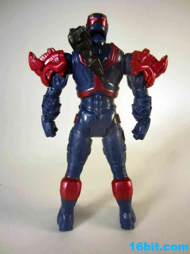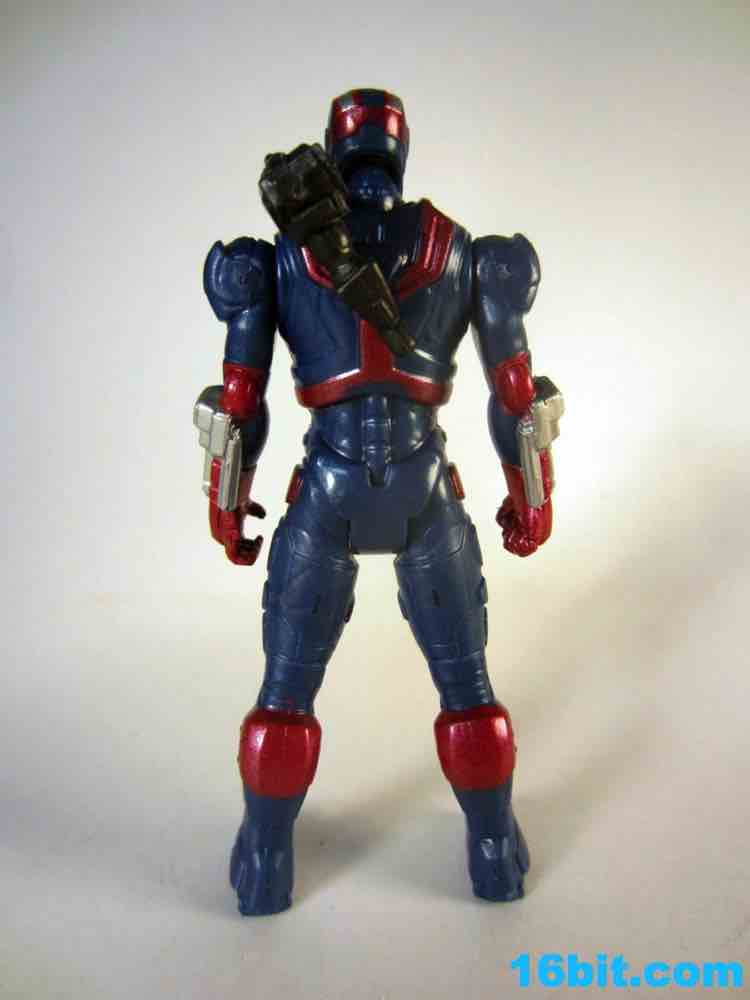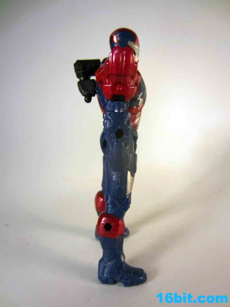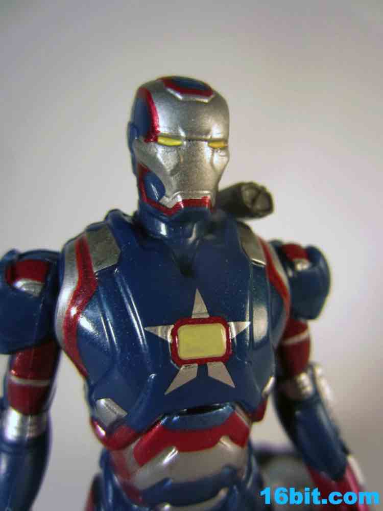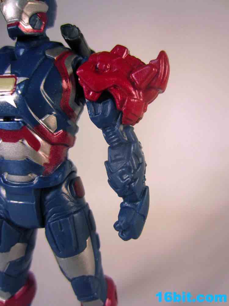 I like the sculpt, and the paint job is great. Were this exact figure released for five or six bucks without the swappable parts, it'd be totally worth it. Even for $10, it looks pretty good as Hasbro rendered it in blue plastic and added metallic silver and red paint which really do help to make it look more expensive. Unfortunately, the figure isn't as detailed or as accessorized or articulated as the Iron Man 2 figures. 5 points of articulation for $10 is not a good deal, even if it has a very nice heroic pose, a better-than-usual stance, and great proportions. This feels like a real toy, a superhero plaything I could have had when I was a kid. But the thing is, I'm old, and in 2013 I would expect this to either be cheaper or higher-tech. The paint job and sculpt are the parts which have improved since the last film, which is sort of a shame given the cost went up so much. The firing rocket is perfectly adequate, and can plug into holes on the figure's back, calves, forearms, or any other new place you deem him worthy to have an added orifice.