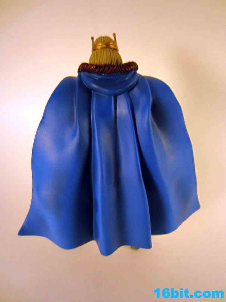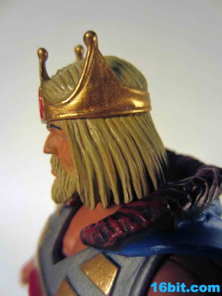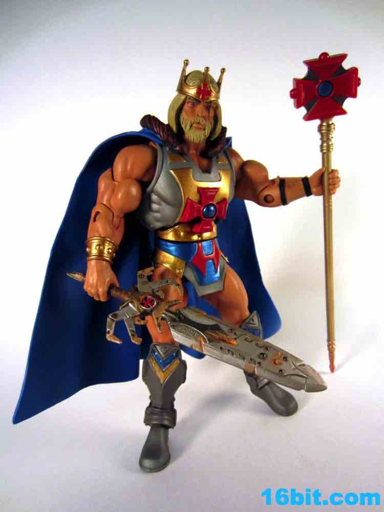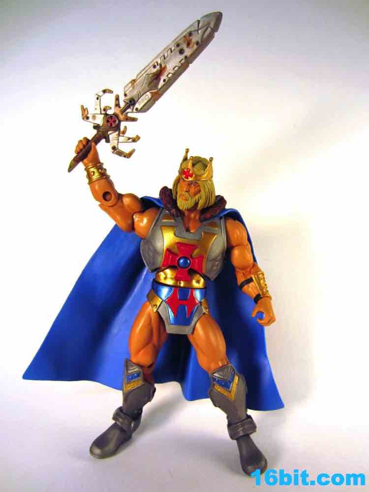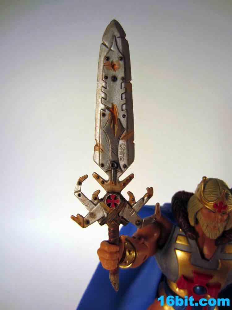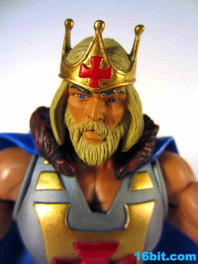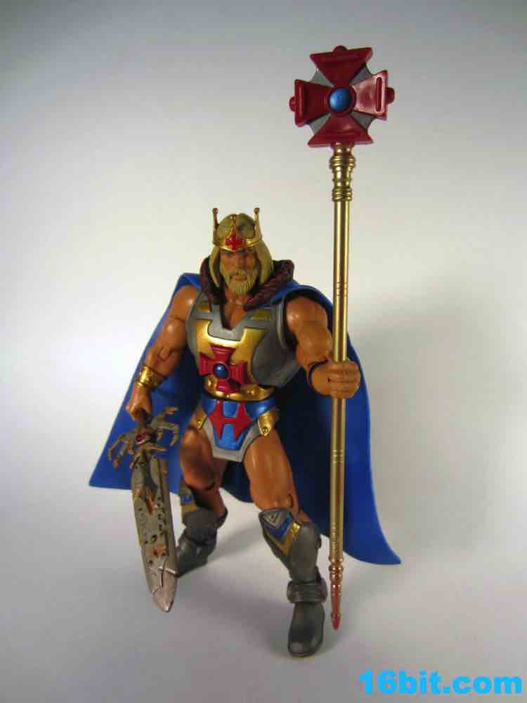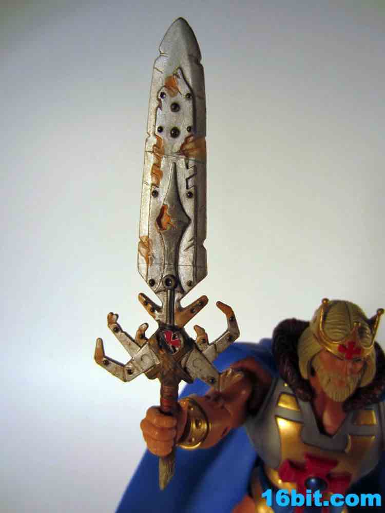 The figure is as exciting as its accessories. The nasty, rusted Electronic Power Sword looks incredible up close with a damaged wooden handle, all sorts of painted bolts, and dents galore. It's almost comically damaged, at this point I can't help but wonder just how effective a weapon it could be. Still, it looks awesome, and may be one of the best accessories this line will ever see. Had someone custom-made this and sold it to you for $20-$30 as a third-party product, you would probably hem and haw and cave in over the course of fifteen minutes. The king's staff has the classic cross symbol in red plastic, painted with a blue dot in the middle and a gold handle. It's difficult for it to be as awesome as the sword, but as staffs go it looks a little cooler than the other poles we've seen.