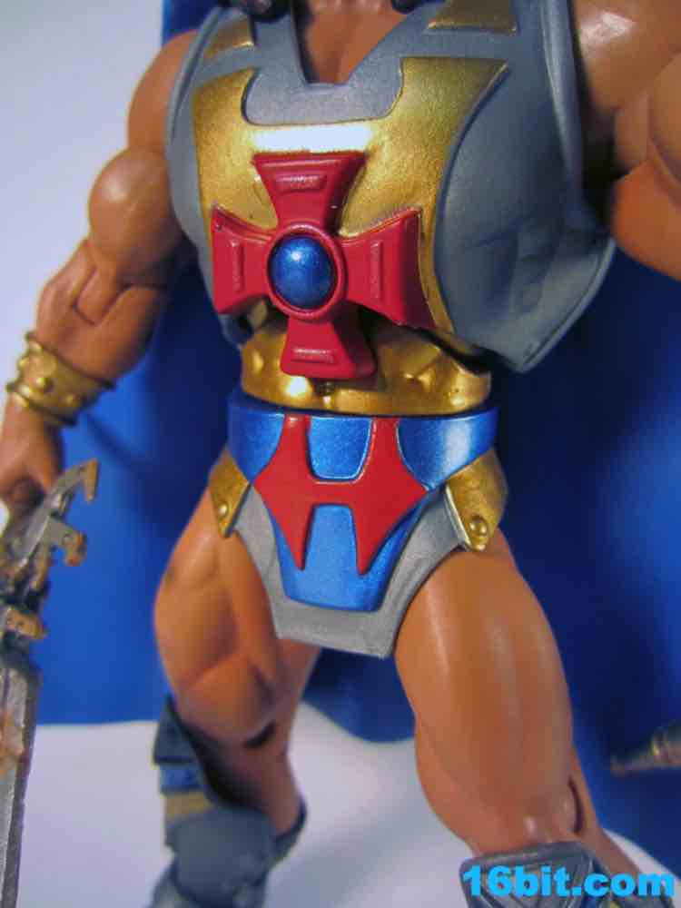The 7-inch figure's build and construction are par for the course, bringing you the kind of articulation and detail you love with great skin tones and bright colors. The figure has a gold torso, which you can see in between the H and the cross on his armor. It's basically a golden tank top, which looks sort of odd as, well, who has one so tight you can see if he's an innie or an outie? Still, it's pretty cool and matches the existing "Powers of Grayskull"-inspired He-Ro from the 1980s line quite nicely.