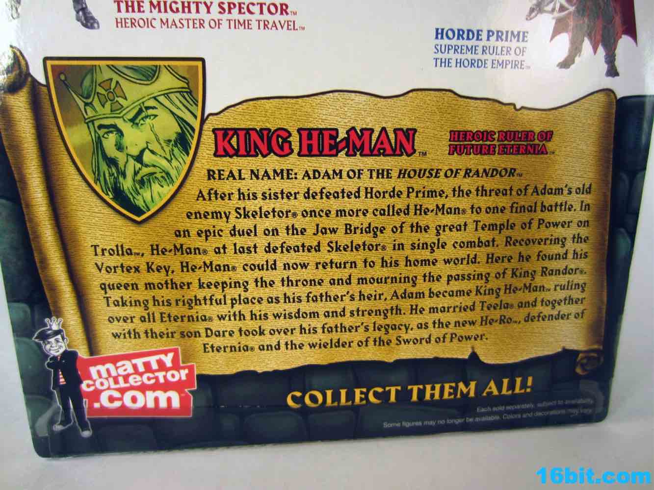 I was immediately delighted at the idea of King He-Man, because I (like many) love the idea of knowing that my childhood heroes grew up to do something with their lives rather than fade away, die, or be killed as a part of some unimportant skirmish. King He-Man comes labeled as a "He-Ro Son of He-Man" figure, which means that this is an era in which The Mighty Spector, Sir Laser-Lot, and Queen Teela which calls into question just who all is the Sorceress and what is her role in future Eternia. Well, we'll find out eventually probably. Mattel described King He-Man as the "Dark Knight Returns" He-Man, the old, haggard last-battle version of the character. His battle-damaged sword has tape wrapped around the handle, rist, and dents while a scarred eye and greying hair indicate that while he may be ruler of Eternia, his best days may be behind him.
