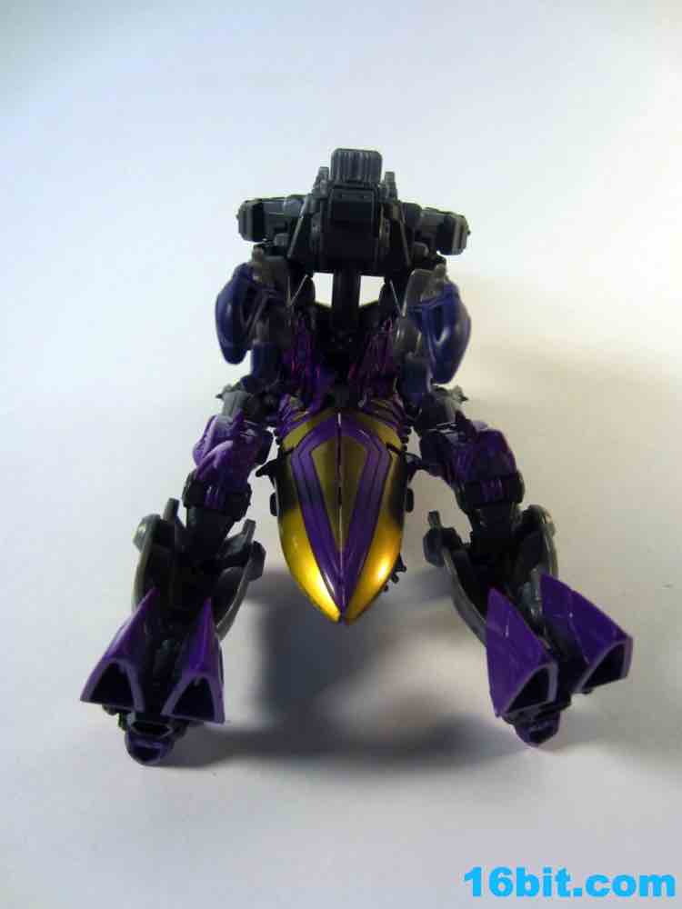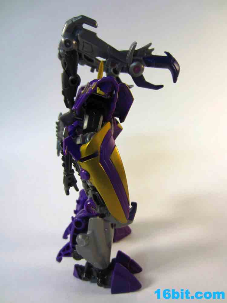 Like most of this line, the toy is best in robot mode. There's a ton of articulation all over, plus big claw-like hands, a couple of bonus claw arms on his back, lots of grooves and fans and vents, and the aforementioned launcher. It shoots really nicely, and seems out of place in Transformers because (let's face it) the vast majority of projectile weapons have been garbage, with weak ball shooters and few strong spring-loaded mechanisms. This one squeezes the disc out at a high speed, and it works well enough that it feels satisfying and fun to fidget with. Shooting it while the figure continues to hold it is sort of tricky, although this seems to be increasingly the norm with Hasbro's toys (see also: almost any G.I. Joe movie-based toy.)