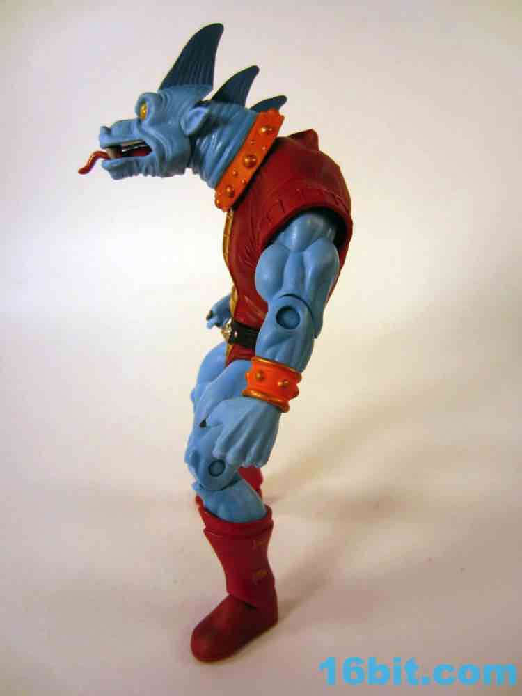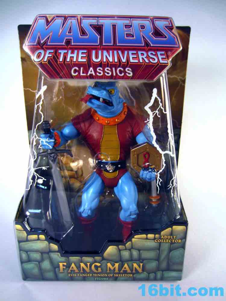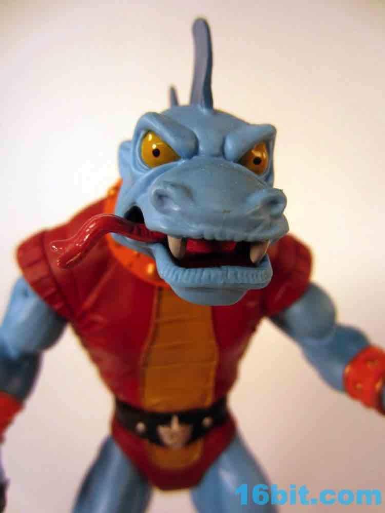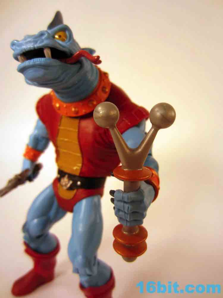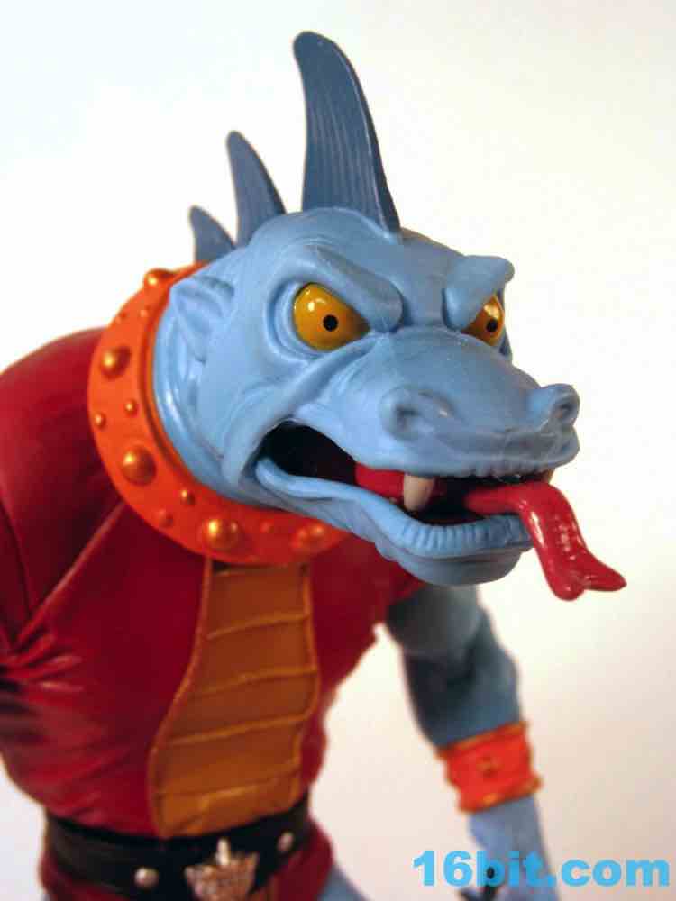 I can't honestly say I was super-pumped when Fang Man was shown, mostly because I didn't have the attachment to him as, say, Two-Bad. My lack of enthusiasm was completely misplaced as this is one great figure - the sculpting is delightfully cartoony while still true to the MOTUC line-up plus he's loaded with accessories and a nice bonus feature, an articulated tongue. You can really move it around, hanging out either side of his mouth or from in between his front teeth. Mattel makes some really expressive figures, but this dragon-based blue baddie actually has some options. You can open his mouth just a smidgen to move his forked tongue around, and that's a great feature to have.