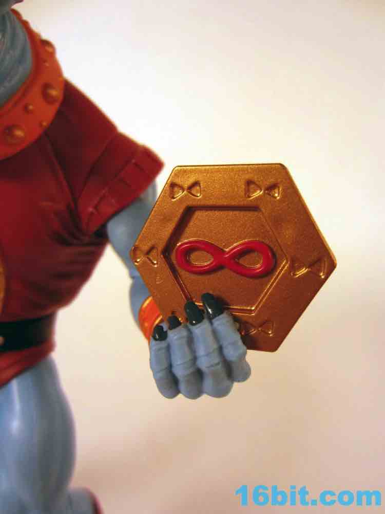 The figure's accessories are quite nice. The sword is big and log, with loads of detail like the aforementioned dragon face and a nice, pointed guard over his hand. The Wheel of Time is a little cheaper, with a hollowed-out back giving it a slightly cheaper feel. It still has an awesome facade, though. The last weapon is said to come from a Filmation animation style sheet. I've heard it called a mace, it looks like a slingshot to me. I'm not sure what it's for, but the circles around the grip have a nice Jetsons vibe which I'm sure were not intentional. It does make it look like a much more futuristic weapon, perhaps one belonging to Elroy. I dig it.