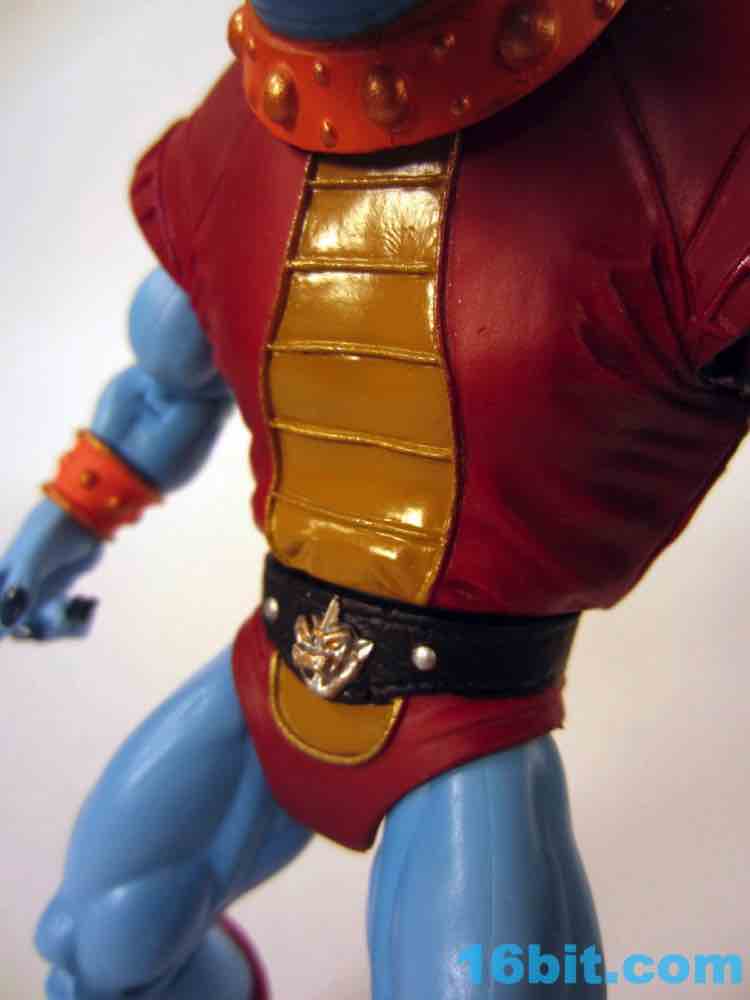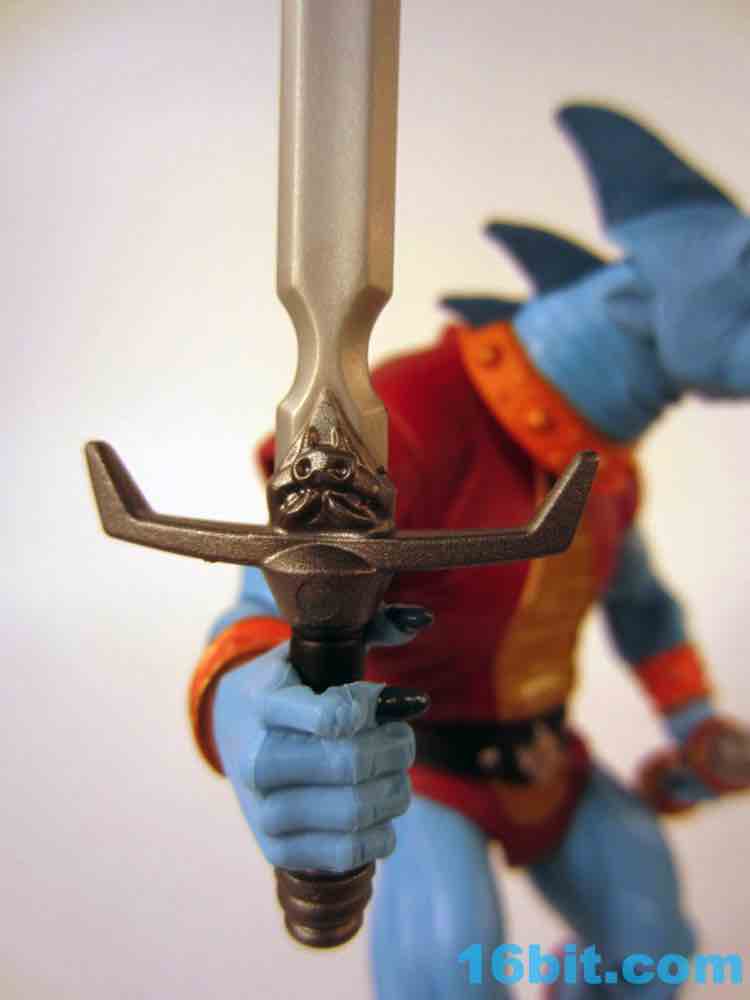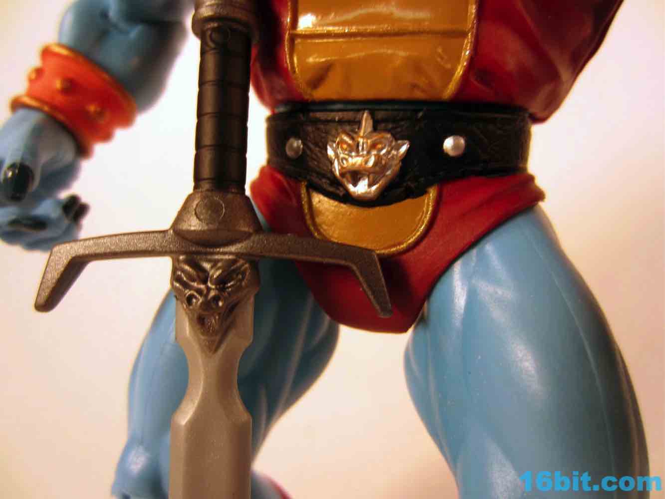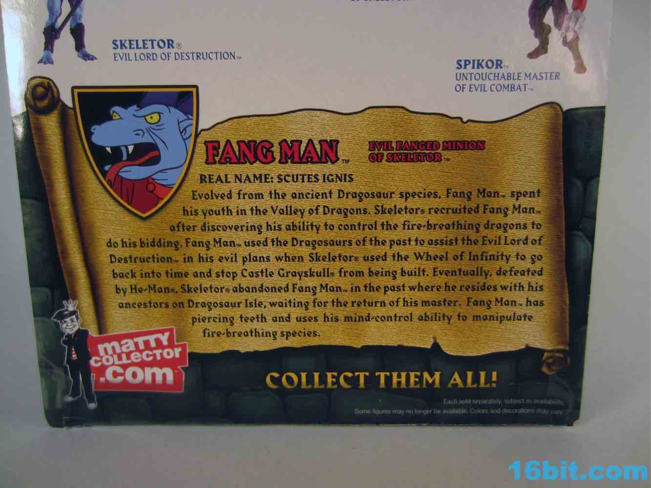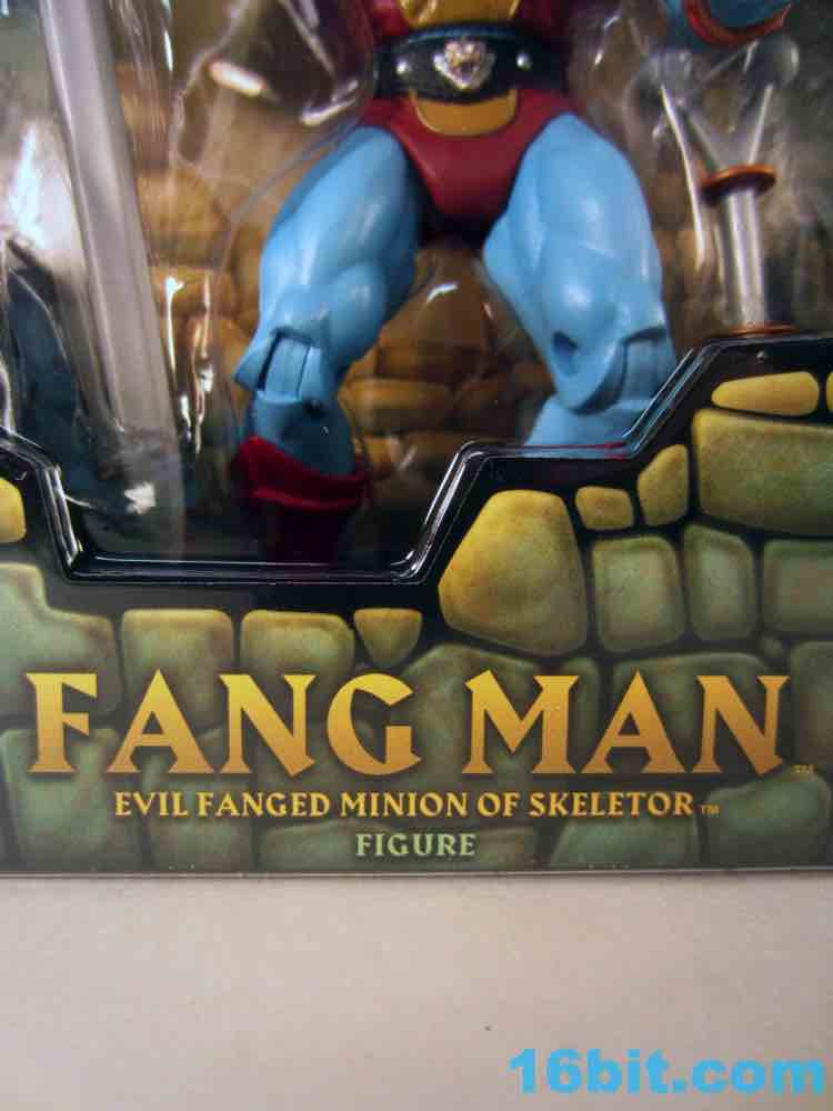 At about 7-inches tall, Fang Man sports three completely new accessories, a two-part head, a new costume, and a nifty new outfit. His belt buckle and sword feature the character's face, and the painted detail is really something. Big, yellow glossy eyes bring him to life, complimenting his open-mouthed sneer. The figure has a collar on his shirt with painted gold rivets, and those match his bracelets. There's not a lot going on with his boots, but that's OK because all of his weapons have a decent amount of paint on them. Fang Man has the basic MOTUC construction, and it's hard to fault him for much beyond his general rarity. For reasons unknown, Mattel made him a subscription-only figure. I assume those reasons may be cost-related.