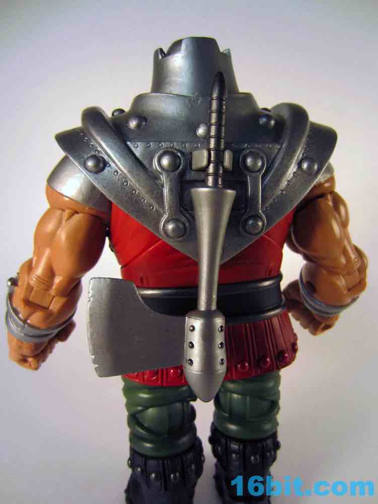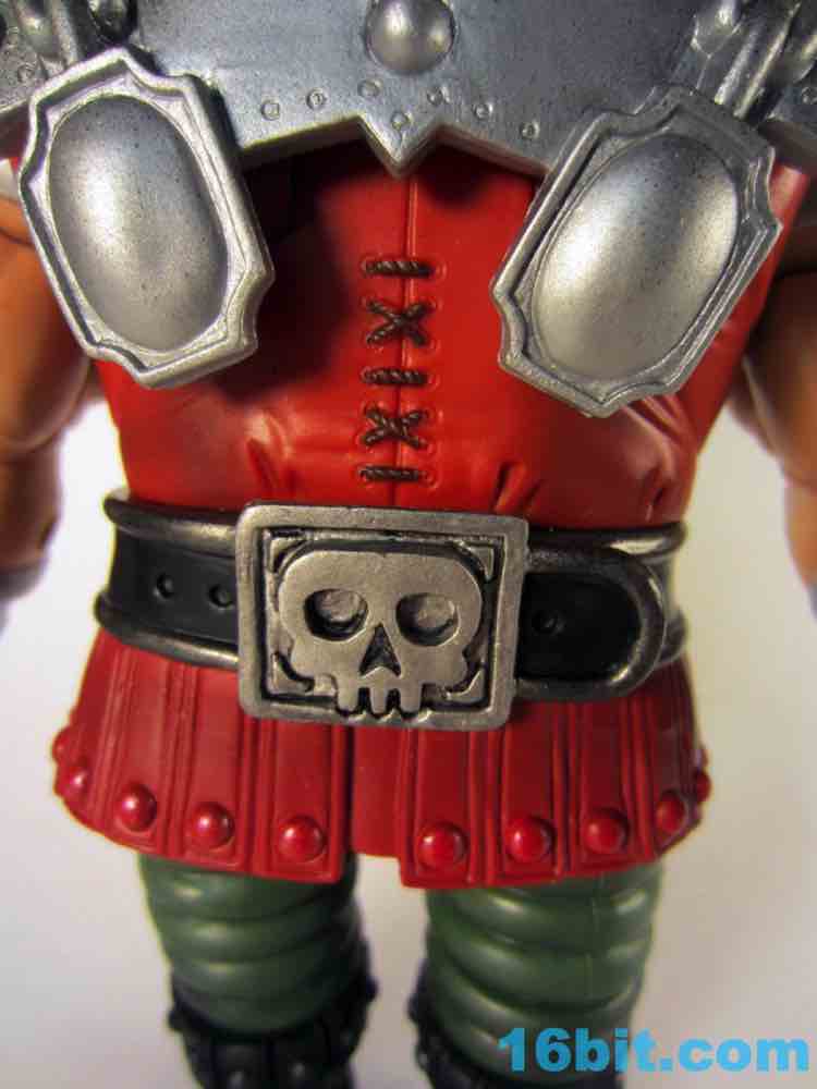 Not to be outdone is the body, which builds on the already strong design work of the 1983 original with a large skull belt buckle, massive silver shoulder armor, and even the clip on the back to carry his axe for when he's punching things. It's remarkable. Rather than wear snap-on outfits like most of the other figures, the red part of his upper torso is his body, complete with ab crunch joint. The silver part is glued on, and somehow they made his belt look like an actual belt - complete with a bit hanging off the side. Nice. His green legs look like springs, just like the original, except now they bend at the knee and have lateral movement at the hips. Depending on how you count, Rammy has at least 19 points of articulation. It's a wonder that it's only a couple of bucks higher than a standard figure given how much newness is here, which makes me wonder if we could get a ton of other all-new figures for an extra $3-$5 per. Not that we'd need to, for consistency's sake, but it has me hopeful for a few future unmade figures.