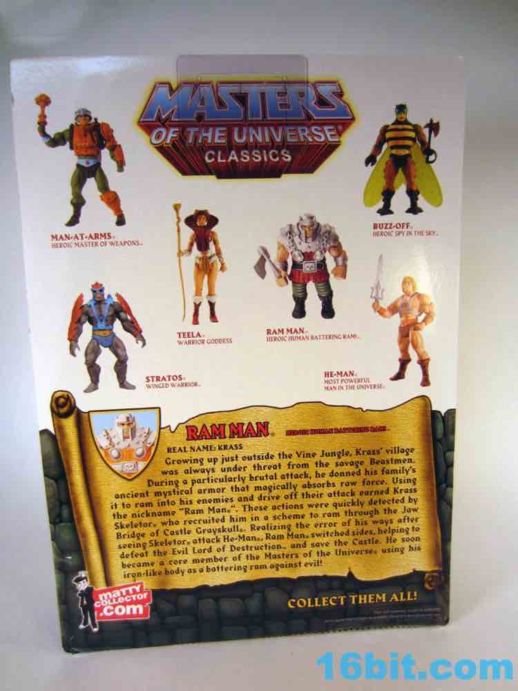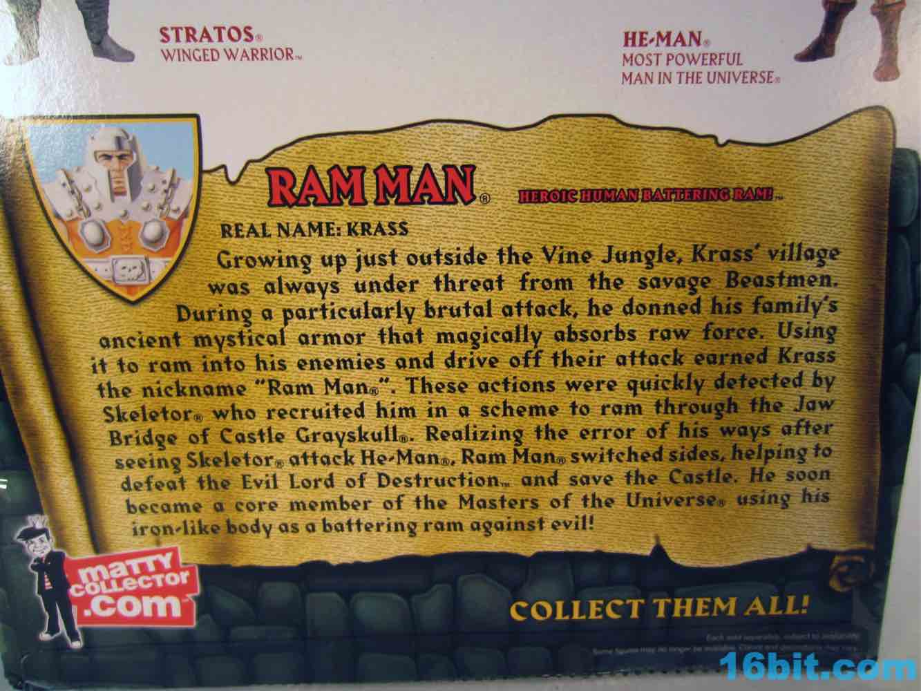 At about 7-inches tall, Ram Man is a rarity in that he's a completely new, 100% made-of-new-parts action figure. While wide, he could have fit in the standard-sized packaging... it would be an extremely tight fit, so instead Mattel opted to make a slightly larger cardback so he wouldn't have to be cramped, which leads to rubbed elbows, which leads to tears and much sorrow.