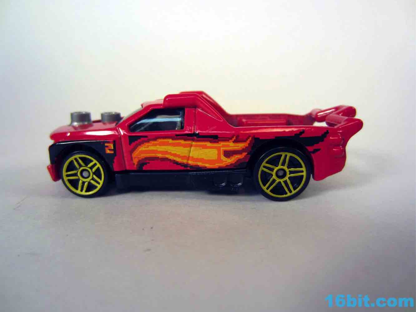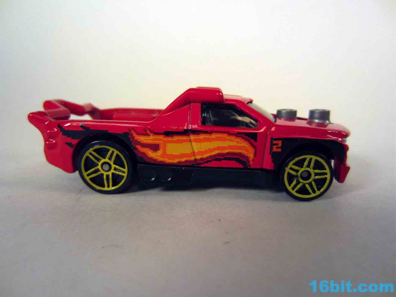 The bottom of the truck has a decorative hole (it can't grip a stud), while the top has four studs and at least 5 places on which you can grip a mini-figure. You should be able to squeeze about 8 figures on the Fig Rig, more if you add some plates and other pieces to build on the vehicle. It has an awesome 8-bit red, yellow, and black flame and a "2" painted on the side for reasons I don't fully understand, so it looks really cool. It's not perfect - but it's close. A figure standing behind the cab can bend over to grip 3mm rods above the door windows, but the angle is just a tiny bit off. If they were moved just a smidgen so the figure cold grip on for dear life this would be the greatest car of the year. Heck, it still pretty much is, I doubt Mattel has anything else this amazingly fun up their sleeve for the remainder of 2013.