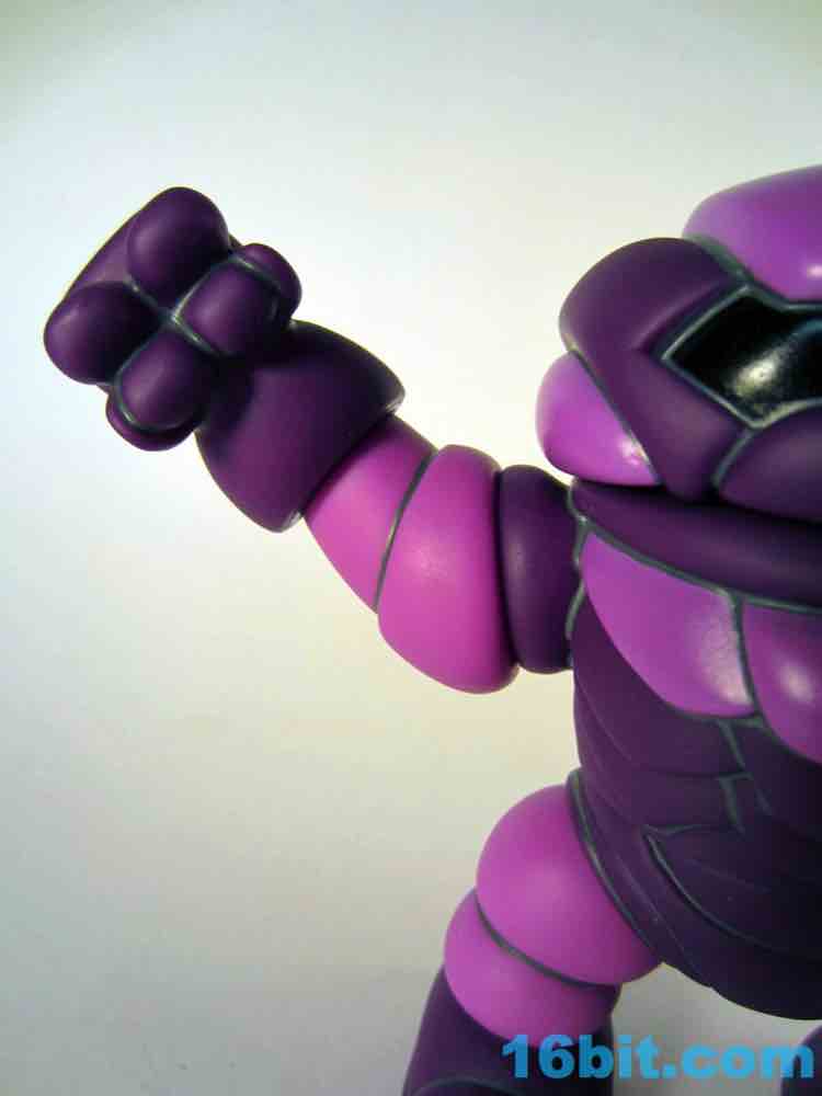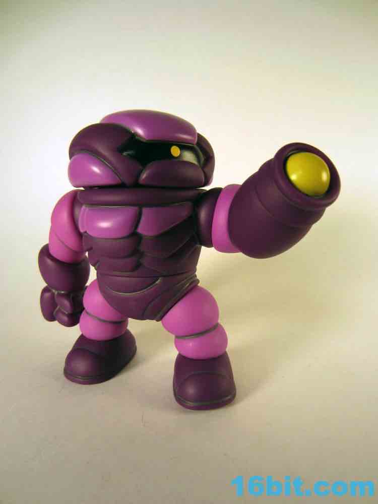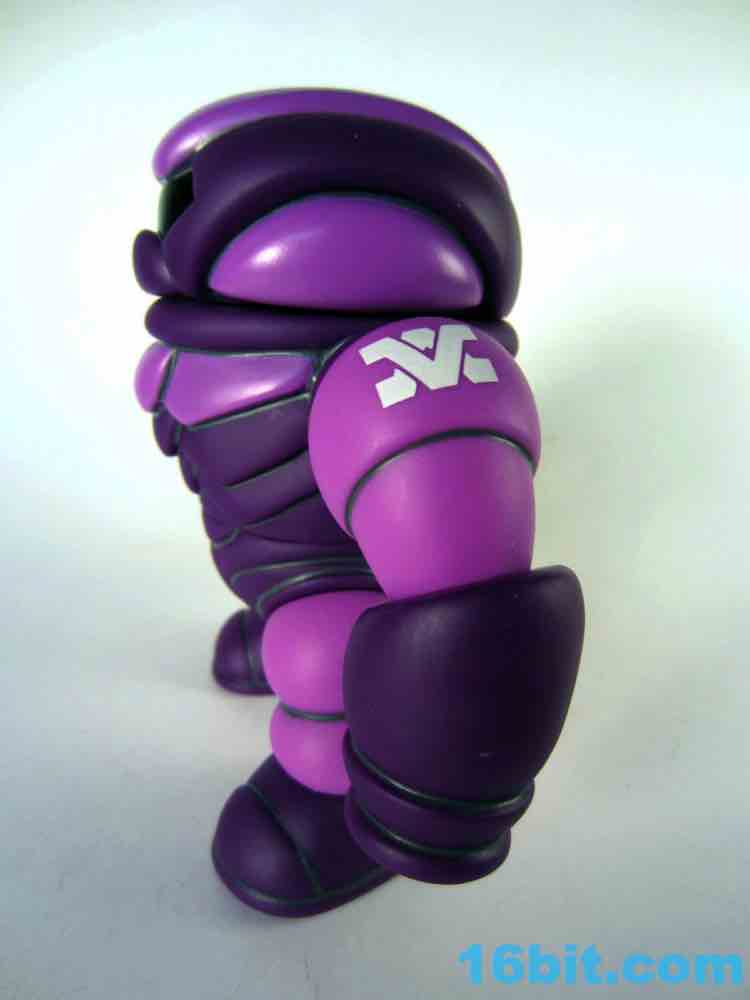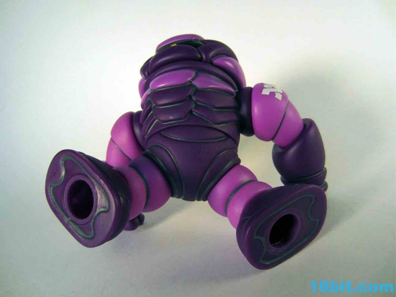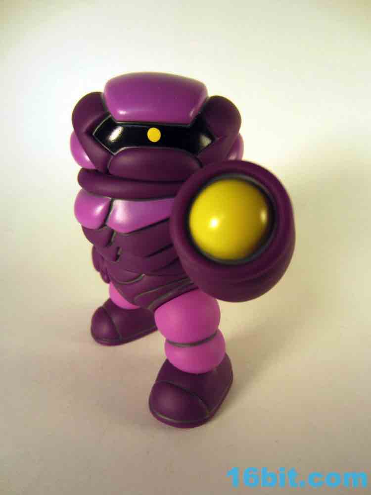 This beefy figure is unique in that it's the first Syclodoc to come with only one head, which should cause you less stress in terms of how to display it. The figure stands about 4 1/2-inches tall and is made of 11 pieces of hollow vinyl, giving our friend 10 points of articulation. He has more paint than the previous release, wth some added purple on the chest bringing out more color and mimicking the unique pattern on the original Transformers Shockwave toy. The yellow eye also pays homage to the original design, and the gun - now on the left fist - adds to the tribute. Since there's no real connection to the Decepticons, a symbol for Glyaxia Command appears on the left shoulder which is unusual as the previous (and subsequent) release had it on the right.