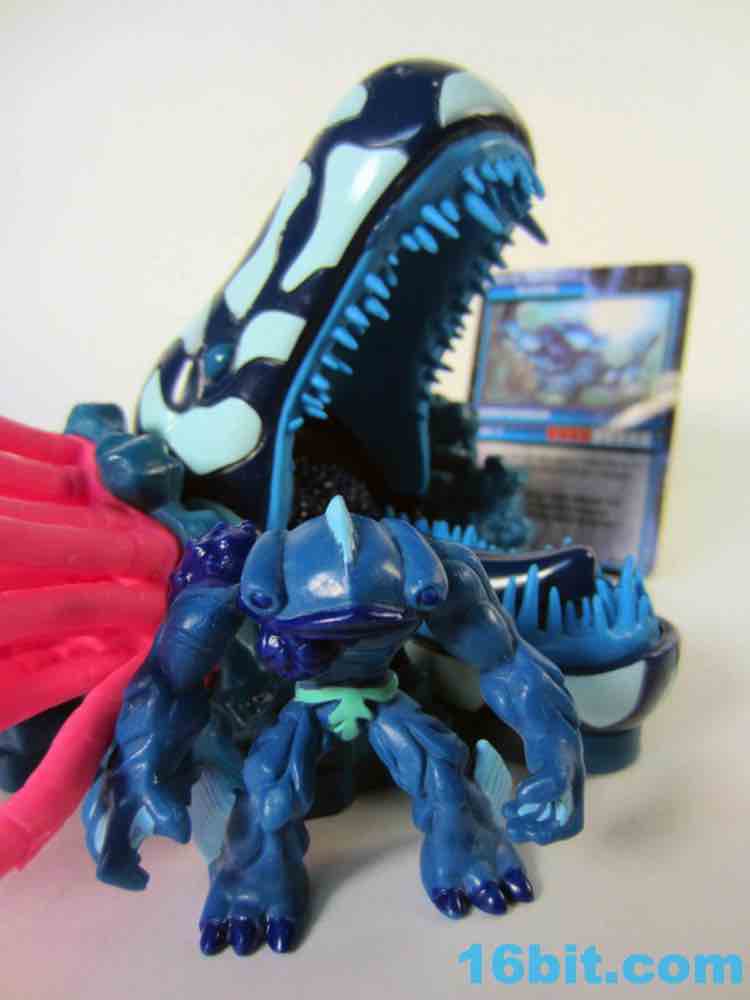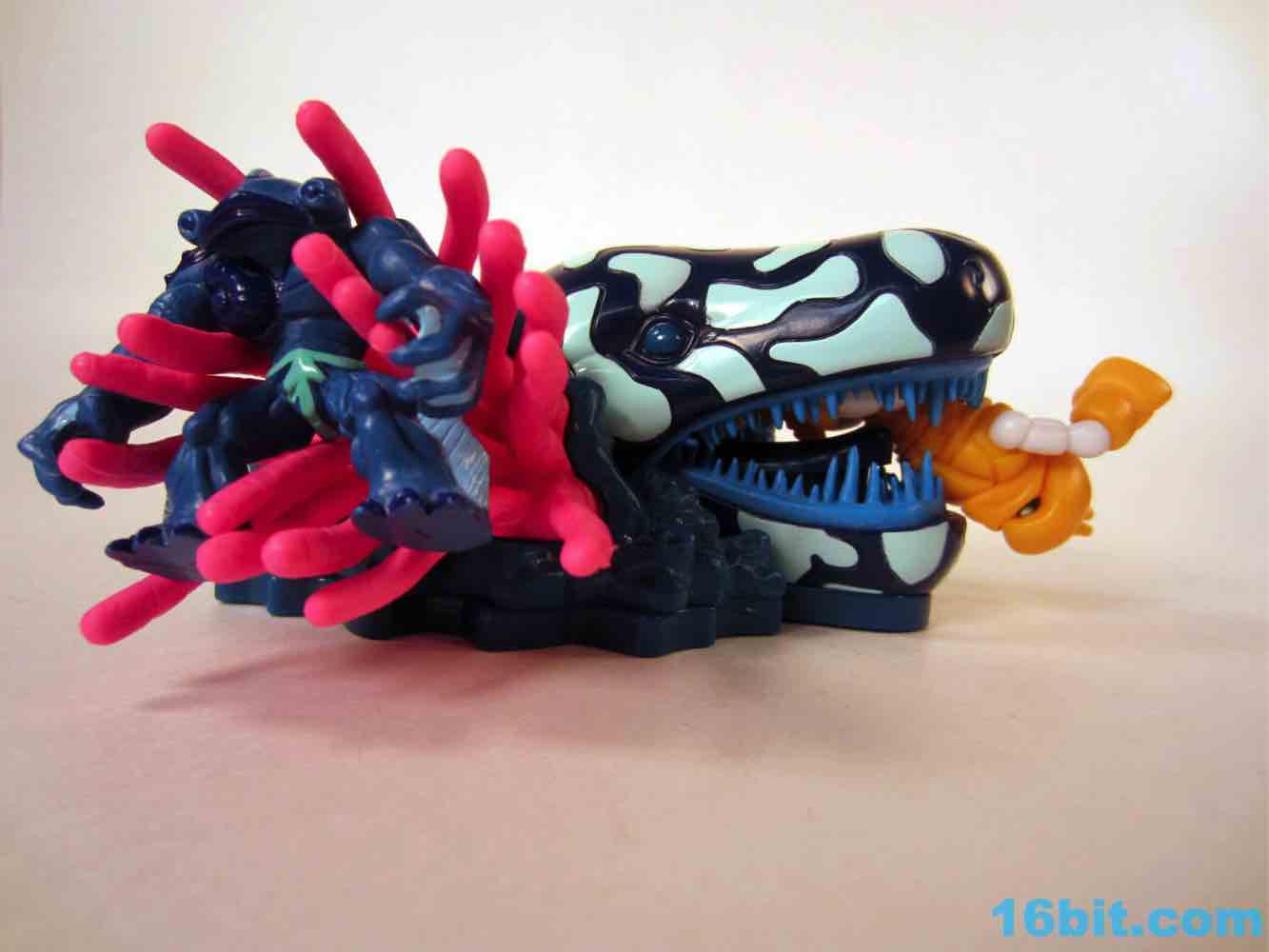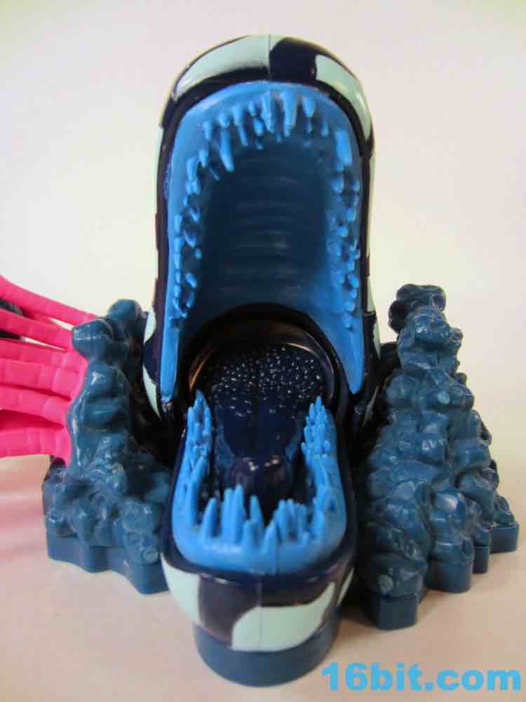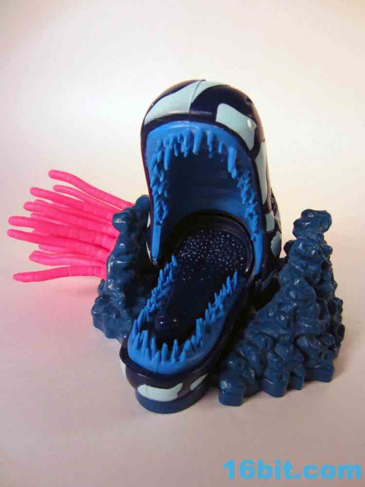 There's very little paint here, very pale blue on the skin and a little blue on the eye are the only deco on this toy, making it feel a little more like an older 1980s or 1990s plaything. (This is a plus.) The interior of the mouth has a huge, knobby tongue which acts as a switch to close the mouth. Just open the mouth until it clicks, and then push down on the tongue to "eat" smaller Gormiti or other figures. I think it might work well with the upcoming Mordles for the Rocks and Bugs and Things relaunch as well, as smaller figures like Fighter Pods fit right into its toothy mouth. I really wish a button off to the side controlled the jaw, but it's not like I can change anything now.