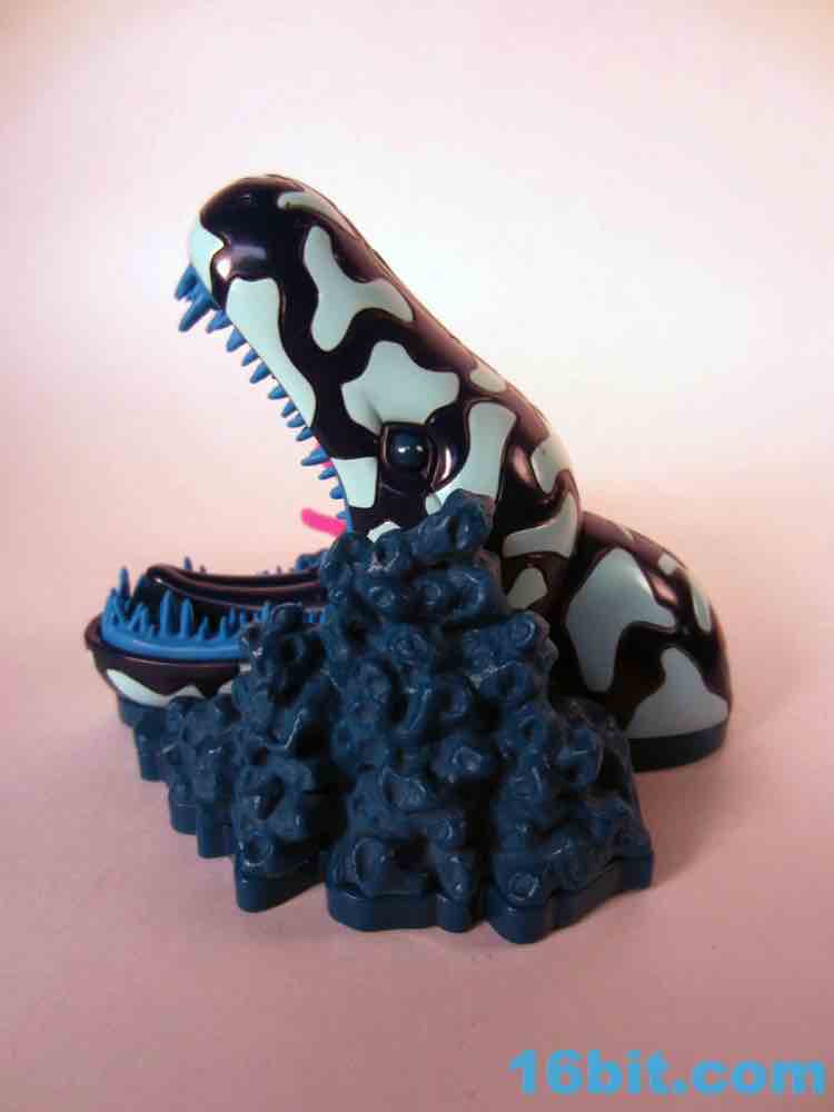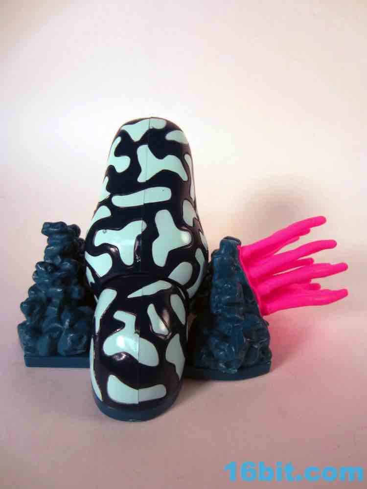 The playset is the main reason to buy the set, as the figure is basically half of a $5-$6 2-pack. While the other playset released here had numerous moving parts, reviews on Amazon were pretty abysmal. The Murena Den had no reviews on Amazon, but I can tell you it's a much sturdier and better-made toy that does a heck of a lot less. The thick plastic feels like it could take a beating, with rubbery "sharp" teeth and gums plus a pink coral trap off to the side. Mine had a fine, light whitish powder collect over the rubbery blue parts when I opened it in April of 2013... after I kept it around for about three years in the box. It cleaned right off with water using my shower head.