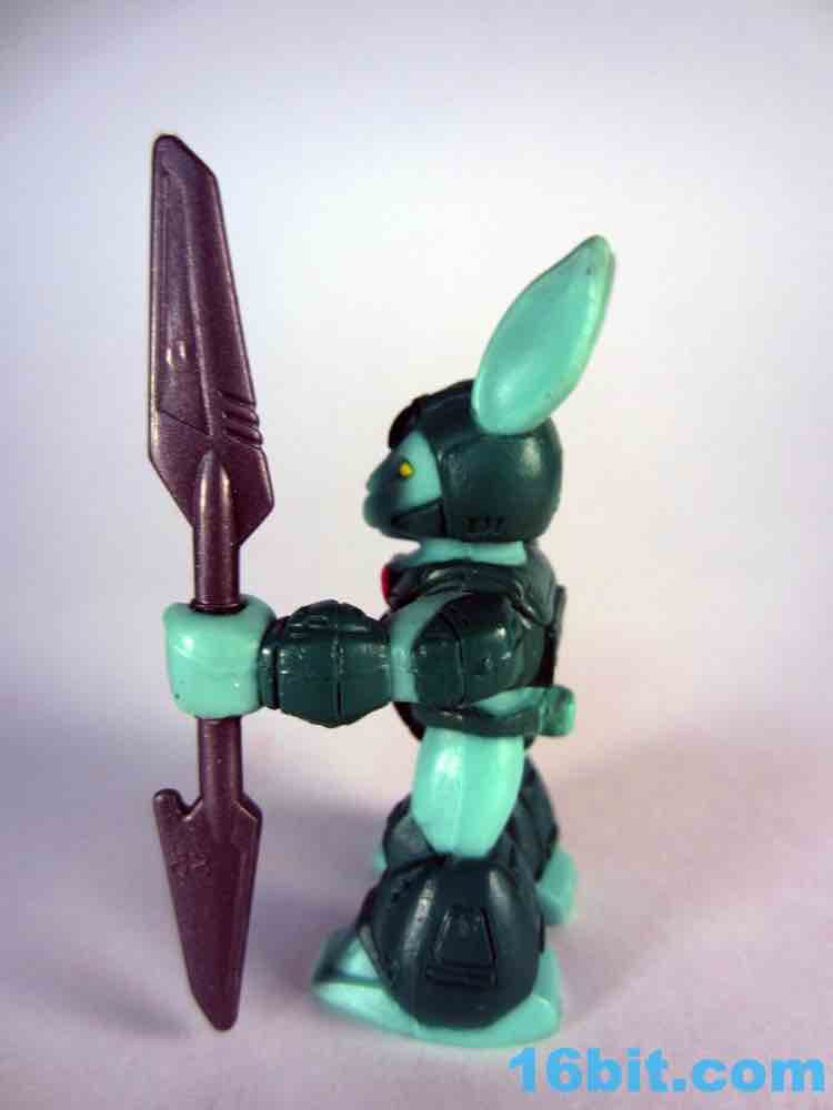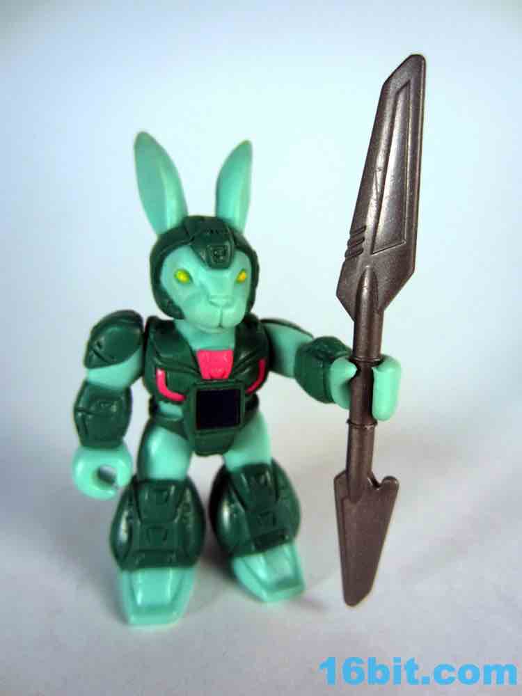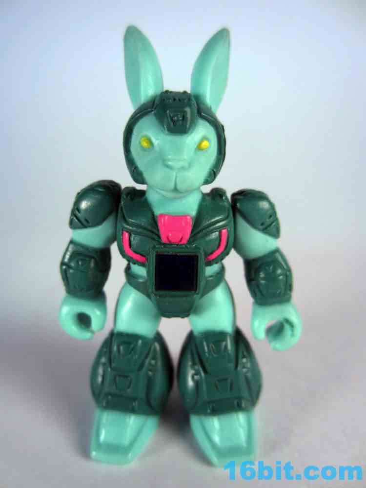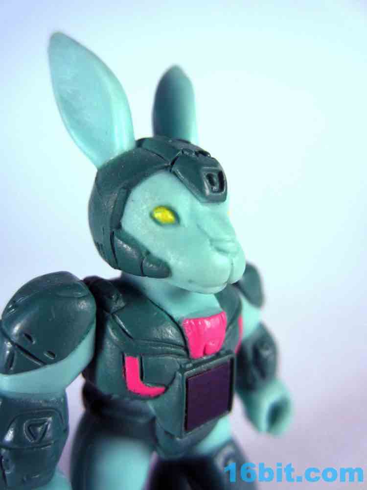 The figure exists in a world of 1980s toy logic that sadly rarely exists today. Many figures in this line look similar to their real-world counterparts, and then there are green rabbits and purple elephants. Having a green figure with green armor seemed like an odd choice, but extra pink and yellow highlights do a pretty great job bringing him to life. He has bright yellow eyes, a little round tail, a cute bunny nose, and a pair of pointy ears. Other than whiskers and buck teeth - which may make him look too comical - the sculptors did a bang-up job making a pretty decent rabbit warrior figure. As a series 1 figure there's not too much sculpted detail, but there are robotic lines and panels on his armor, some pink wires, and mechanized shoes which match the color of his skin for some reason.