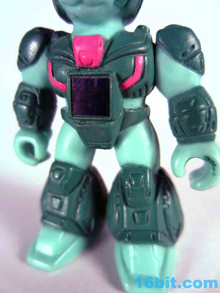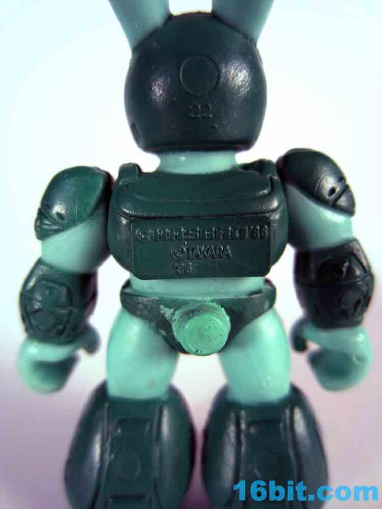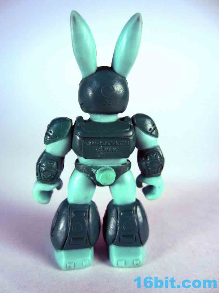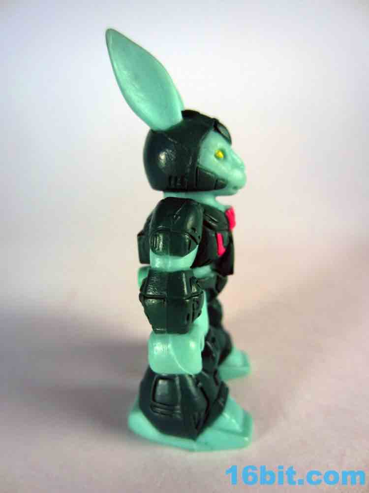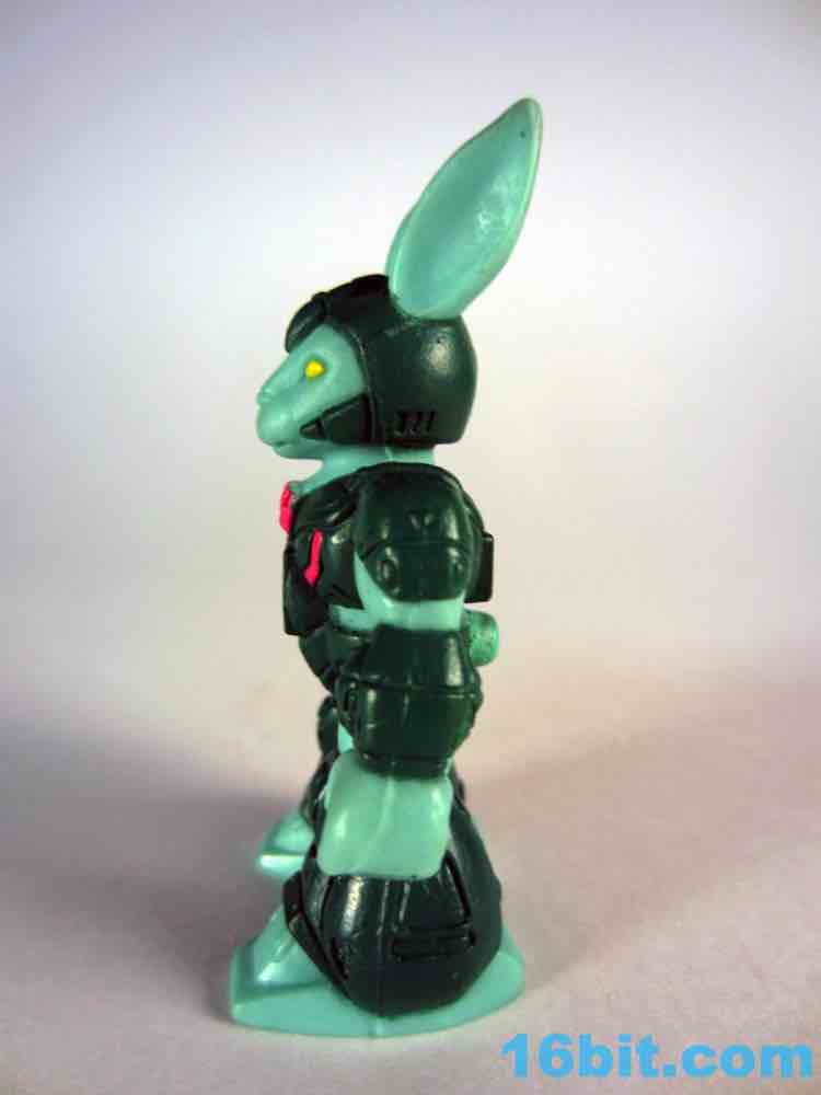 The figure exists in a world of 1980s toy logic that sadly rarely exists today. Many figures in this line look similar to their real-world counterparts, and then there are green rabbits and purple elephants. Having a green figure with green armor seemed like an odd choice, but extra pink and yellow highlights do a pretty great job bringing him to life. He has bright yellow eyes, a little round tail, a cute bunny nose, and a pair of pointy ears. Other than whiskers and buck teeth - which may make him look too comical - the sculptors did a bang-up job making a pretty decent rabbit warrior figure. As a series 1 figure there's not too much sculpted detail, but there are robotic lines and panels on his armor, some pink wires, and mechanized shoes which match the color of his skin for some reason.