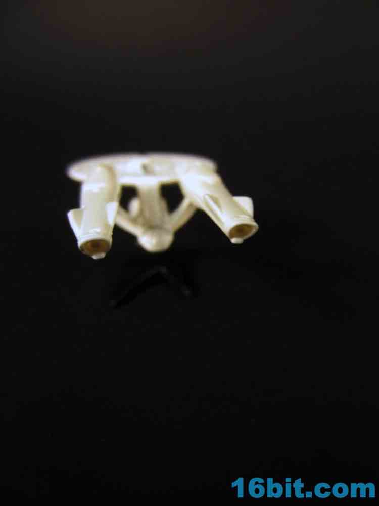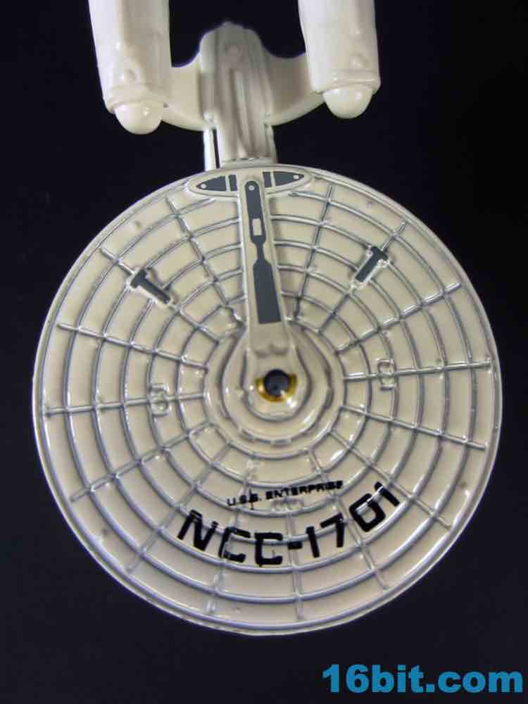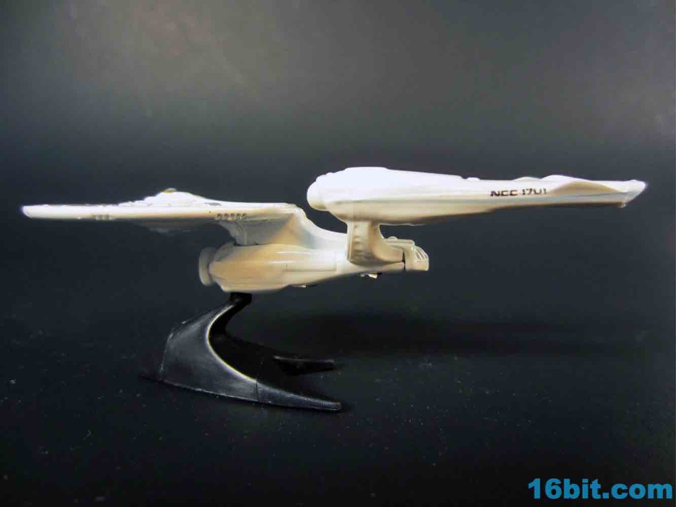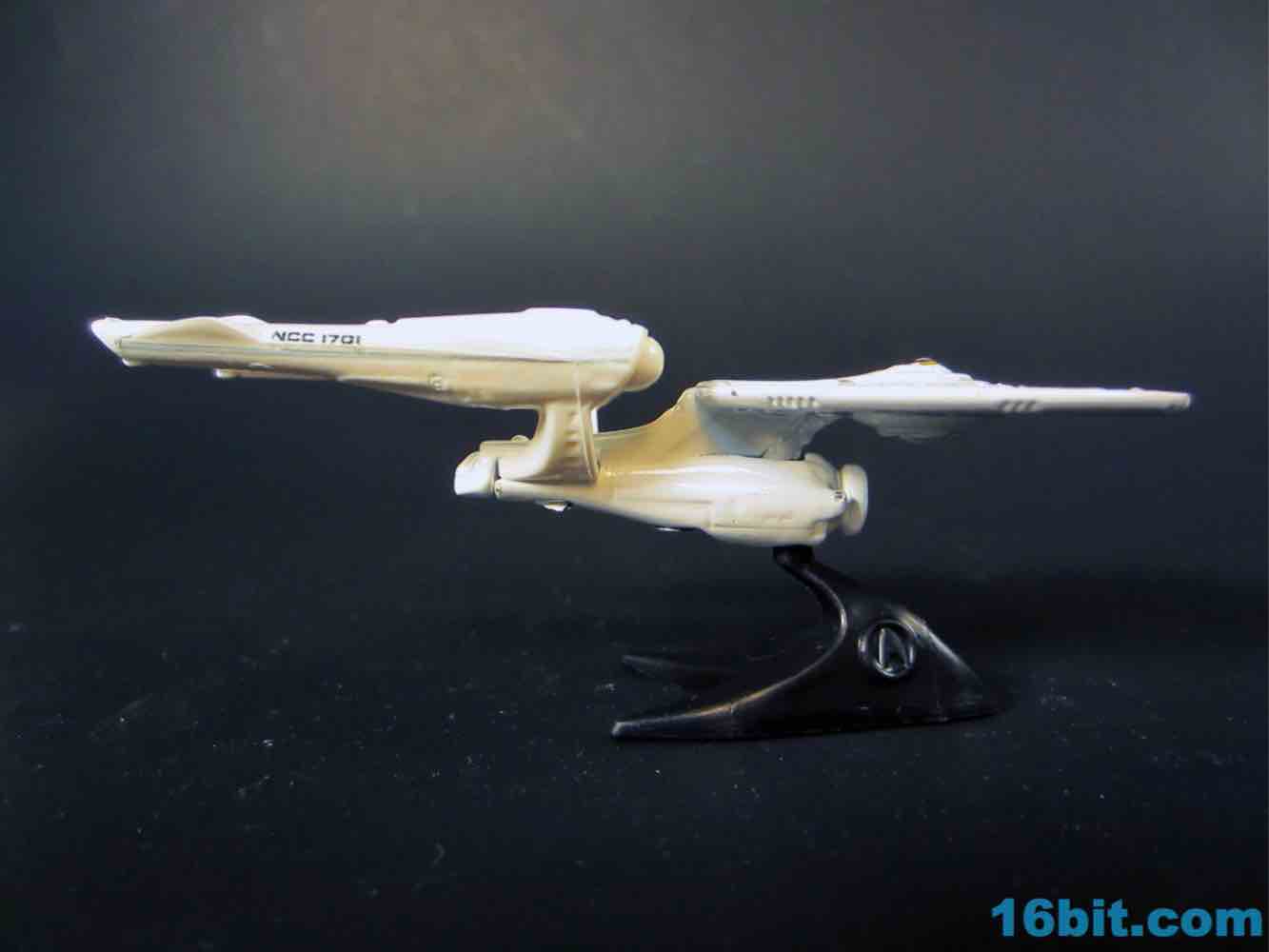 This particular size of vehicle is pretty unusual for Mattel's Trek license, and it fits in with the normal $1 cars on the shelves. Obviously it's not scaled to them, but it's also $1 and what the heck do you want for a buck? The vehicle is mostly white, with a metal body and saucer with plastic nacelles and struts. The display stand is plastic and unpainted, with a Starfleet symbol on one side and the other largely blank.