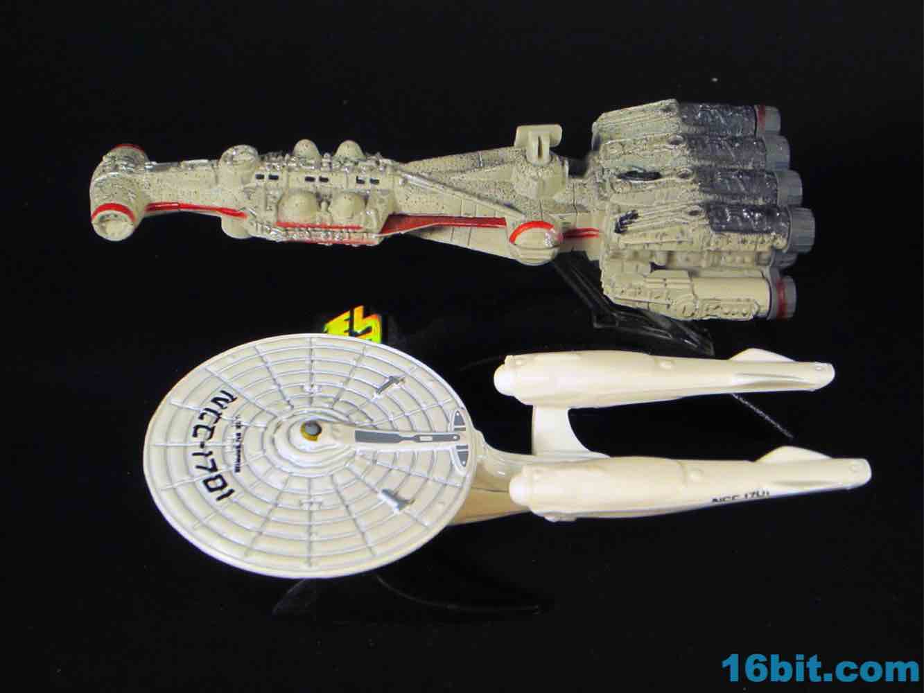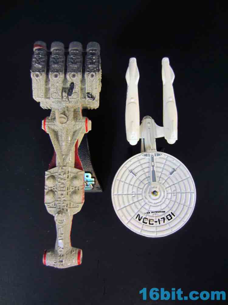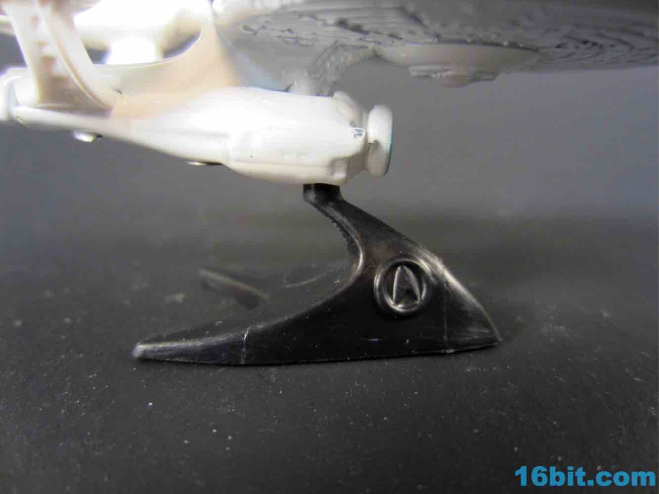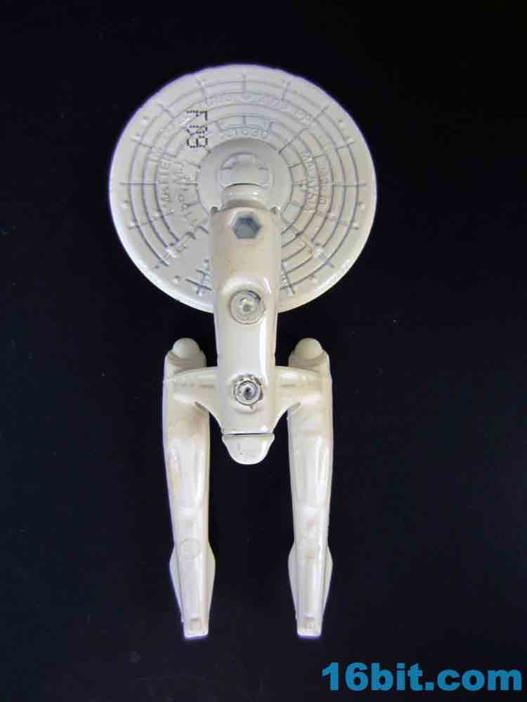This particular size of vehicle is pretty unusual for Mattel's Trek license, and it fits in with the normal $1 cars on the shelves. Obviously it's not scaled to them, but it's also $1 and what the heck do you want for a buck? The vehicle is mostly white, with a metal body and saucer with plastic nacelles and struts. The display stand is plastic and unpainted, with a Starfleet symbol on one side and the other largely blank.
