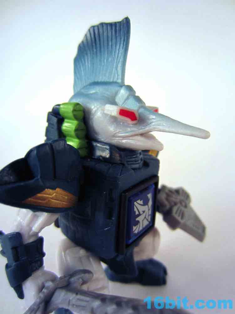 I'm a sucker for aquatic creatures, so the Swordbill figure was right up my alley. The fact that he wears crazypants, "I'm Griff's henchman buddy in 2015" glasses is a nice bonus. The goggles are huge and goofy, I suppose their inclusion was to give this creature the kind of stereoscopic vision that we humans enjoy. You know, by not having eyes on the sides of our head. For all I know they're really x-ray spex, but only Polly knows for sure and she's dead.