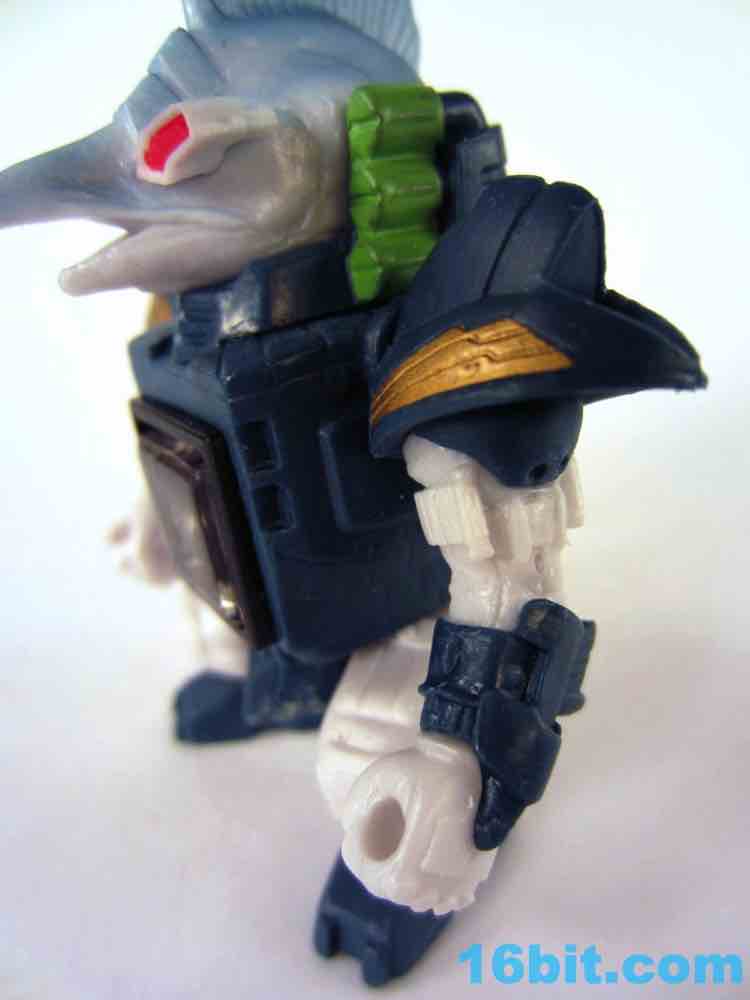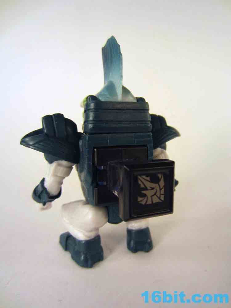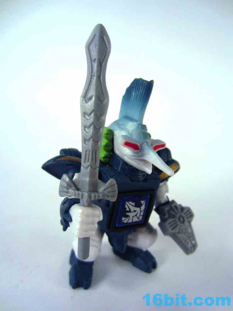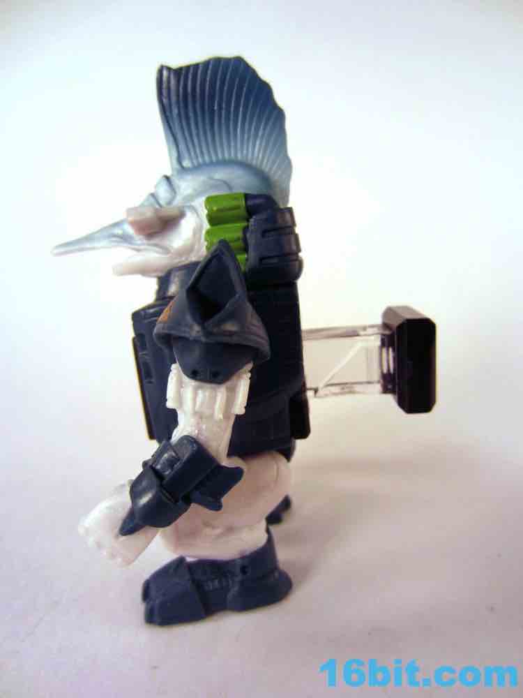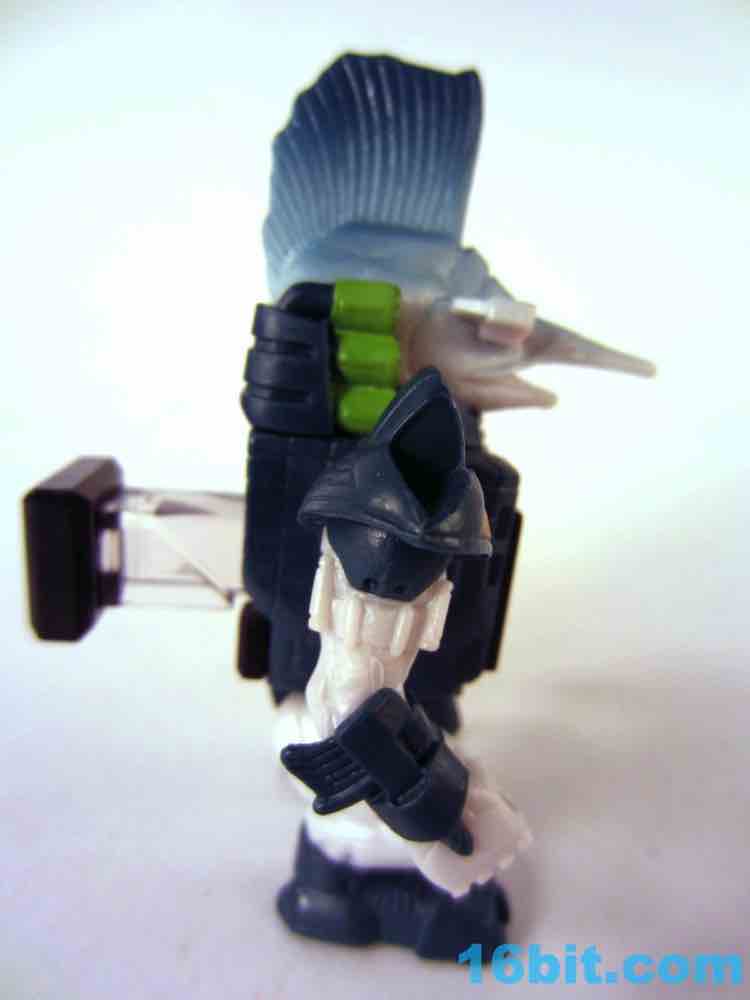 Swordbill's sculpt exceeds the budget for this toy, as there are numerous scultped straps on his arms and armor on his legs which sadly go unpainted. This one looks great, but more paint would make it look even better. He has no problems moving his arms or legs, and the painted green lights (or rockets) on the sides of his head should deafen him pretty quickly in the heat of battle. A splash of green on each shoulder helps to bring the figure to life, and also give him a different feel from his translucent, blind-boxed cousin.