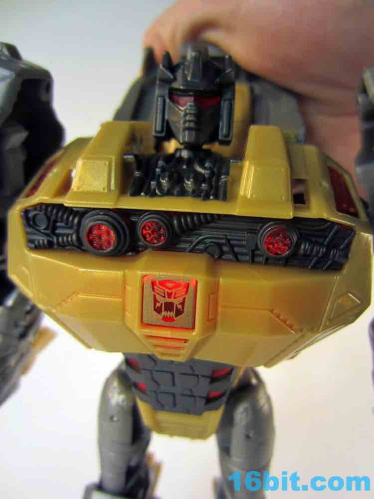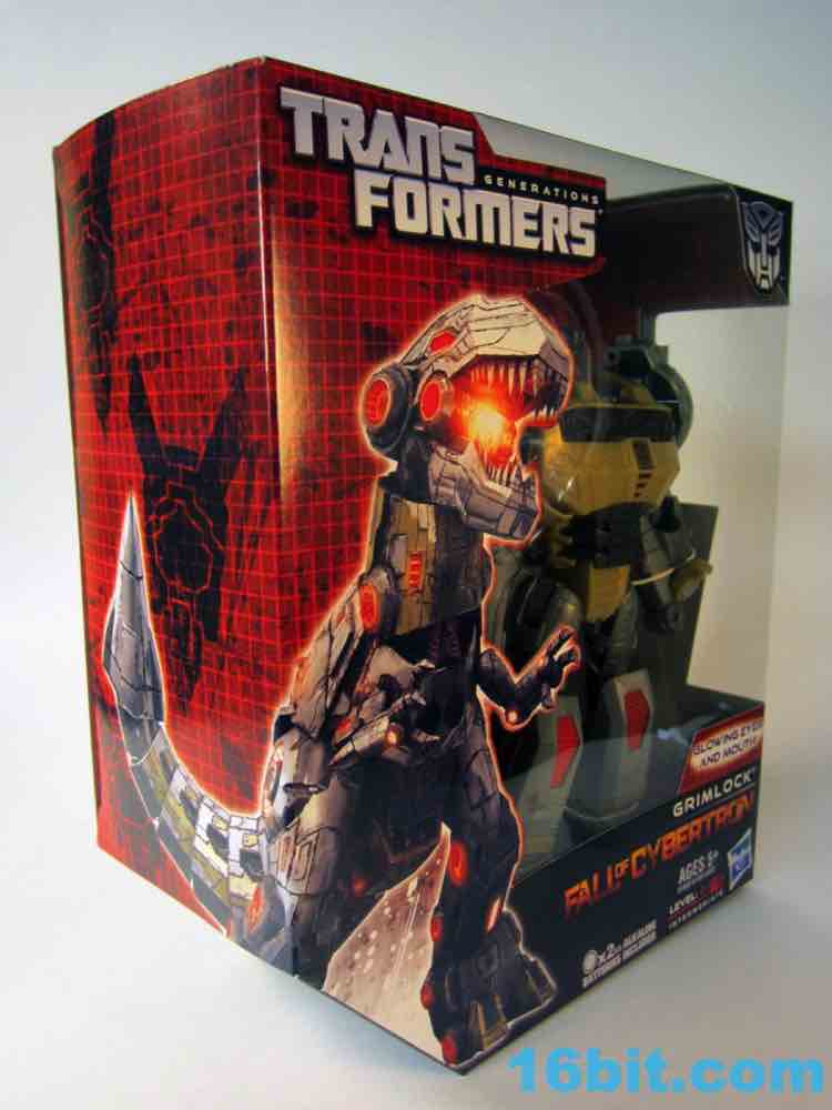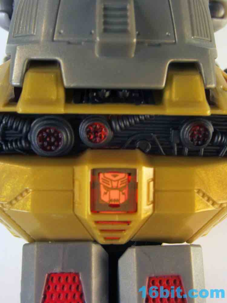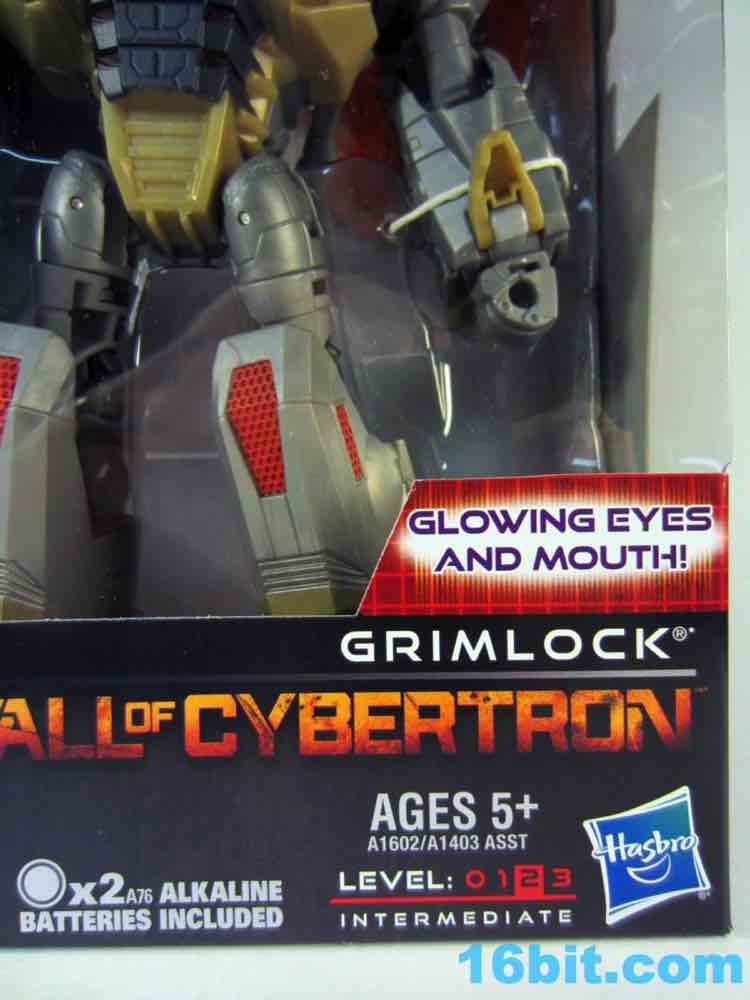 Standing over 7-inches tall, Grimlock's robot mode is pretty good. A recent interview mentioned that Hasbro generally starts with the alternate mode and works back. His robot legs form the dinosaur tail, and that's just not ideal. The figure has about 17 meaningful points of articulation and perfectly good detail. The plastic feels lighter and more airy, similar to the swell Beast Hunters Voyager-class Optimus Prime toy in that it's generally more hollow than his siblings. 2013 Springer and Blaster have a more glossy, chunky, and satisfying essence but only Grimlock is Grimlock. He also sports a nifty and (so far) unique to his toy insignia which lights up. Hasbro actually put a red LED in this one, allowing his robot mode to light up or the din mode to "breathe fire." It's a cheap but delightful gimmick.