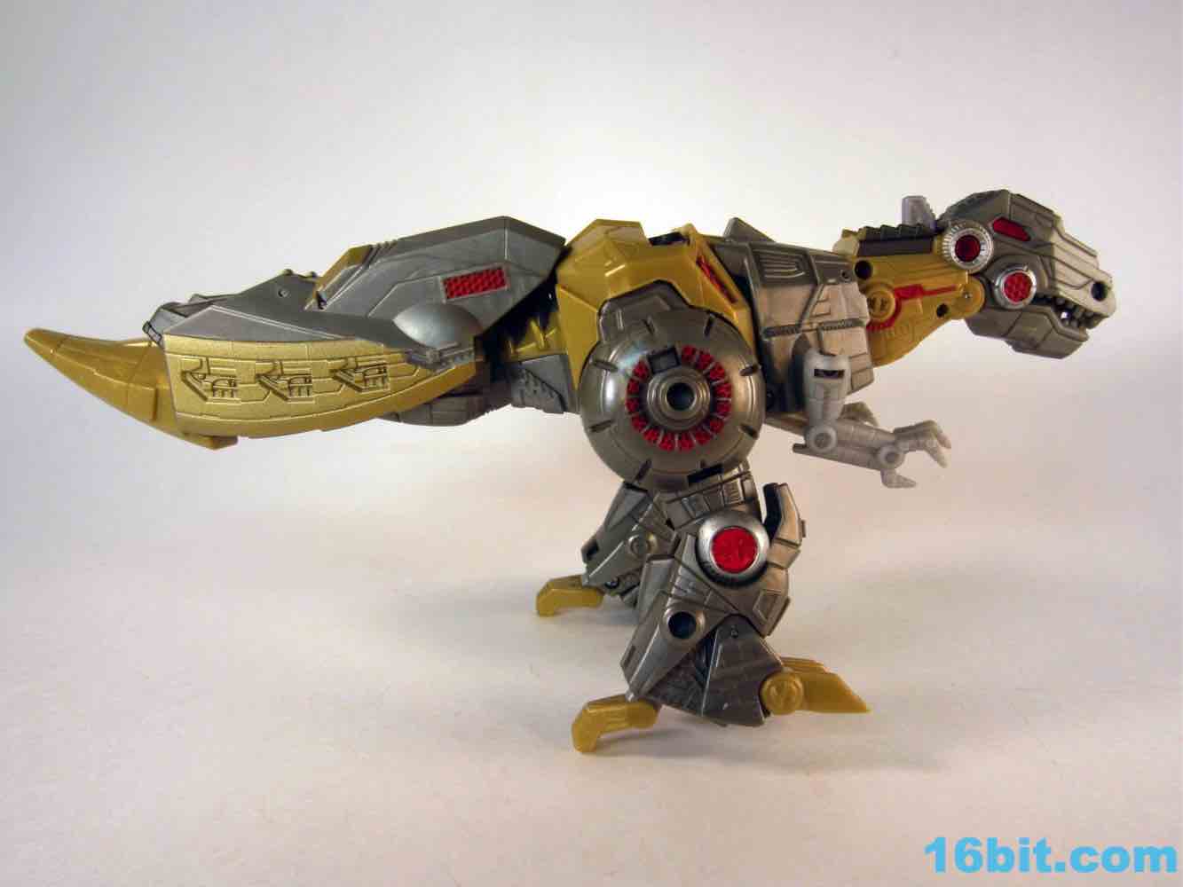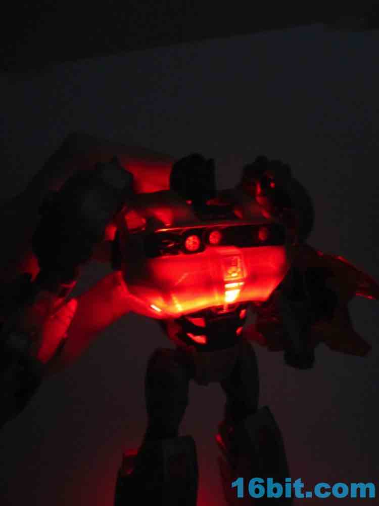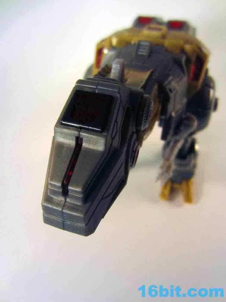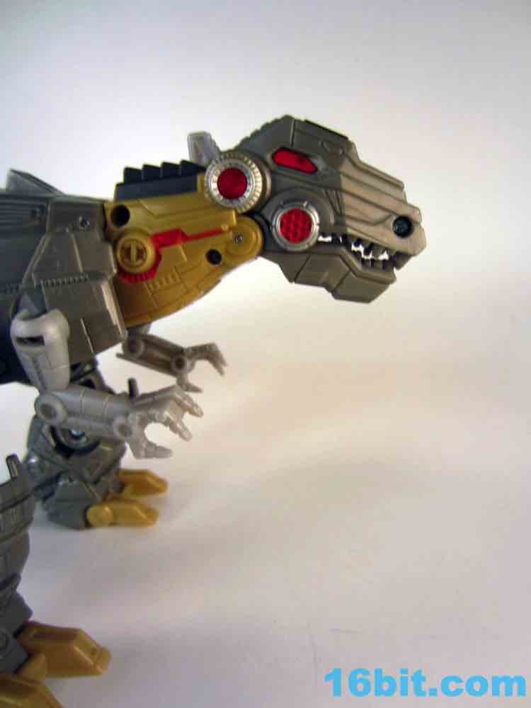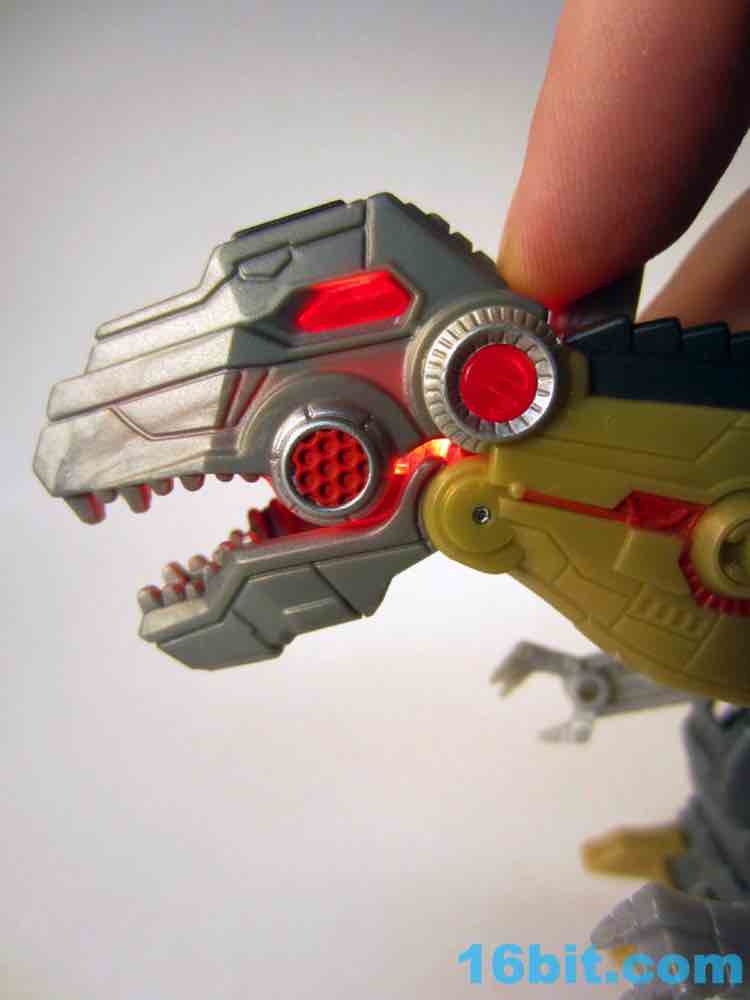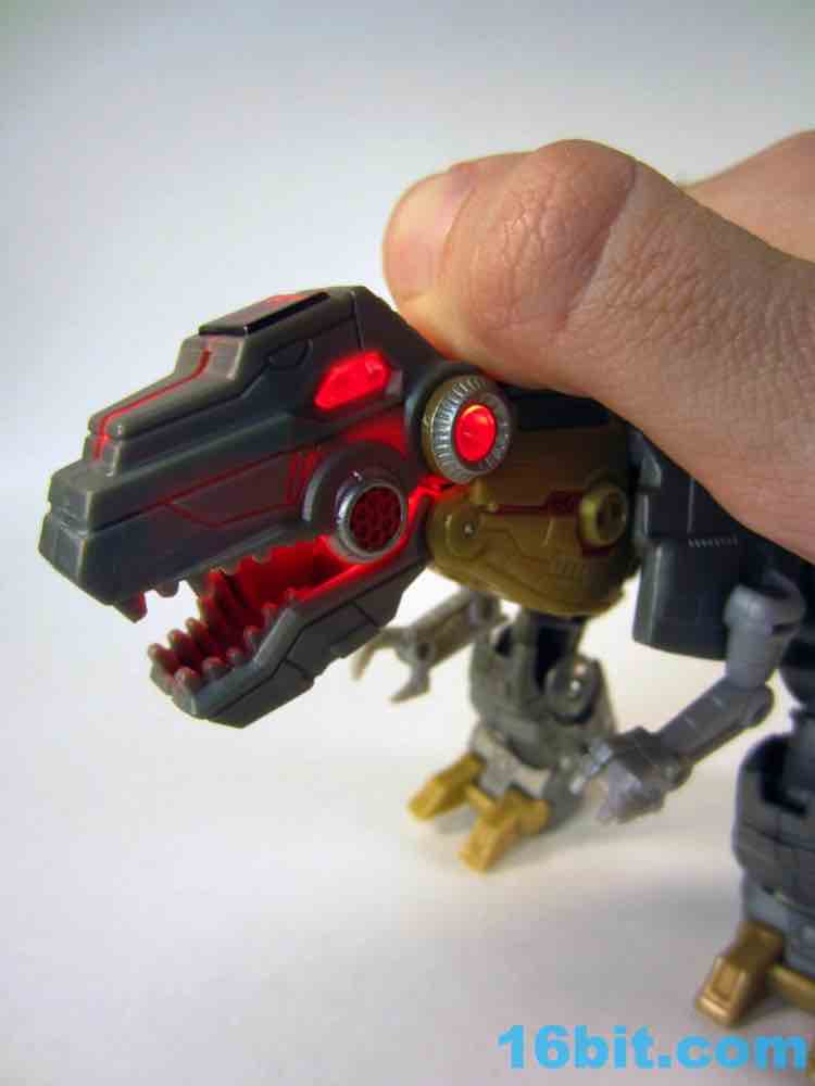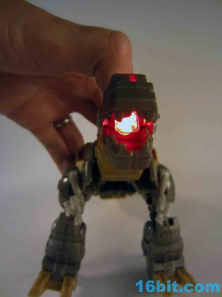 Speaking purely on a matter of opinion, I do not like his dinosaur mode much. The robot legs hang off the butt, the head is ugly, and if it weren't for the fire-breathing light I'd say it was pretty much worth never transforming. The light-up symbol on the top of his head was inspired, and the LED works very well. Once you get him into this mode, though, there's not much else to do. Slap a shield on his thigh and have him menace your other figures with his chomping jaw, and that's something at least.