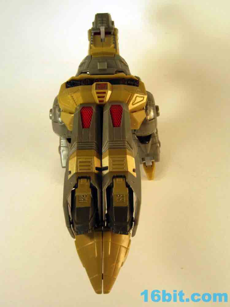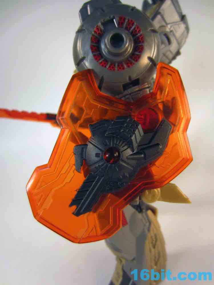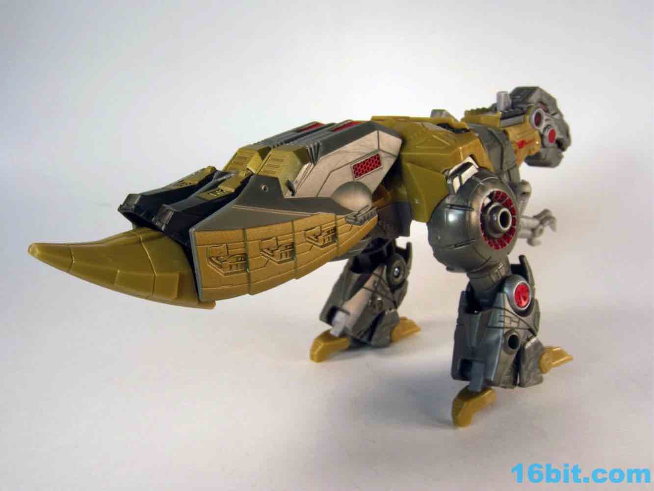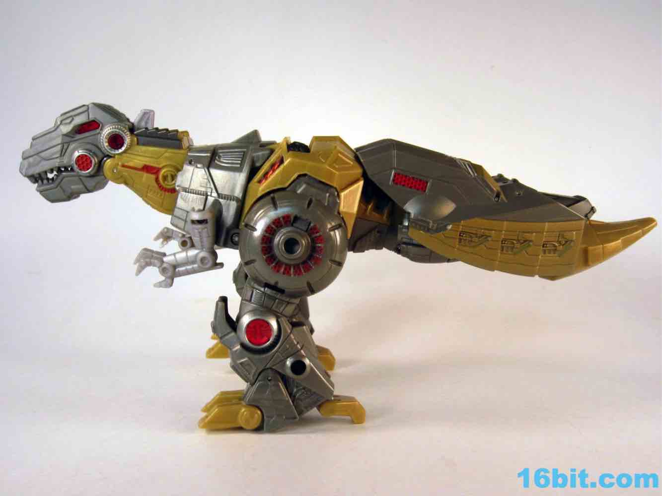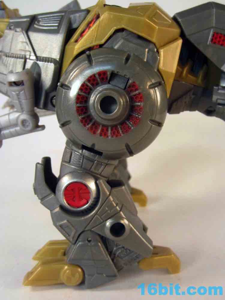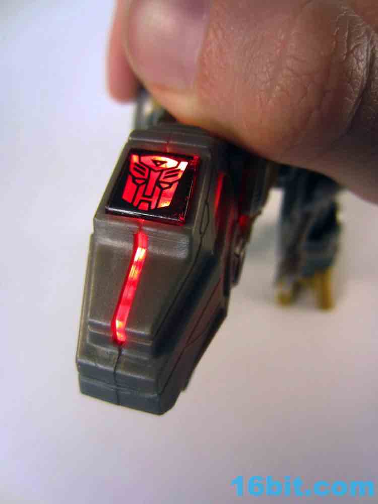 Speaking purely on a matter of opinion, I do not like his dinosaur mode much. The robot legs hang off the butt, the head is ugly, and if it weren't for the fire-breathing light I'd say it was pretty much worth never transforming. The light-up symbol on the top of his head was inspired, and the LED works very well. Once you get him into this mode, though, there's not much else to do. Slap a shield on his thigh and have him menace your other figures with his chomping jaw, and that's something at least.
