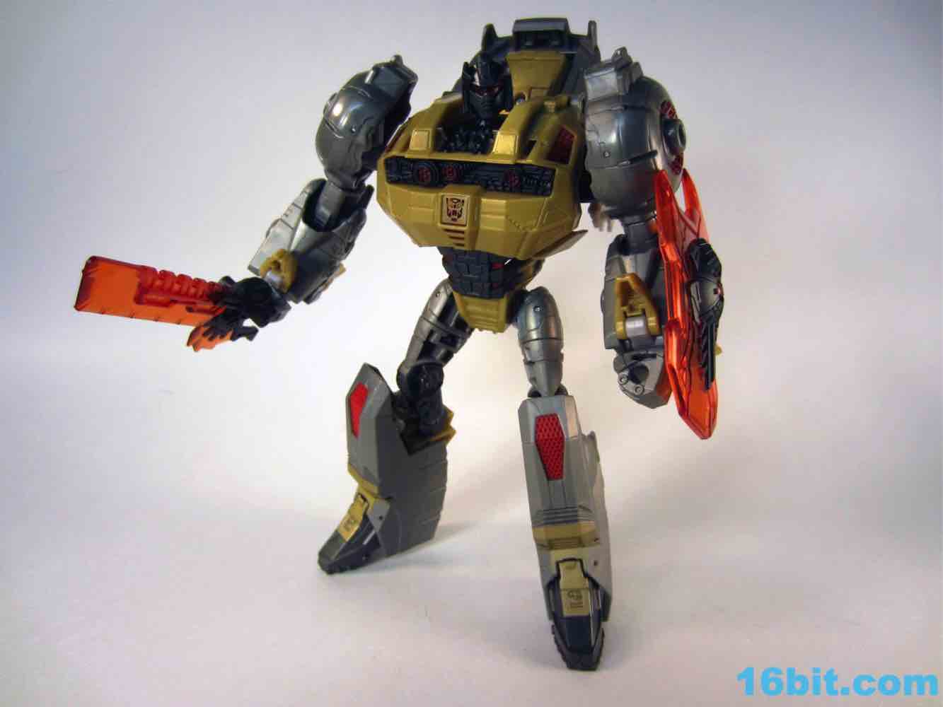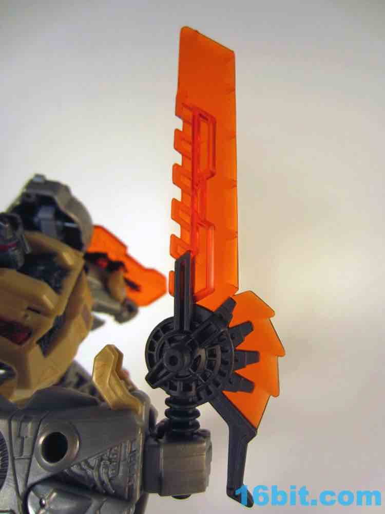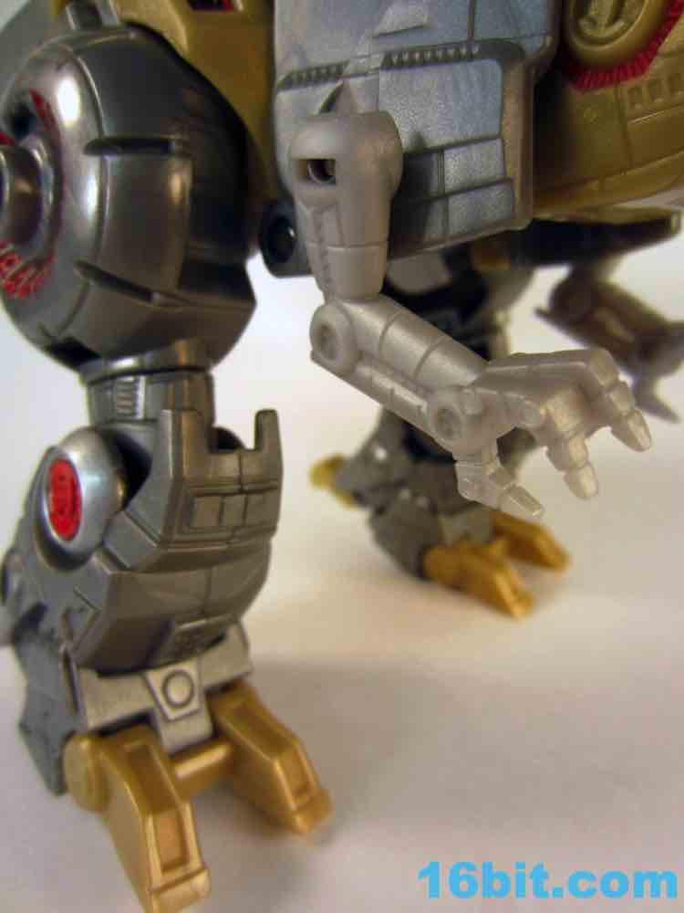 Accessories are more abundant than necessary, and I wish they put more money into the actual figure. The sword is a fairly awesome accessory cast in clear plastic with 5mm hardpoints to connect it to the figure in either mode, while the shield, made from the same material, is largely superfluous. It hangs off his side in the dinosaur mode, and it hangs off his arm as a robot. It feels like it's just there to either a) add value or b) get in the way, neither of which is necessary. Grimlock's Grimlockness will sell Grimlock, and putting an extra fifty cents into the robot mode's shoulders or plastic would probably make a significant difference.