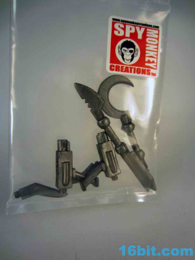 Item No.: ??? Manufacturer:Spy Monkey Creations Includes:Guns, swords, sickles, and more Action Feature:Glyos and Masters of the Universe Classics compatible Retail:$3.00 Availability: October 1, 2012 Other: Silver! Entirely.