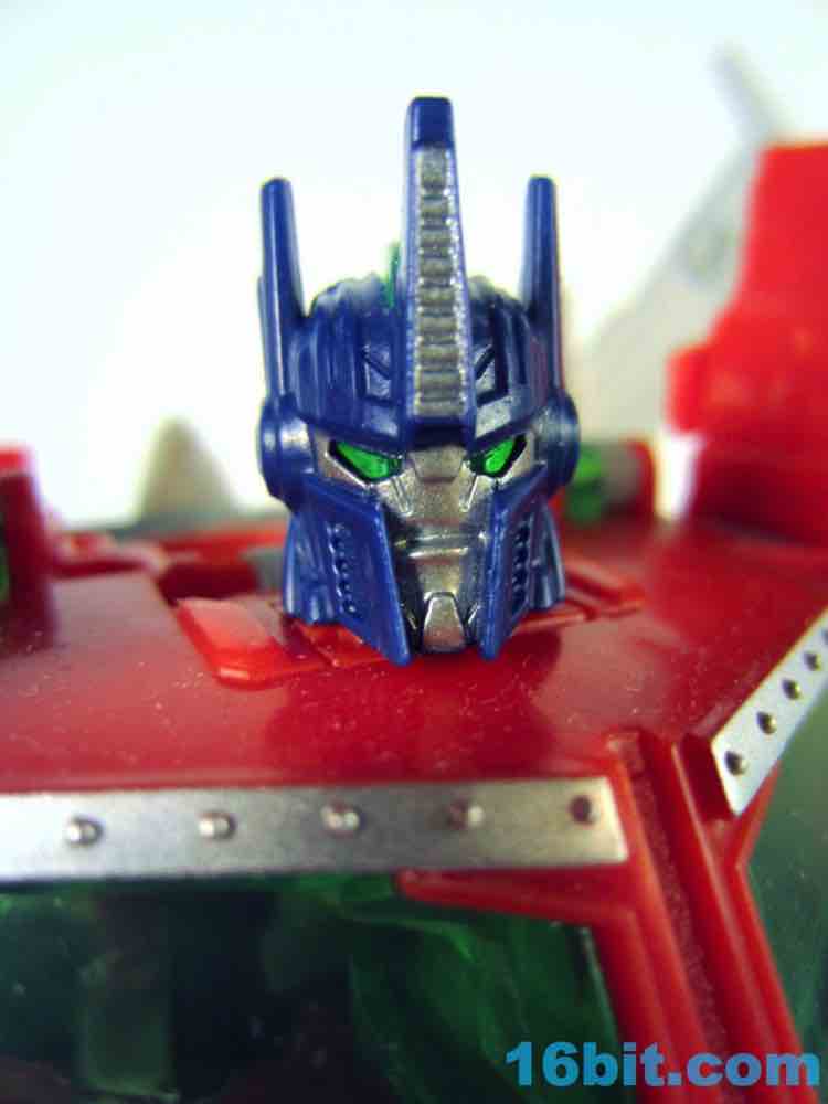 At over 7-inches high, Optimus Prime's robot mode is a pretty swell pastiche of previous toy designs with some new elements mixed in. He's more of a monstrous truck-o-bot, with jagged shoulders, a new green Star Saber, a God Bomber-esque jetpack, and twin firing cannons which can convert into crossbows. By and large he holds together well, but the tabs keeping the grey shoulders on the red torso don't seem to fit perfectly on my sample - sometimes they migrate off their mounts. Still, his unique torso reminds me a lot of Star Convoy and the face is just amazing. He's got an angry sneer! He's big and chunky, bright and colorful, and has tons of moving parts. How often does Optimus get a jetpack, anyway?